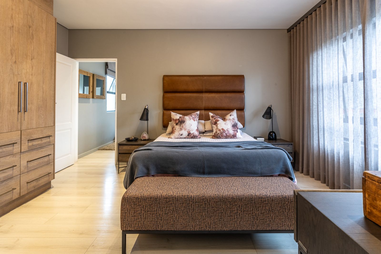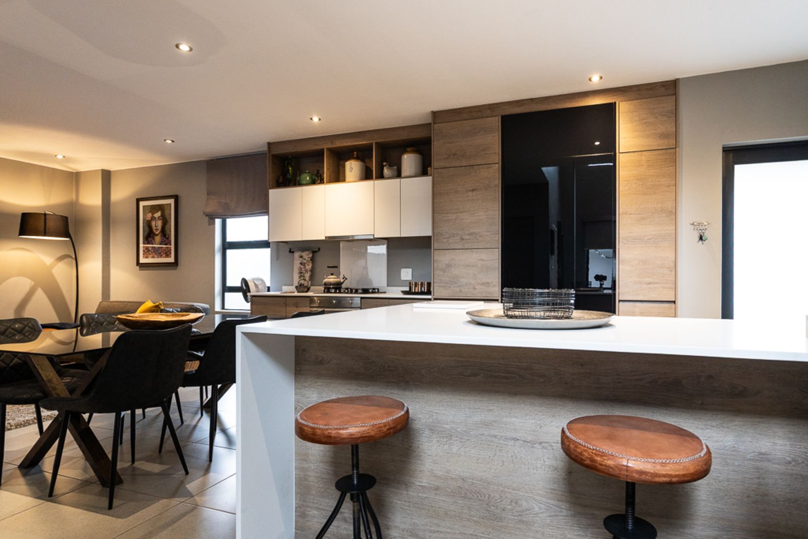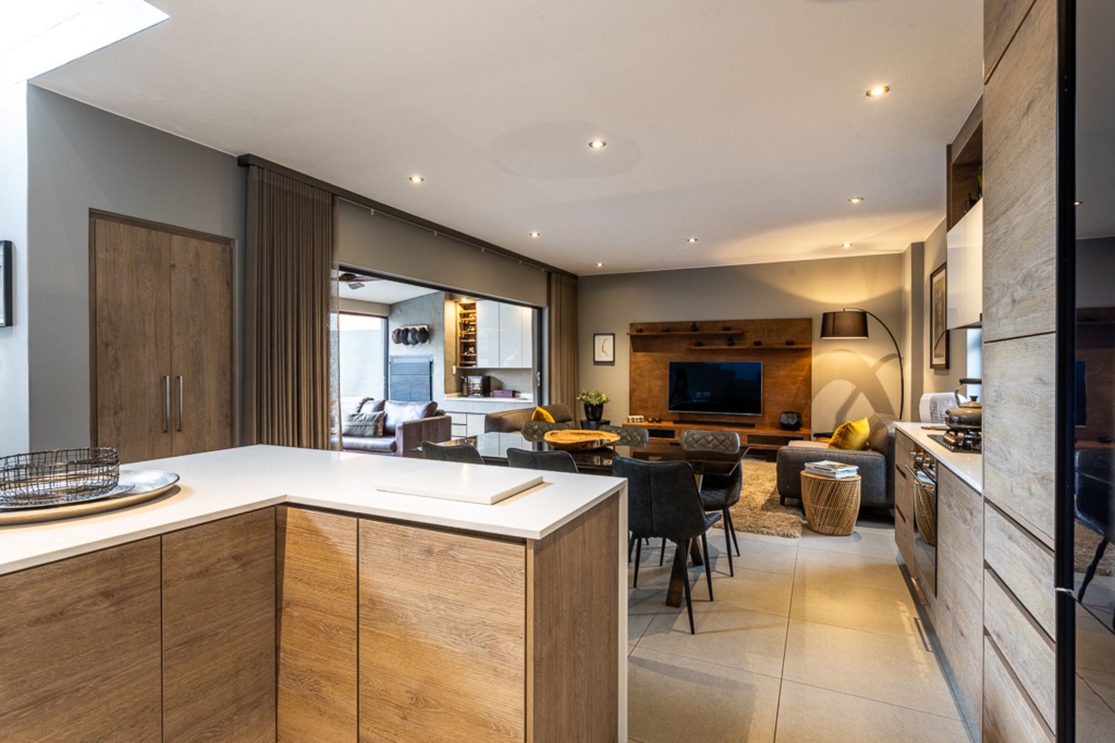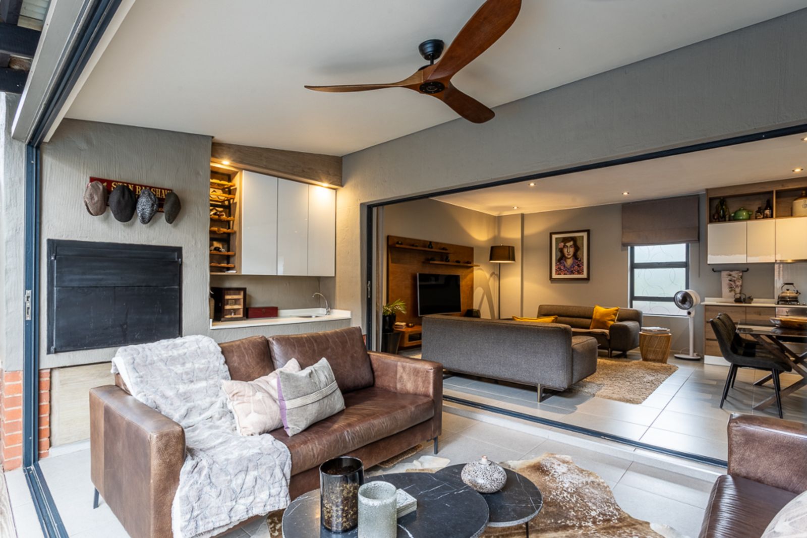 French doors open onto a covered entertainment patio, complete with a built-in braai, extra cupboards, and views of the private pool fitted with a heat pump—perfect for year-round enjoyment. Sophisticated details such as tiled window sills and a well-appointed pyjama lounge add a touch of elegance throughout.