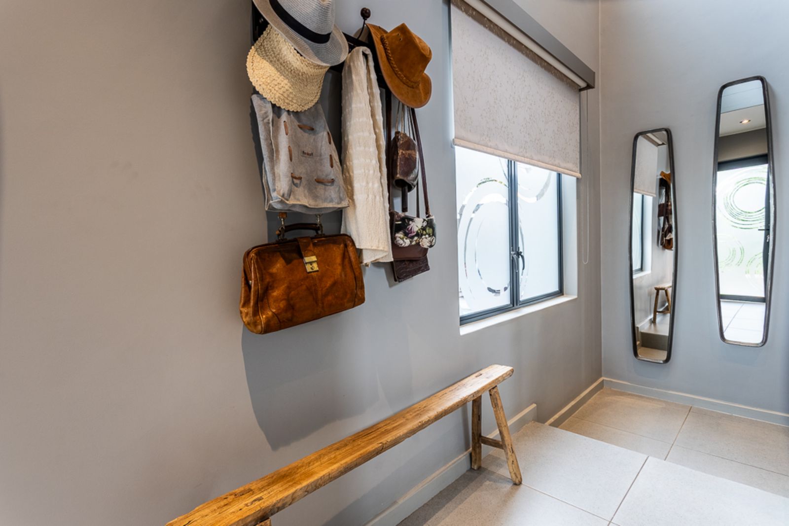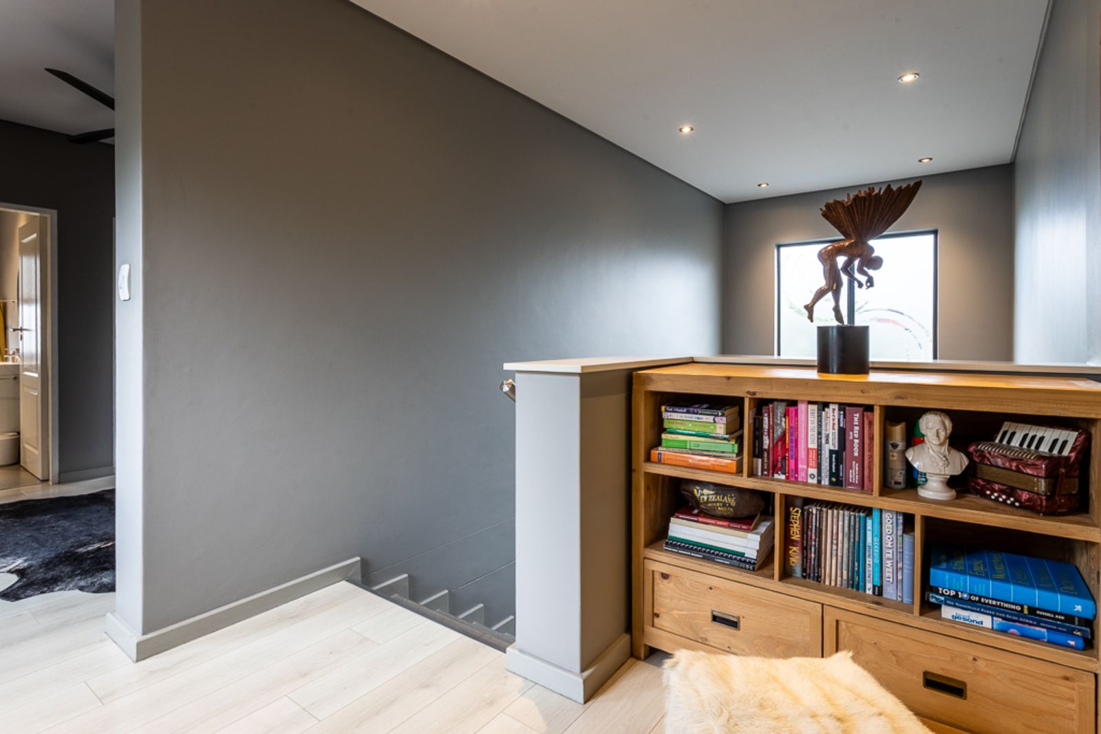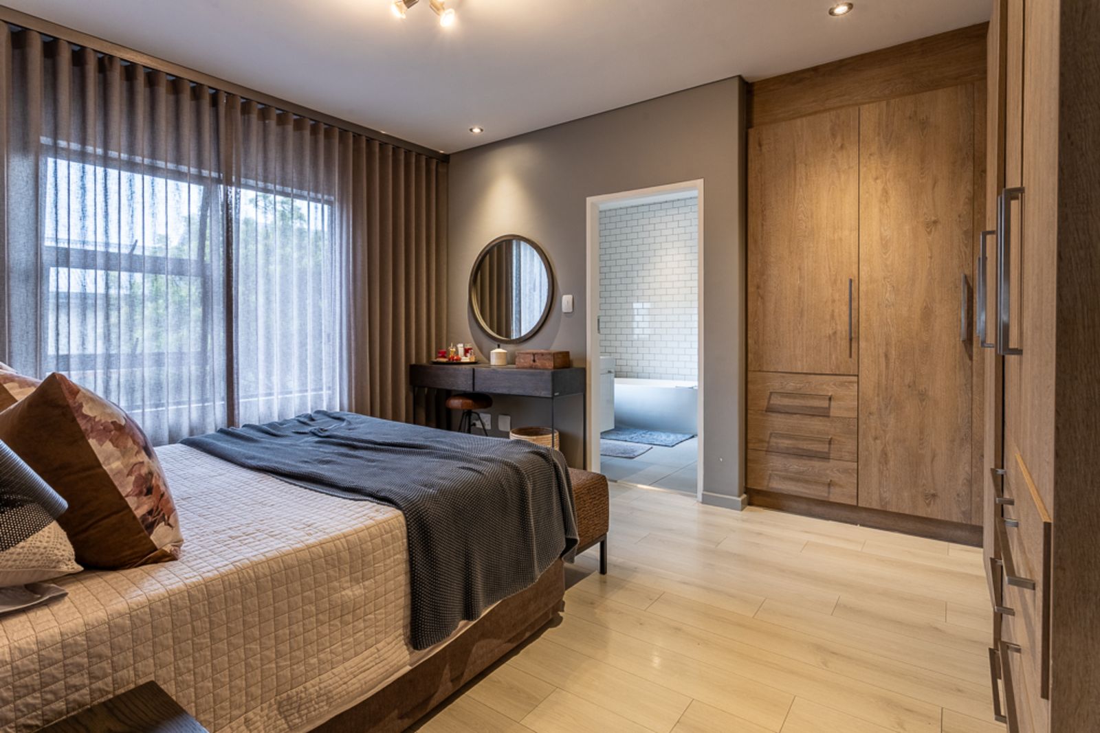 French doors open onto a covered entertainment patio, complete with a built-in braai, extra cupboards, and views of the private pool fitted with a heat pump—perfect for year-round enjoyment. Sophisticated details such as tiled window sills and a well-appointed pyjama lounge add a touch of elegance throughout.