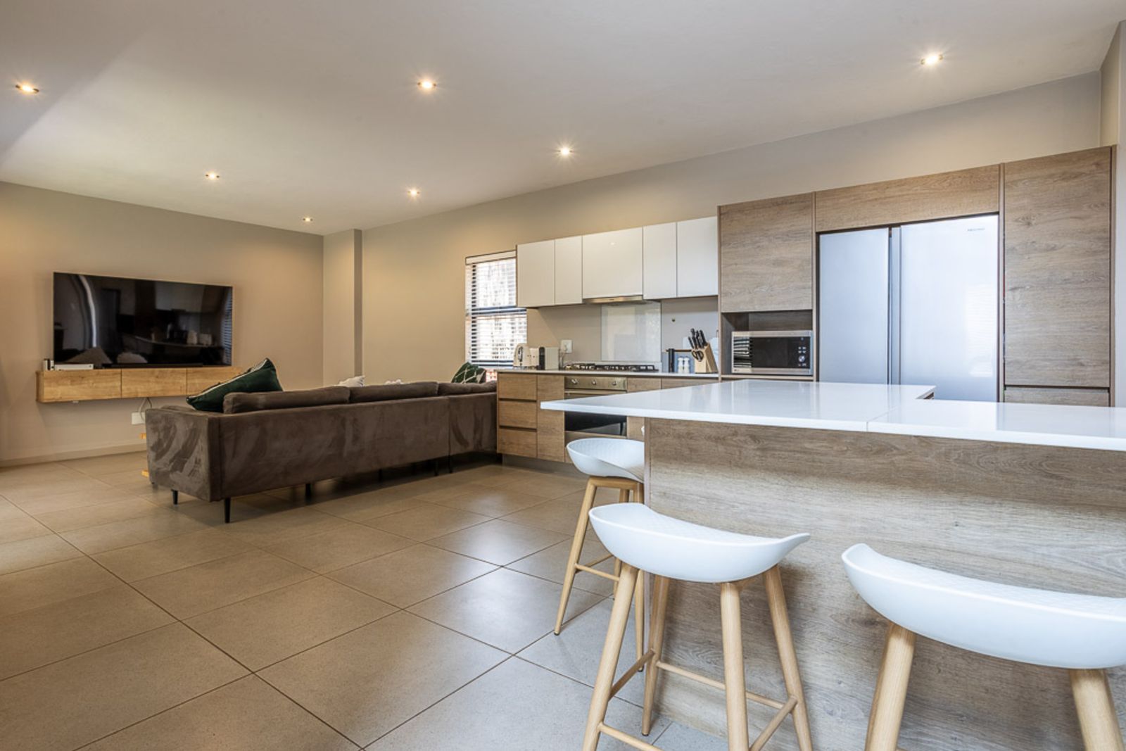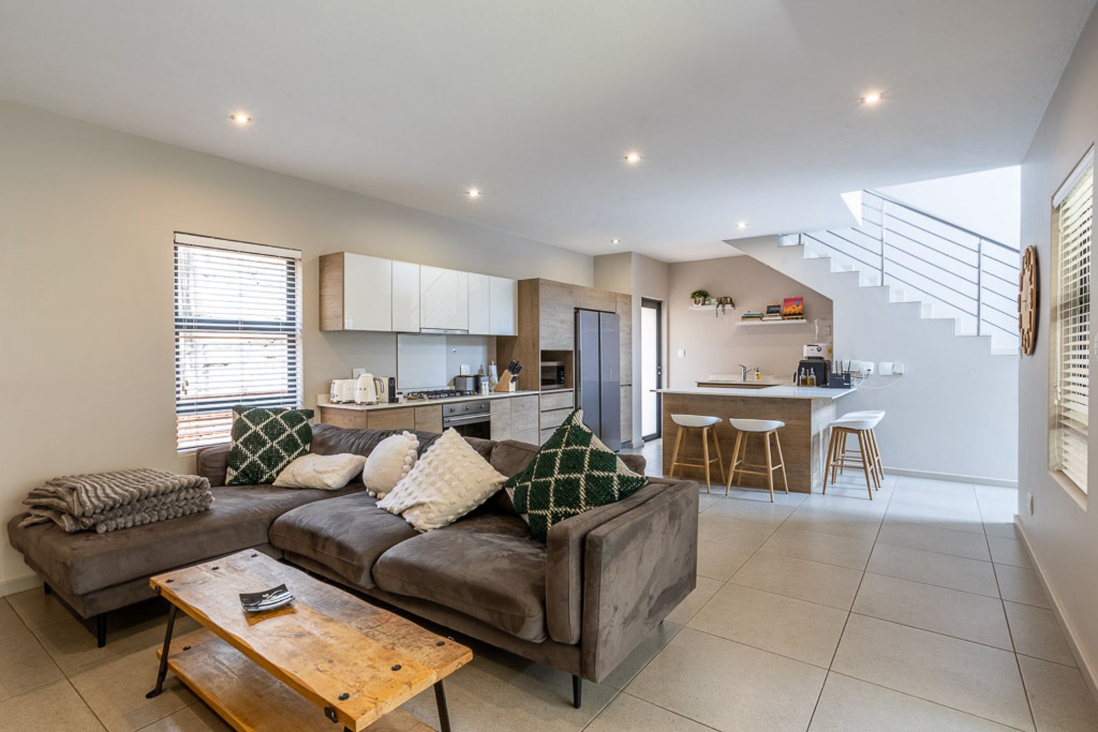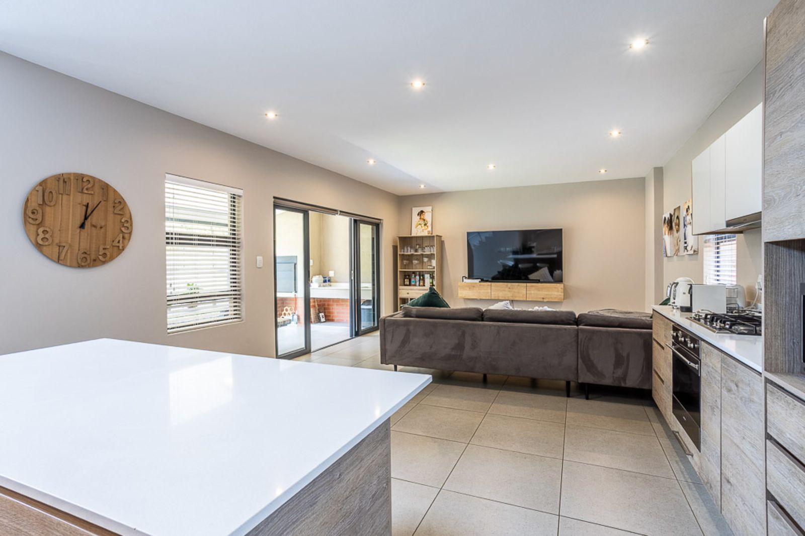 The open-plan living and dining area is bright and inviting, with a ceiling fan for comfort. The modern kitchen features Caesarstone countertops, a gas hob, a sleek backsplash, and a breakfast nook for casual meals. Sliding doors lead to a covered entertainment patio with a built-in braai — a perfect spot to relax or entertain. A cosy pyjama lounge adds extra comfort to the home.