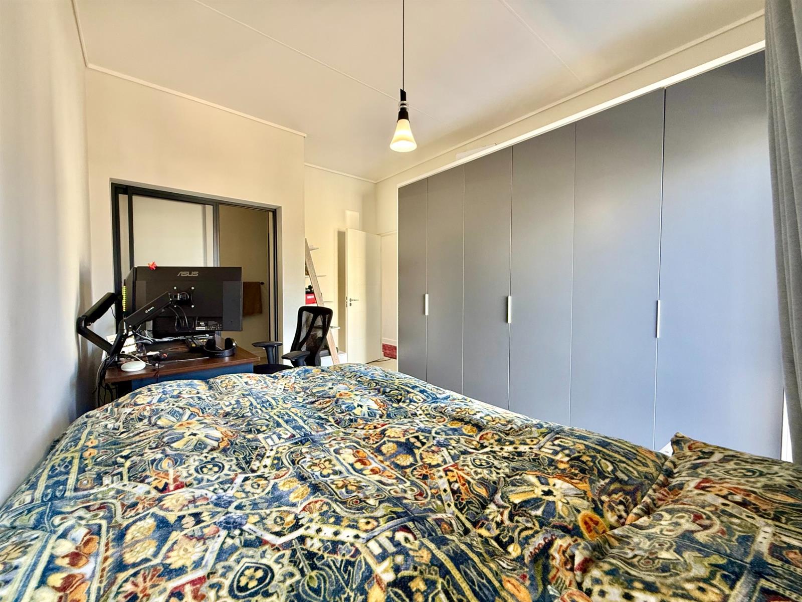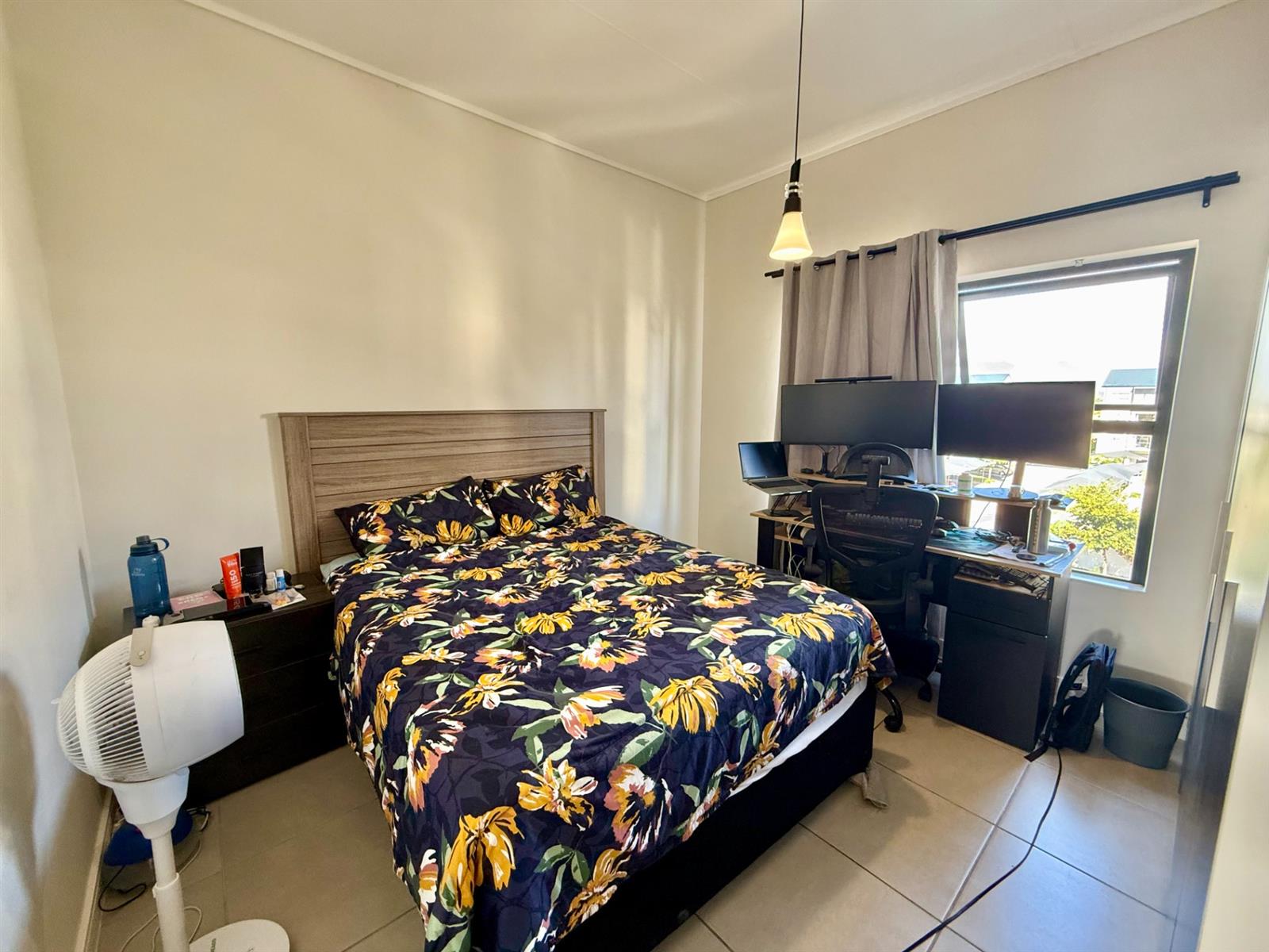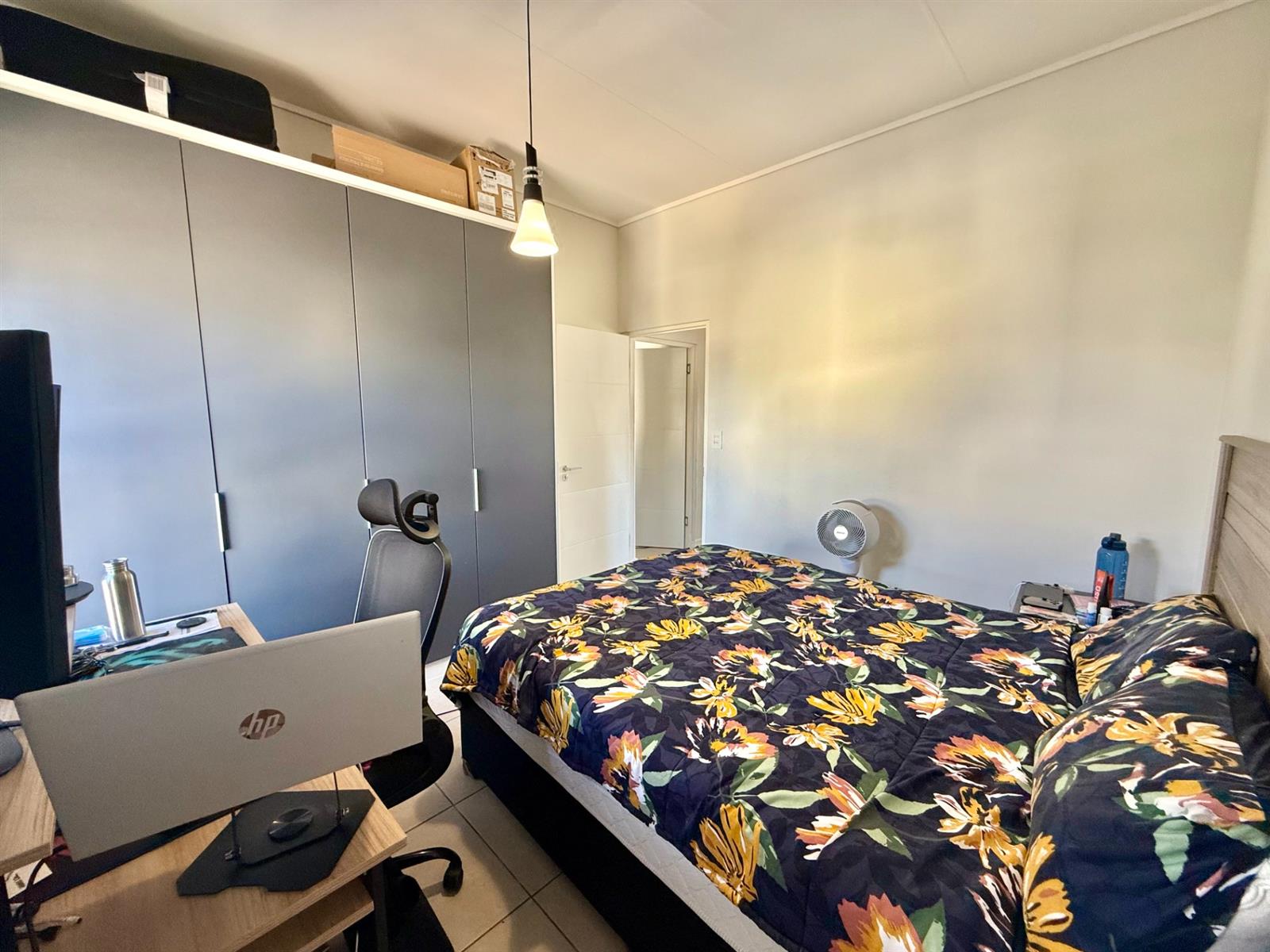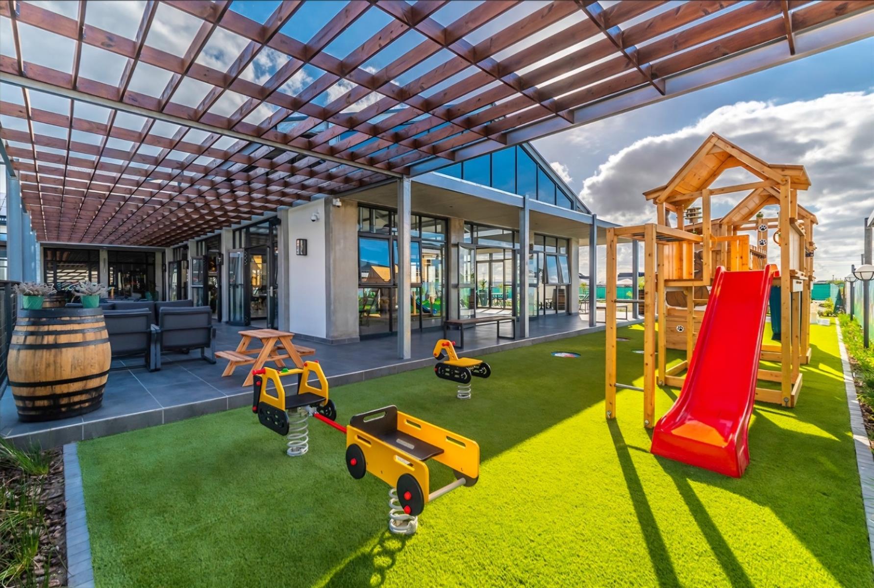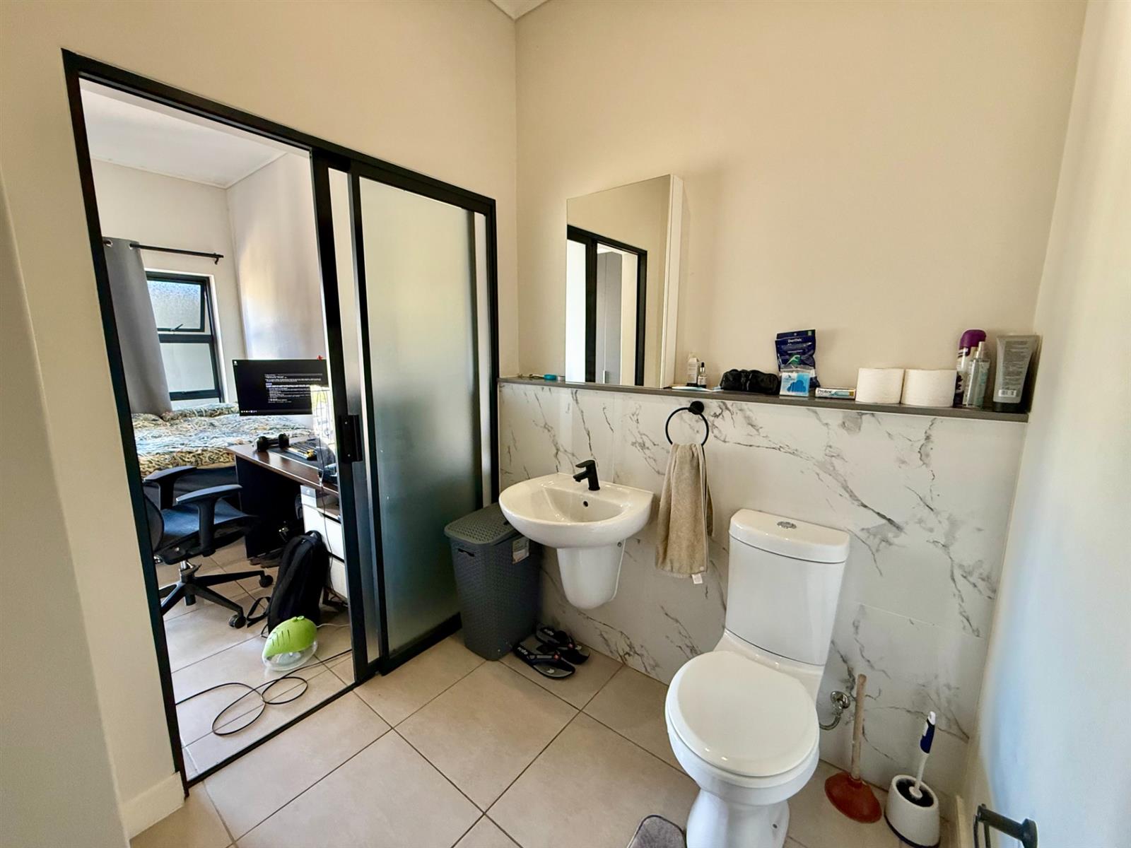 The open-plan living area flows seamlessly into a sleek kitchen with Defy appliances, including a dishwasher, washing machine, fridge, and gas stove conversion. Enjoy your private built-in braai area, perfect for entertaining.