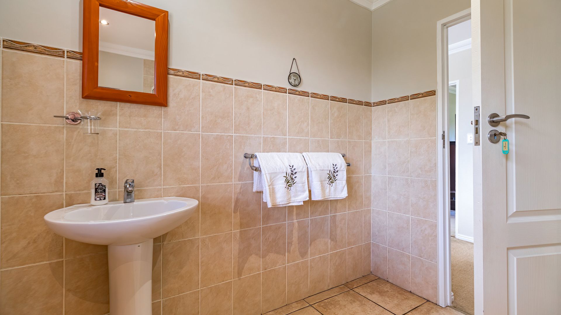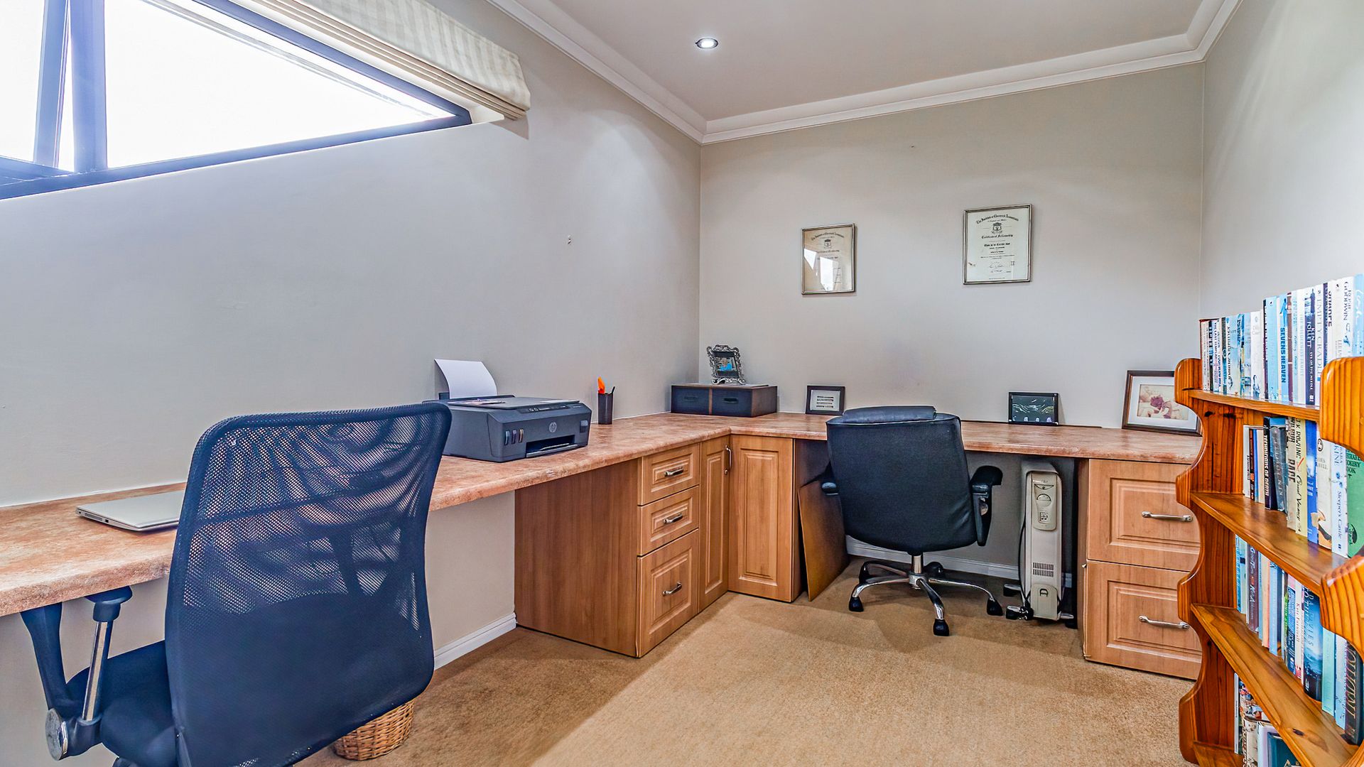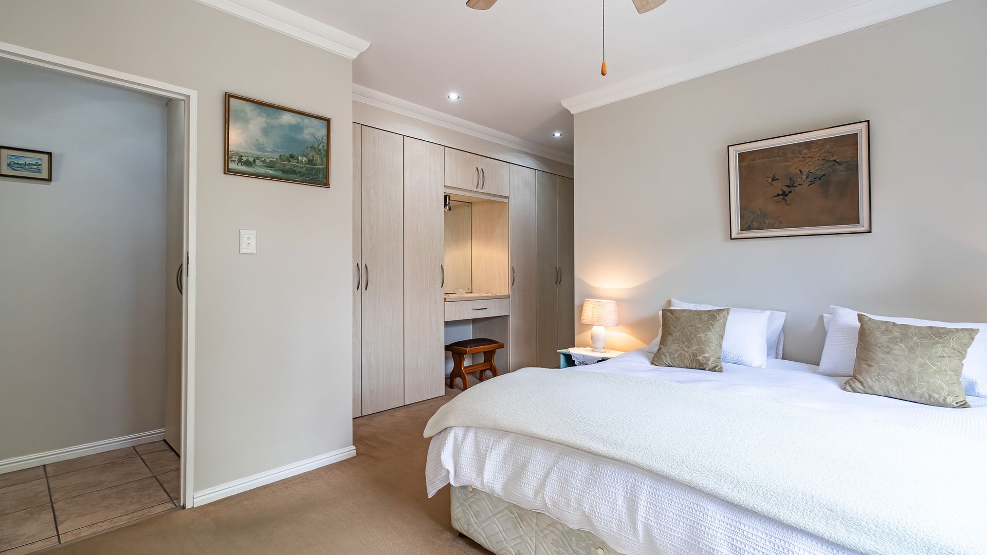 Upstairs, an easy-stride staircase leads to a cozy pajama/TV lounge and separate study, along with two en-suite bedrooms. The private and plush king-size master suite includes a walk-through dressing room and full en-suite bathroom with corner bath. All bedrooms offer generous built-in cupboards. All bedrooms including study and TV lounge are comfortably carpeted, while public areas downstairs are tiled.