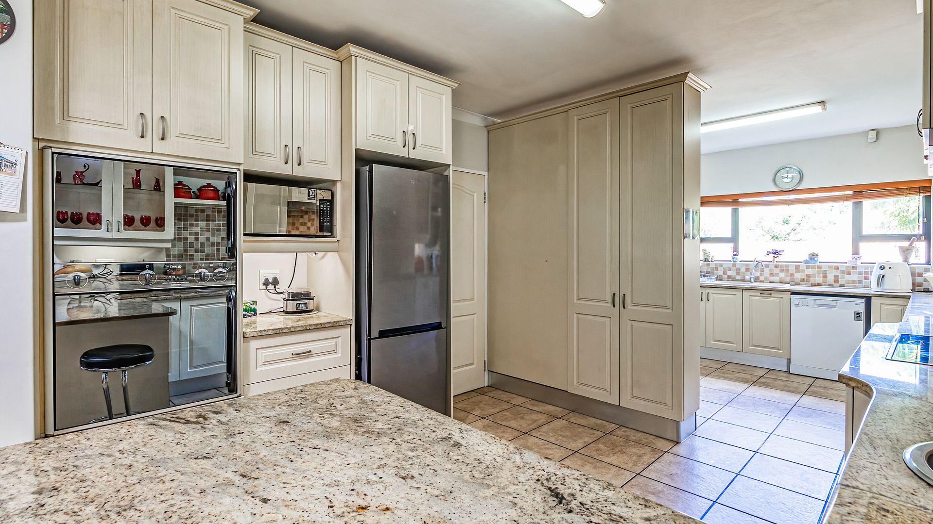 The interior is light and bright throughout, with large picture windows in every room. Downstairs features an open-plan lounge, dining area, and kitchen with granite countertops, ample storage, and a walk-in pantry. A separate scullery accommodates all appliances, with direct access to the automated double garage, including plumbing for an additional washing machine. A pub area leads off the living space, creating a relaxed entertainment flow. A guest toilet for ease of convenience for visiting friends.
