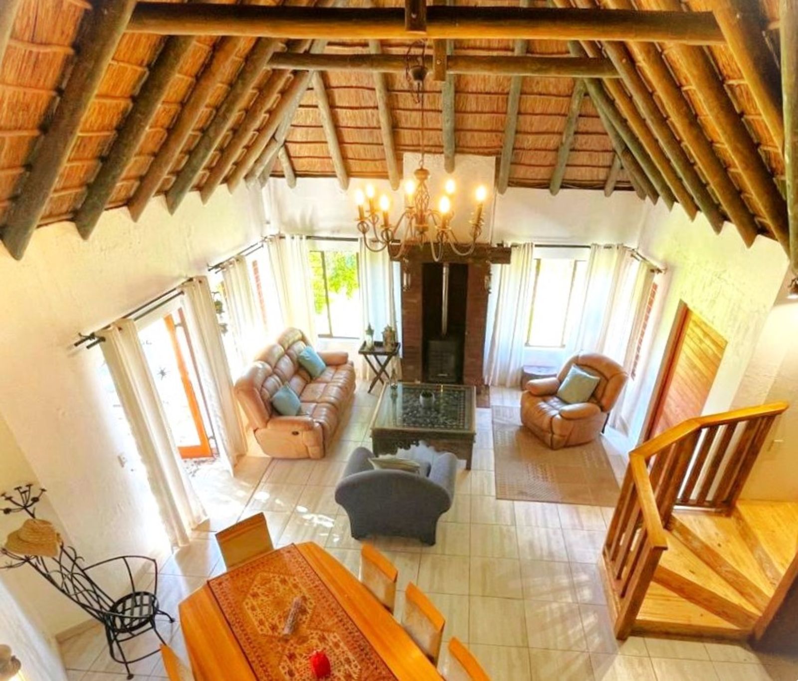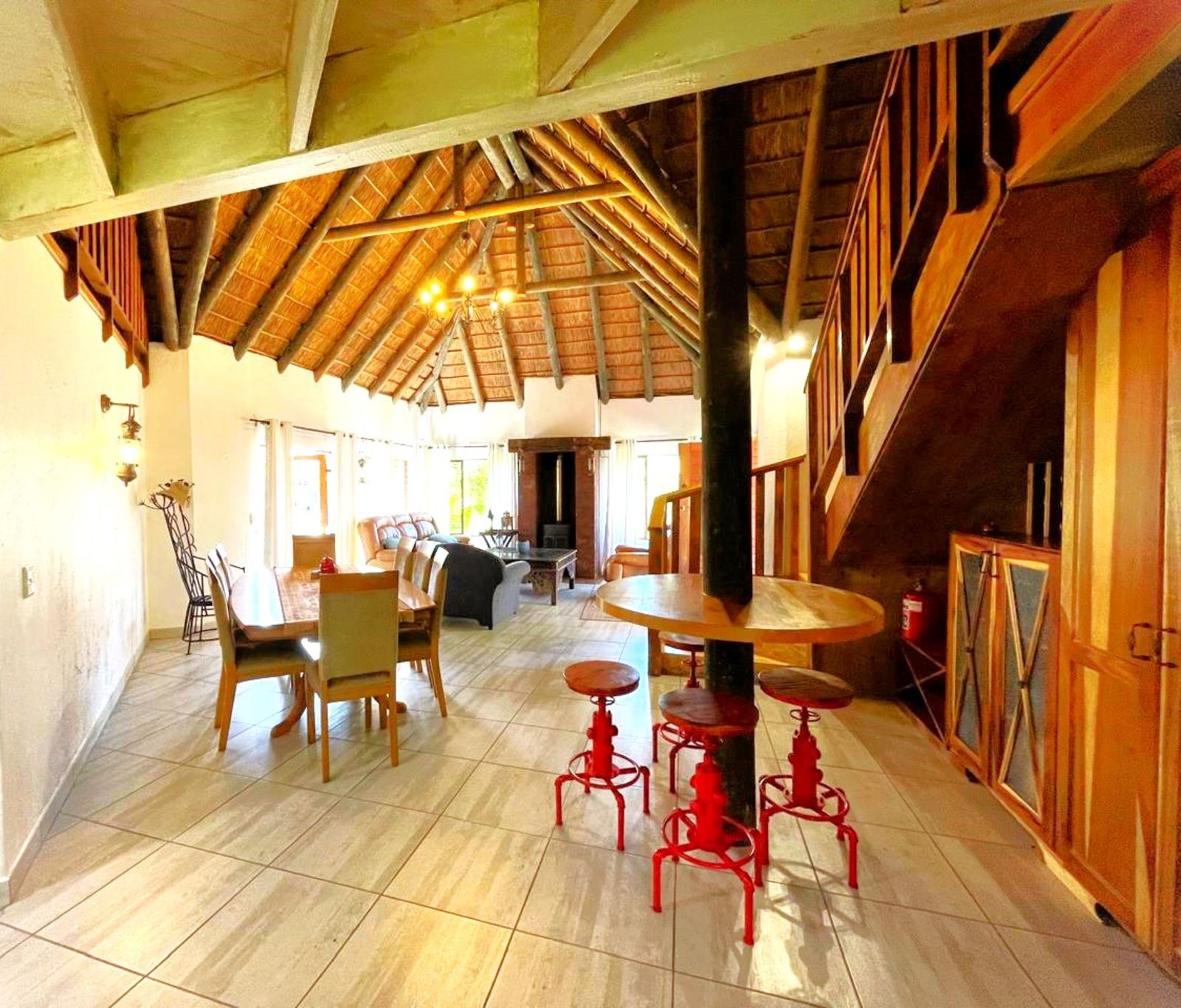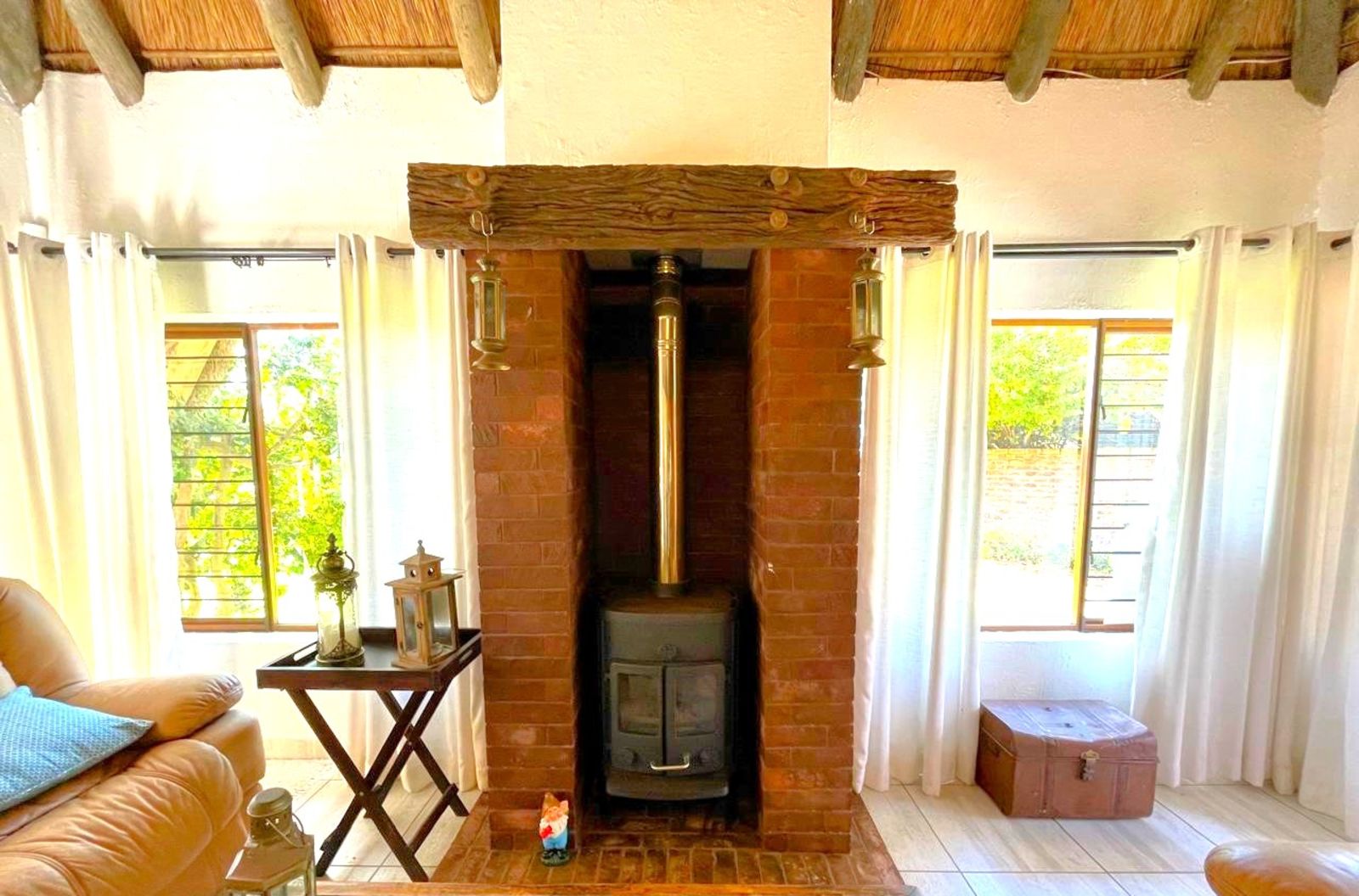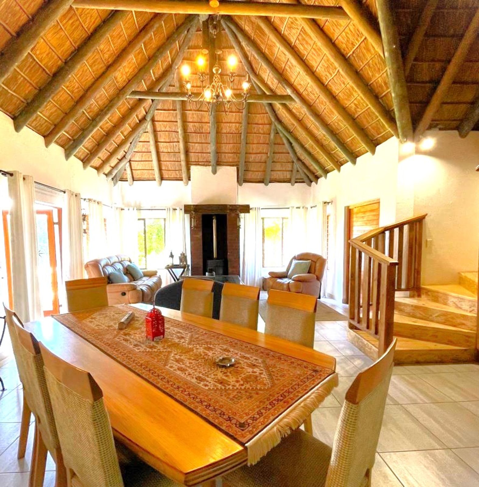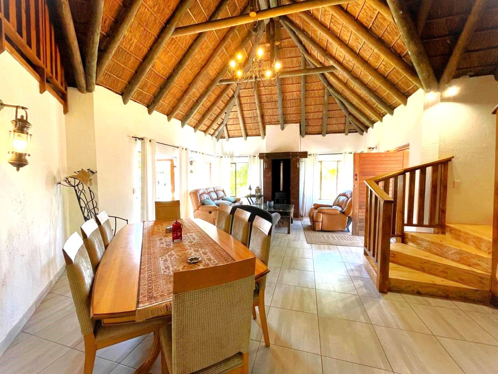 INSIDE, the feeling is Africa with a cosy fireplace for warmth in winter, while the thatch insulation ensures a cool and comfortable environment in the summer. This home is truly a welcoming retreat in a breathtaking natural setting whilst you enjoy all the modern amenities of town while still embracing the quiet peace of Africa.