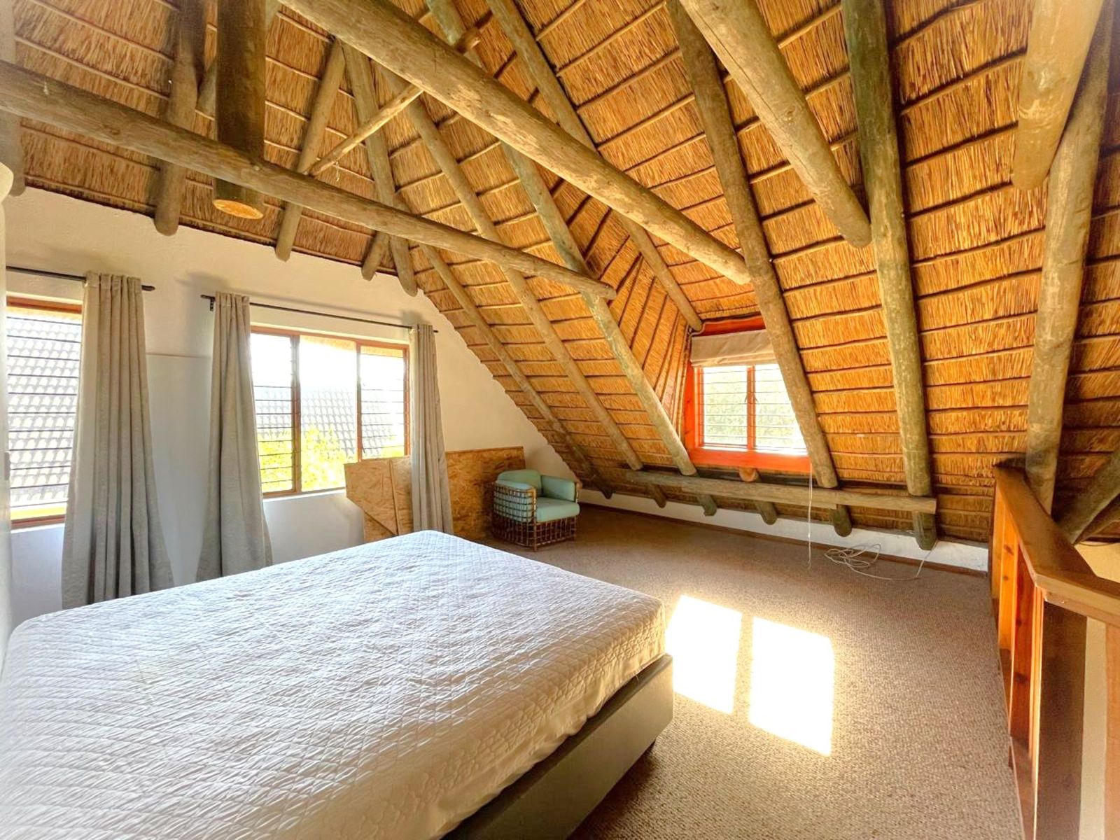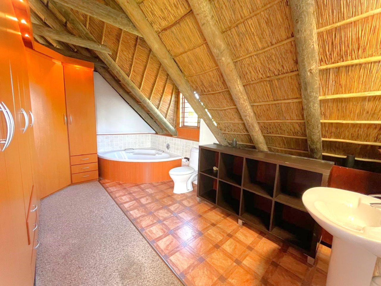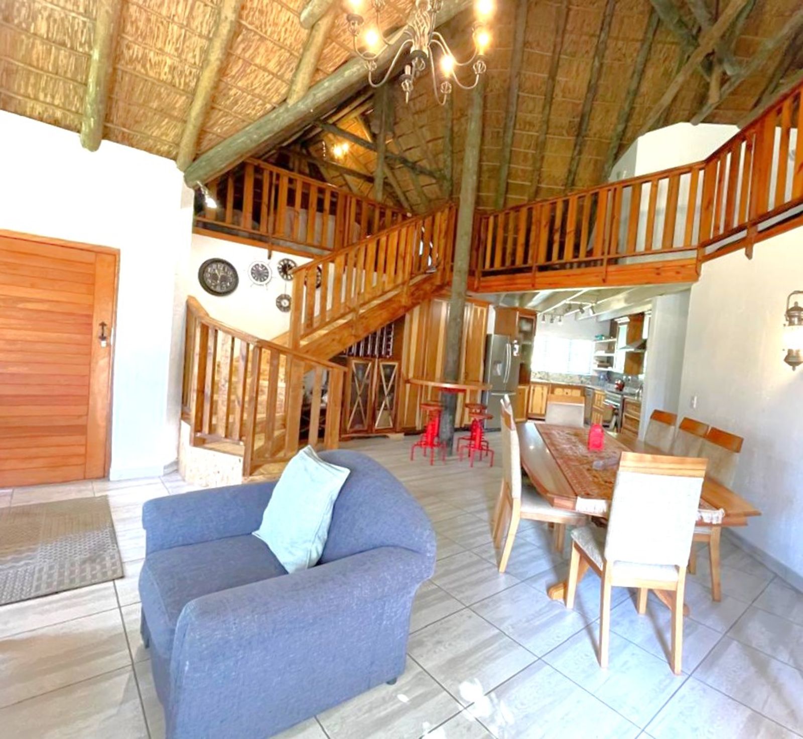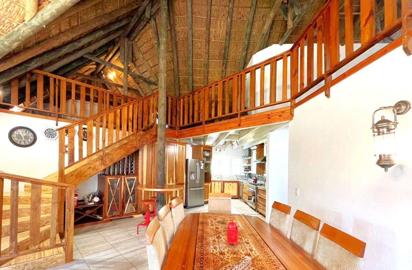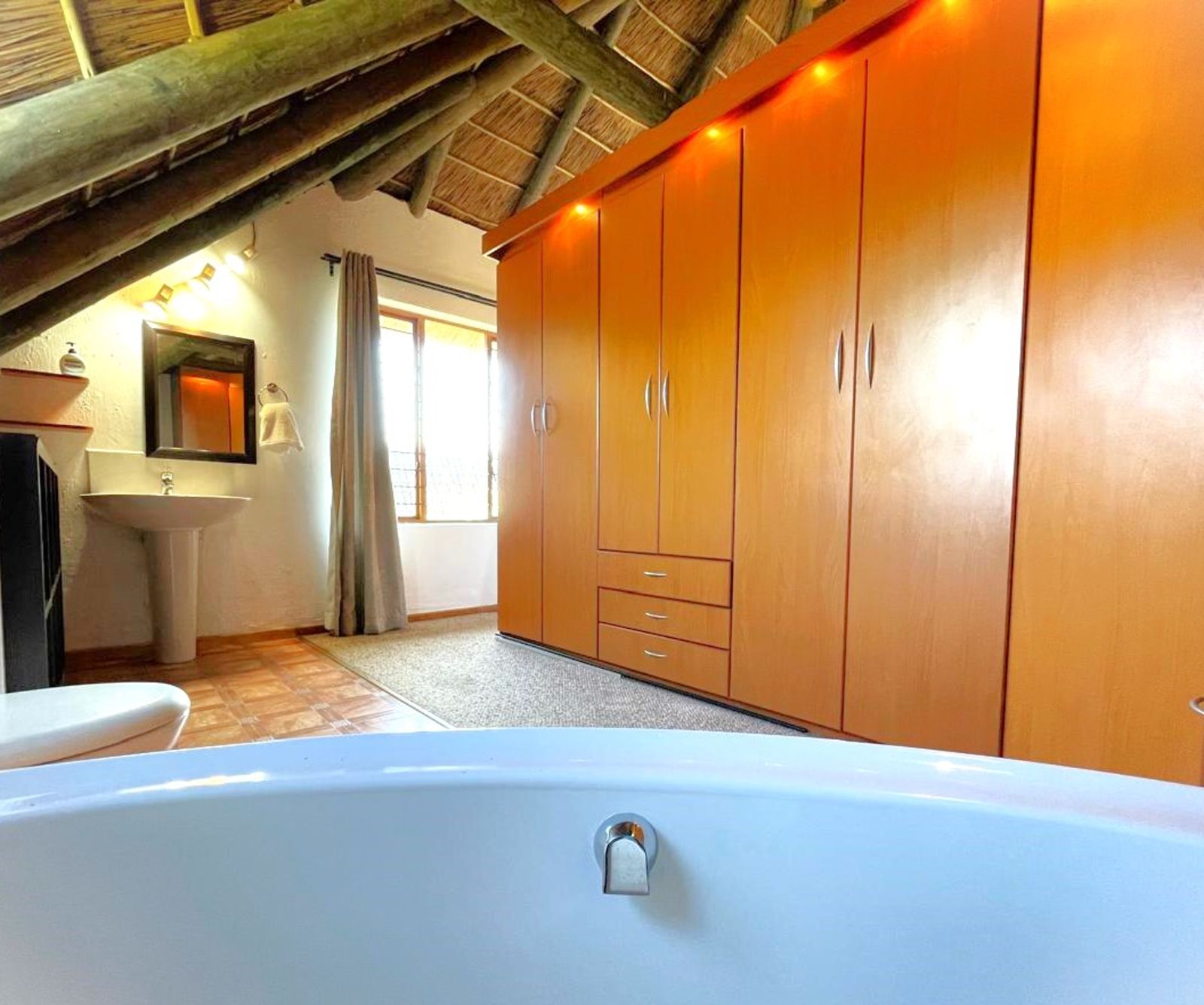 INSIDE, the feeling is Africa with a cosy fireplace for warmth in winter, while the thatch insulation ensures a cool and comfortable environment in the summer. This home is truly a welcoming retreat in a breathtaking natural setting whilst you enjoy all the modern amenities of town while still embracing the quiet peace of Africa.