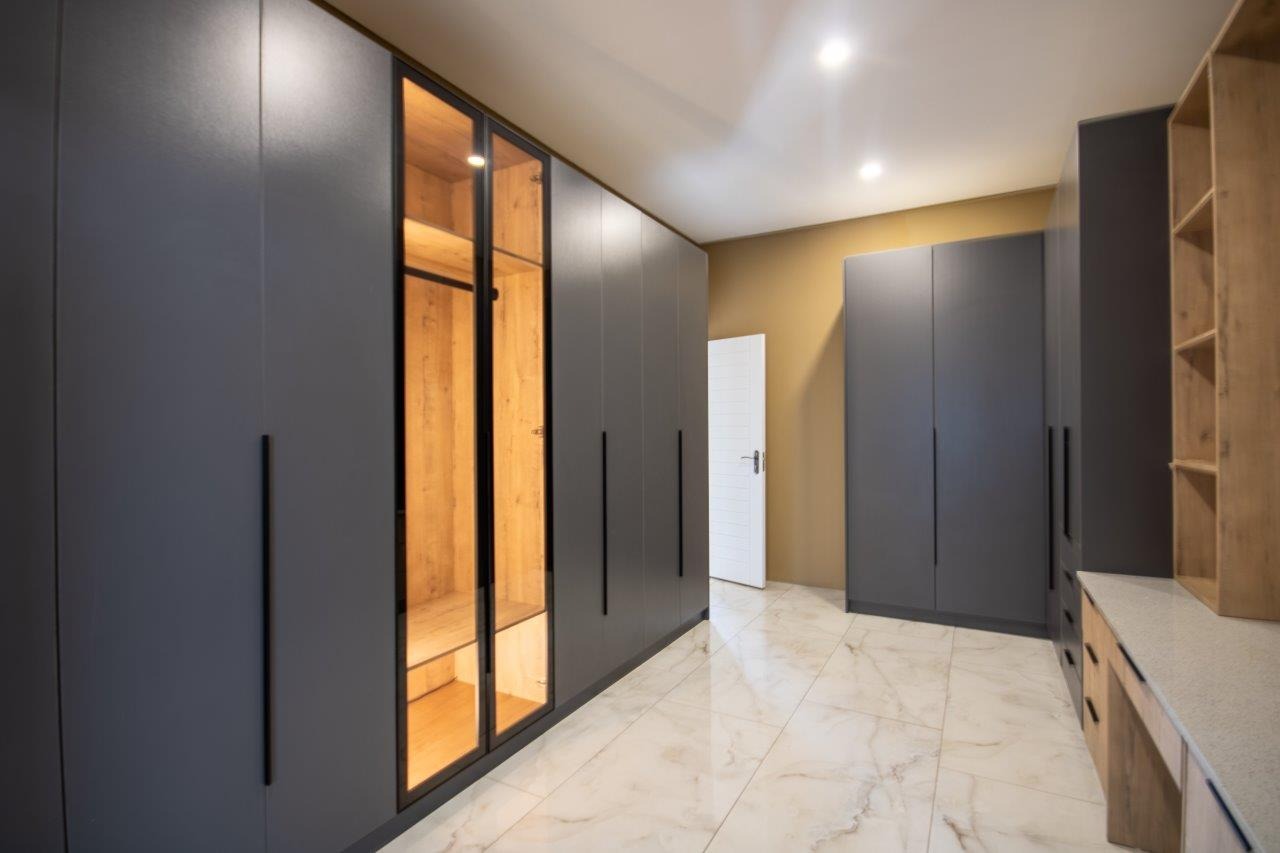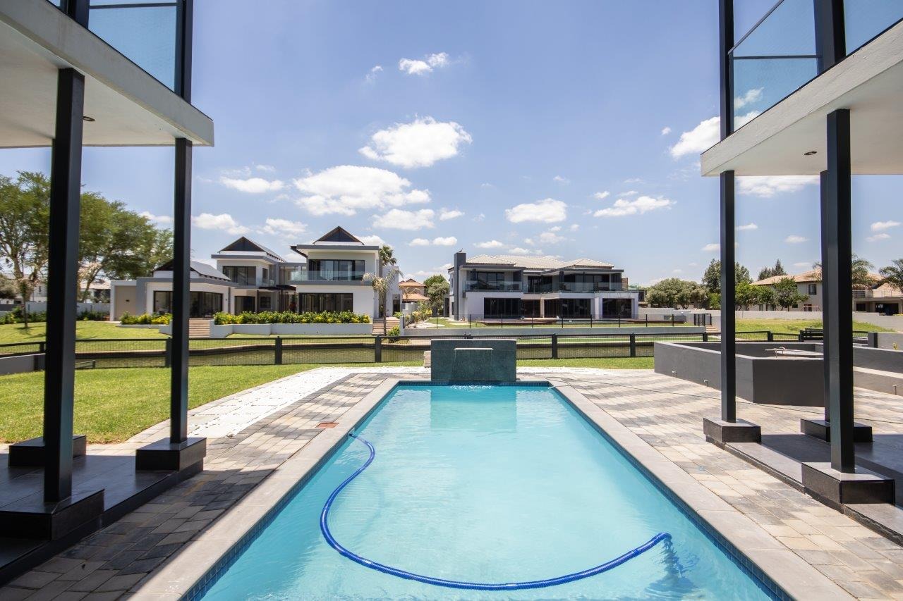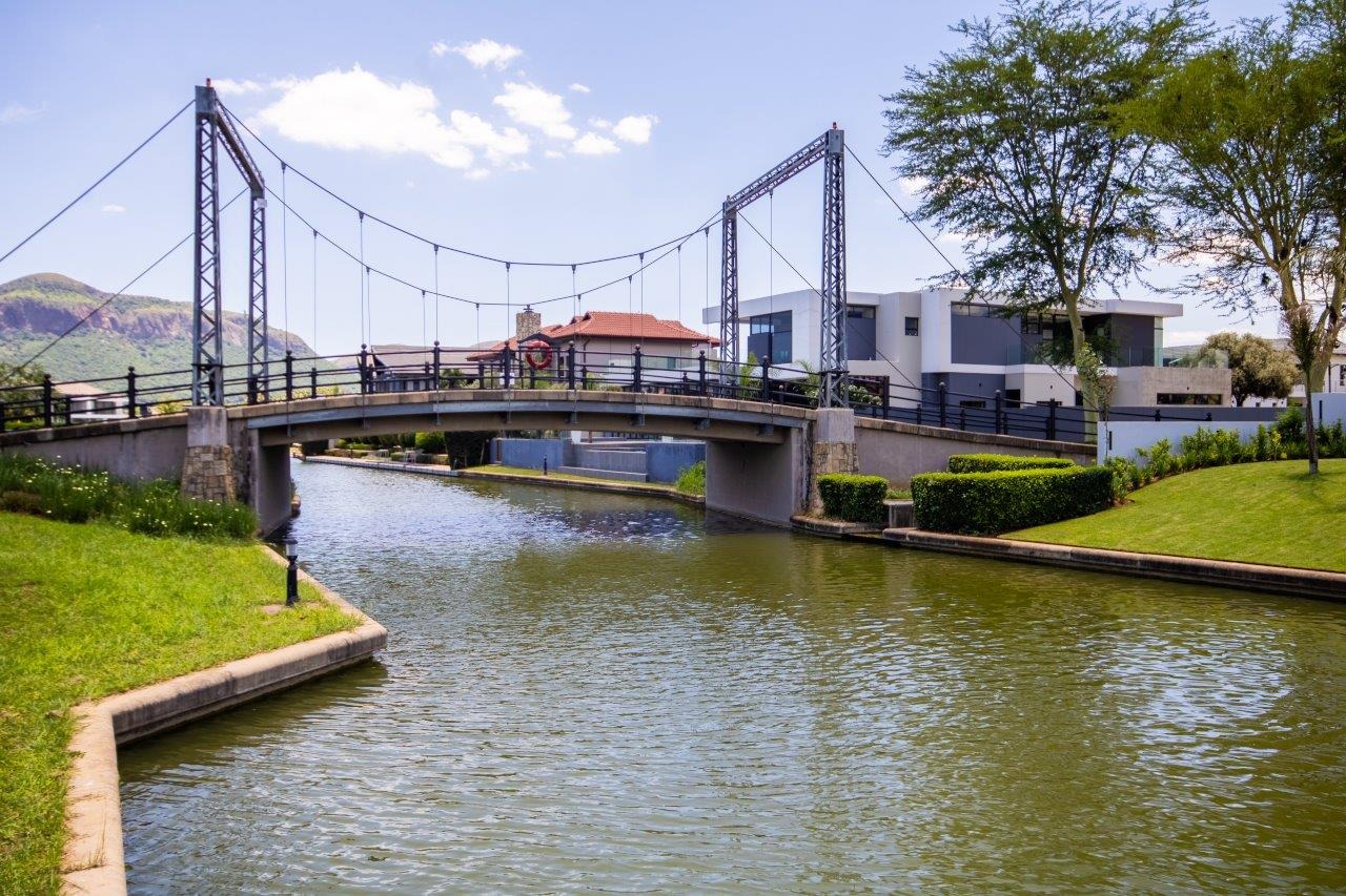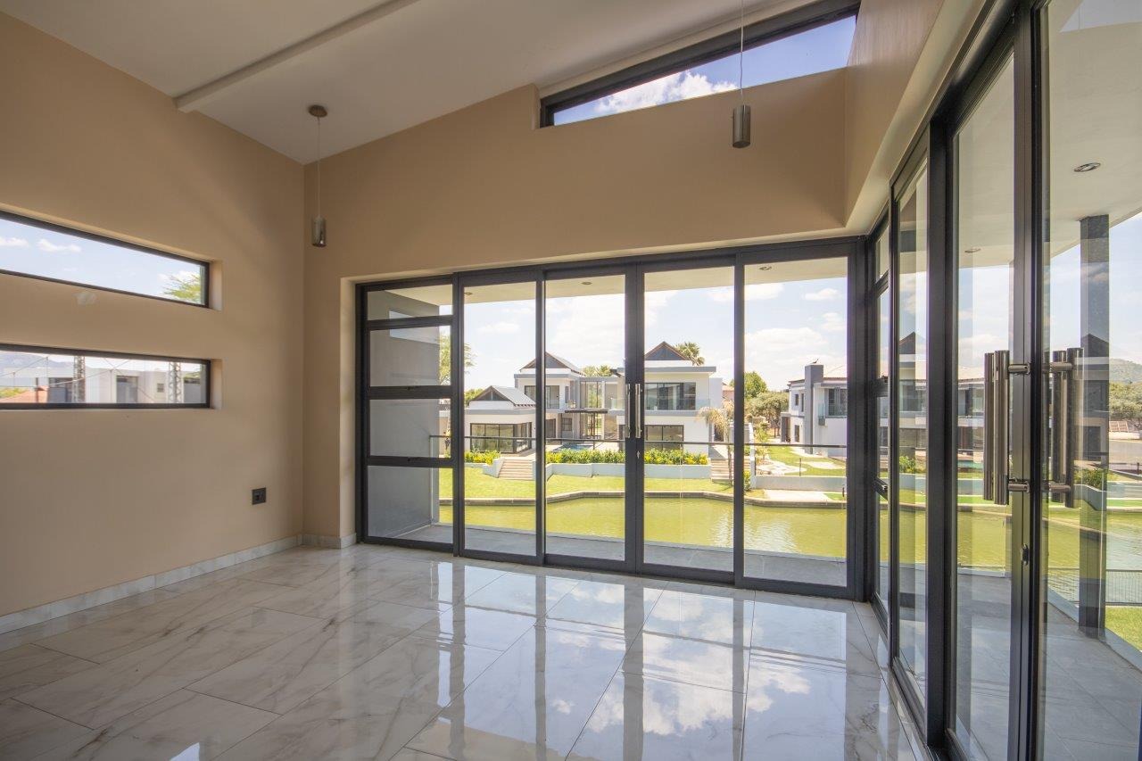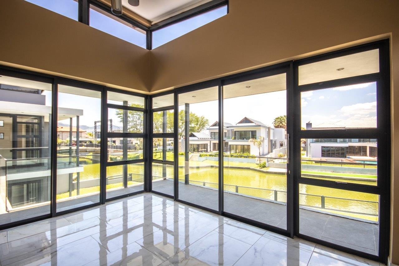 Upstairs, the pyjama lounge is an inviting space, complete with its own kitchenette, offering convenience and comfort for lazy mornings or late-night snacks. The main suite is a retreat like no other, with sweeping views of the Magaliesberg Mountains and the canal. A dressing room with abundant cupboard space leads into an opulent bathroom that exudes grandeur—a space truly fit for royalty.