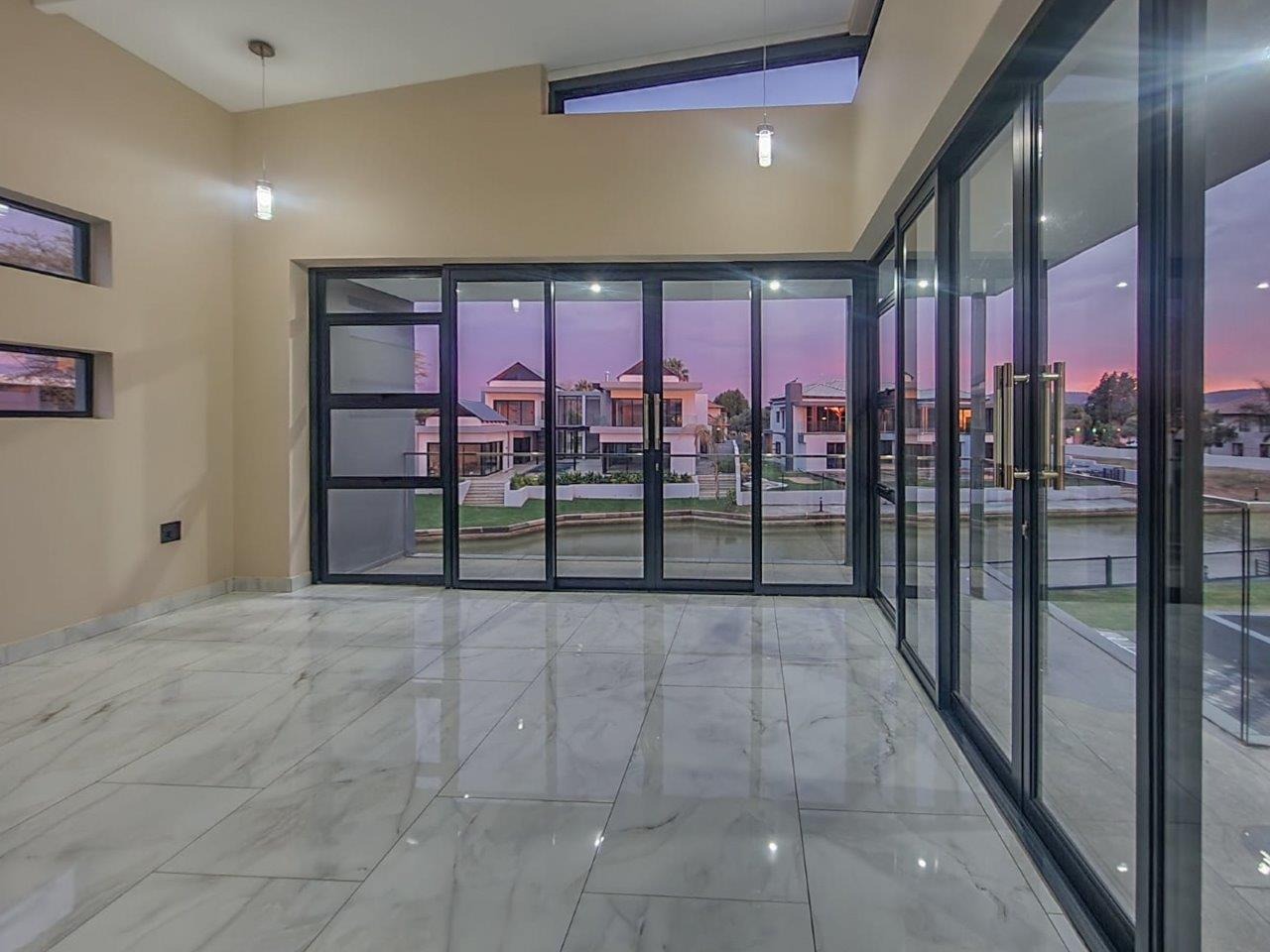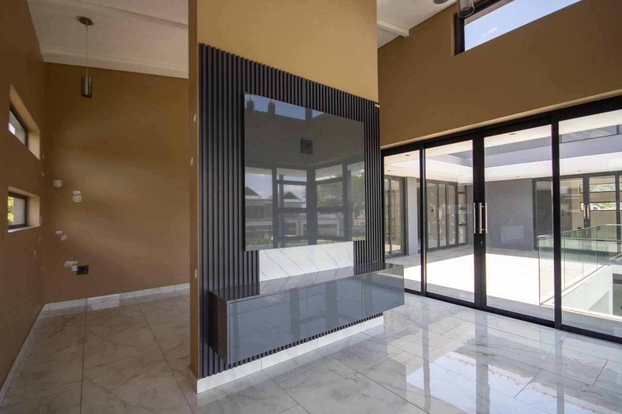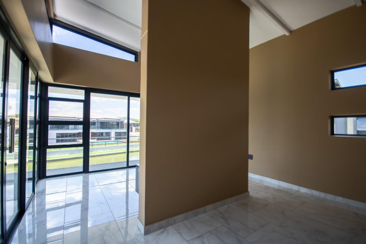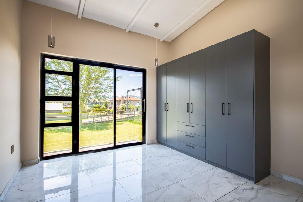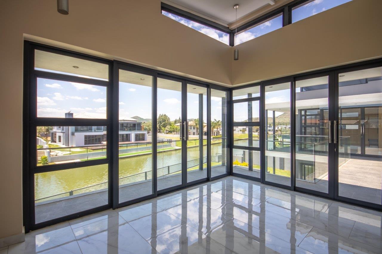 Upstairs, the pyjama lounge is an inviting space, complete with its own kitchenette, offering convenience and comfort for lazy mornings or late-night snacks. The main suite is a retreat like no other, with sweeping views of the Magaliesberg Mountains and the canal. A dressing room with abundant cupboard space leads into an opulent bathroom that exudes grandeur—a space truly fit for royalty.