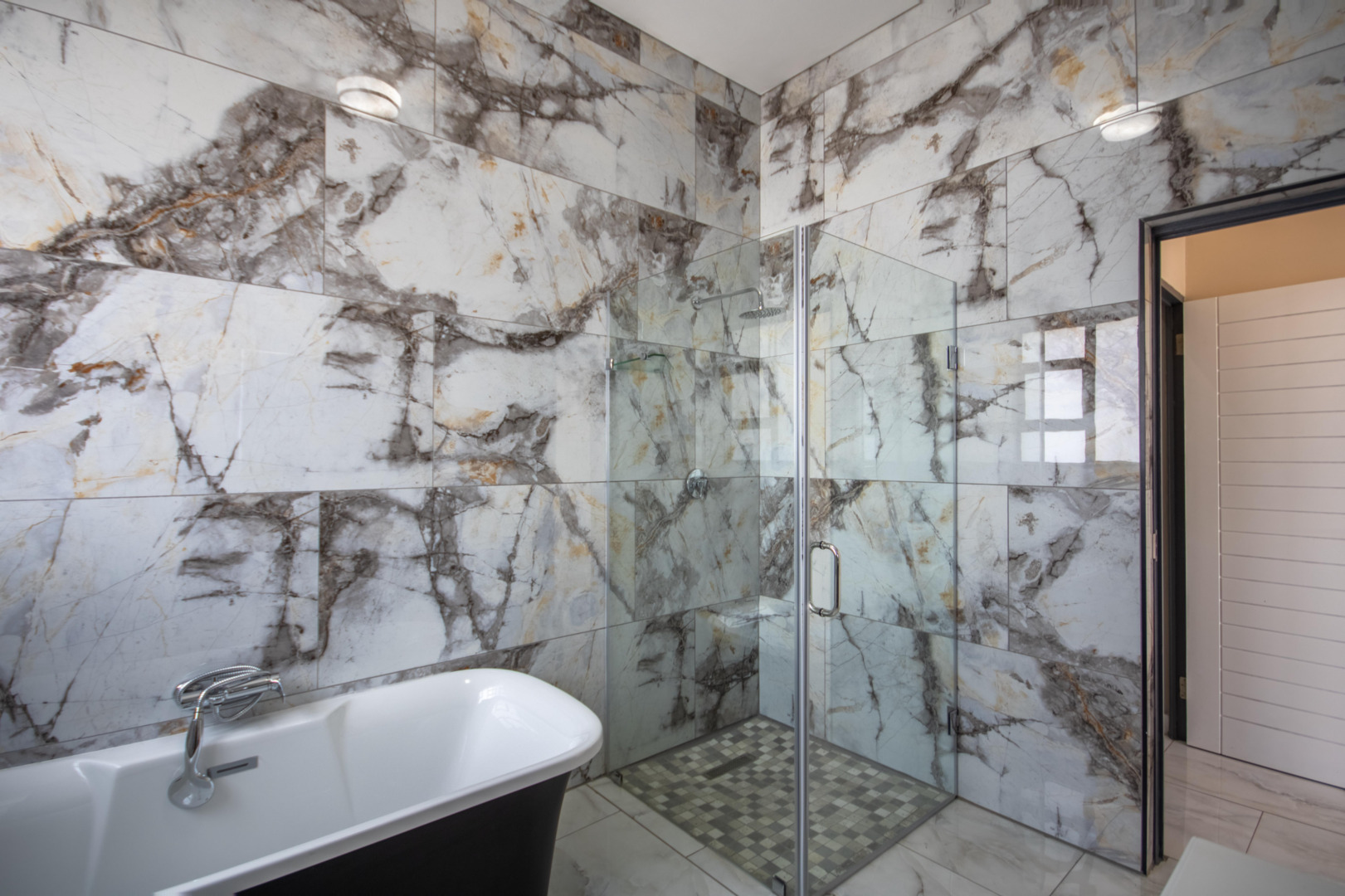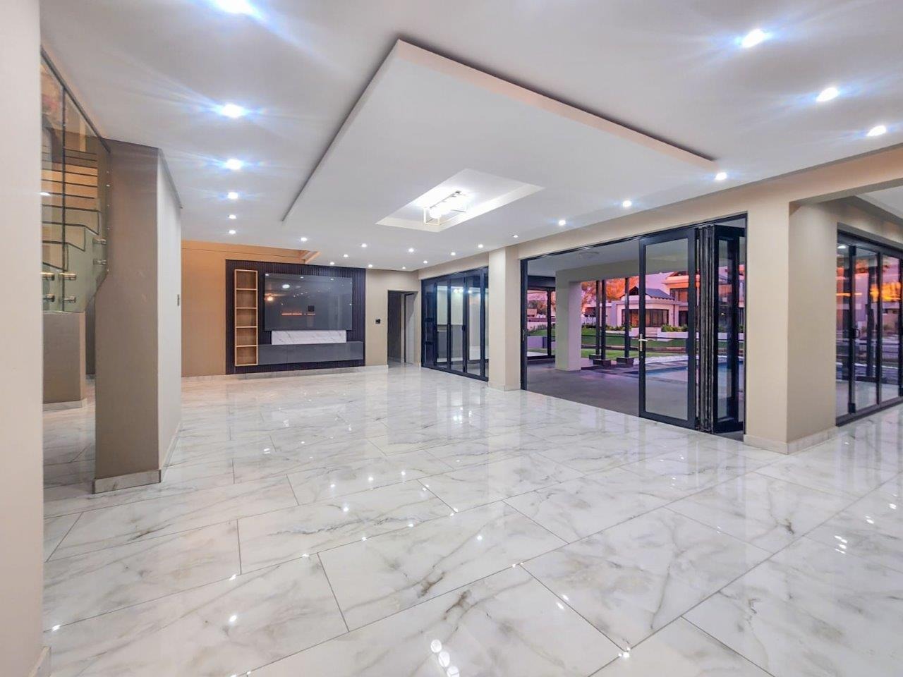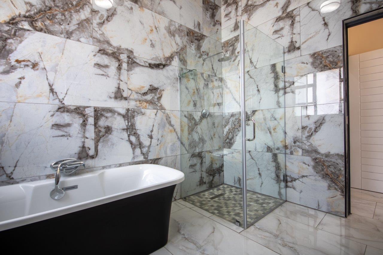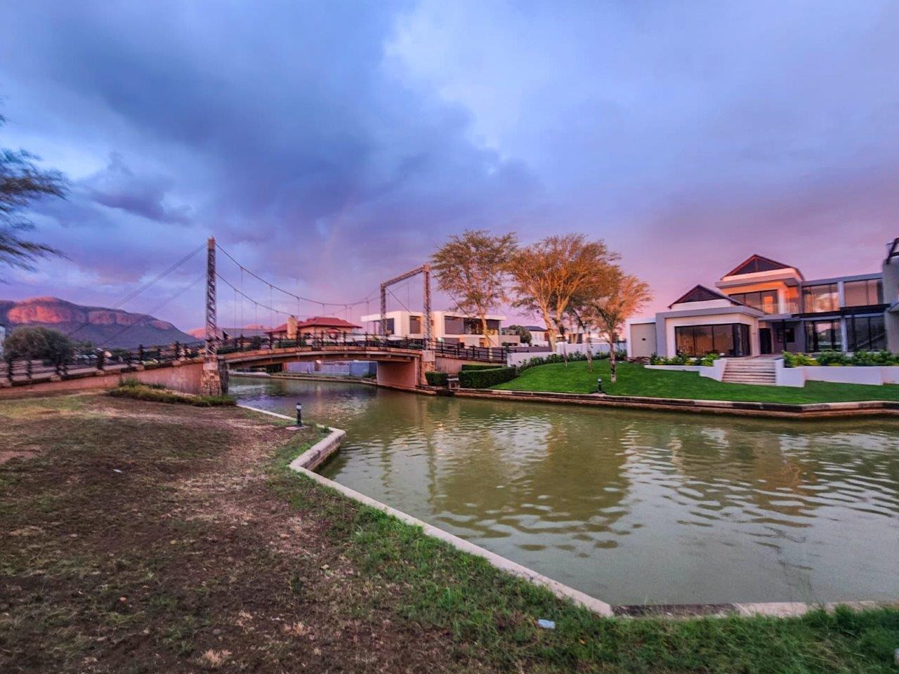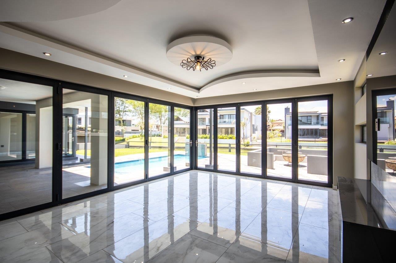 Upstairs, the pyjama lounge is an inviting space, complete with its own kitchenette, offering convenience and comfort for lazy mornings or late-night snacks. The main suite is a retreat like no other, with sweeping views of the Magaliesberg Mountains and the canal. A dressing room with abundant cupboard space leads into an opulent bathroom that exudes grandeur—a space truly fit for royalty.
