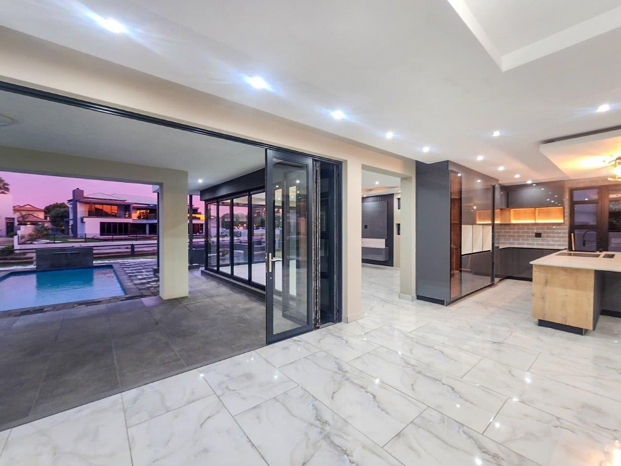 The open-plan layout creates a seamless flow through the living spaces, where sleek finishes, ambient feature lighting, and expansive interiors set the tone for stylish living. A family room, dining area, and an entertainment space with a built-in bar all open onto a breathtaking outdoor area. The stacking doors reveal a sparkling pool, a beautifully landscaped garden, and direct canal access—perfect for relaxed afternoons, intimate gatherings, or tranquil cruises.