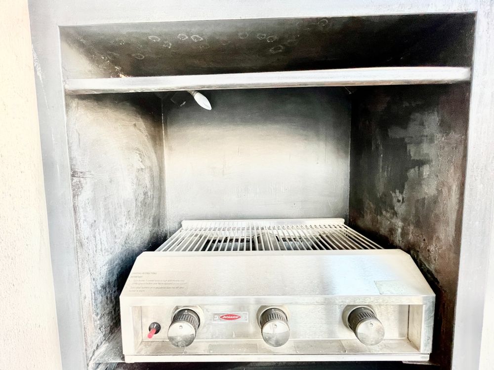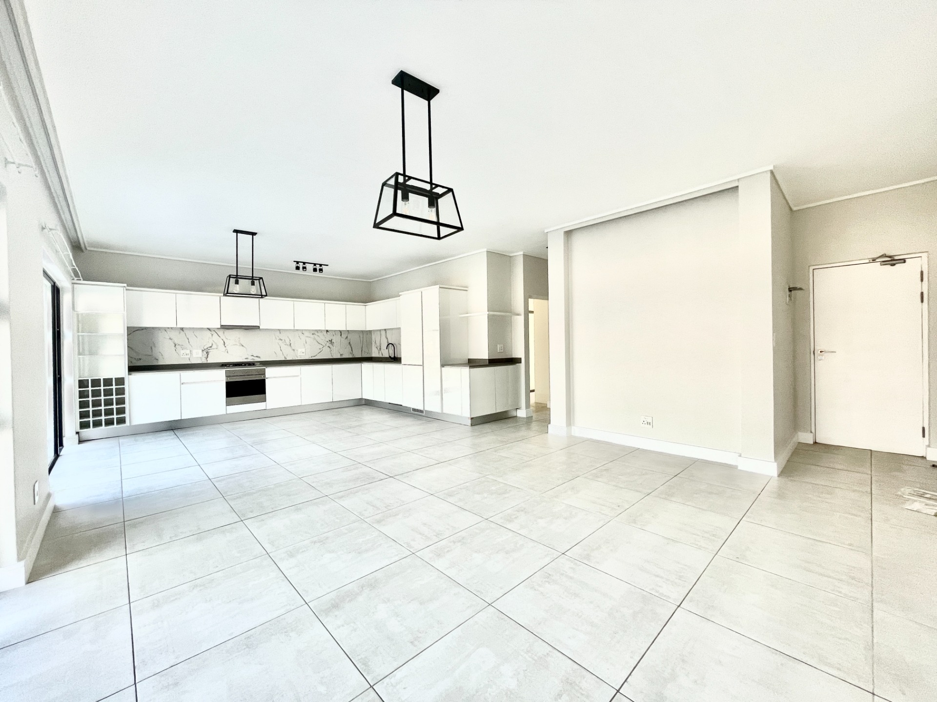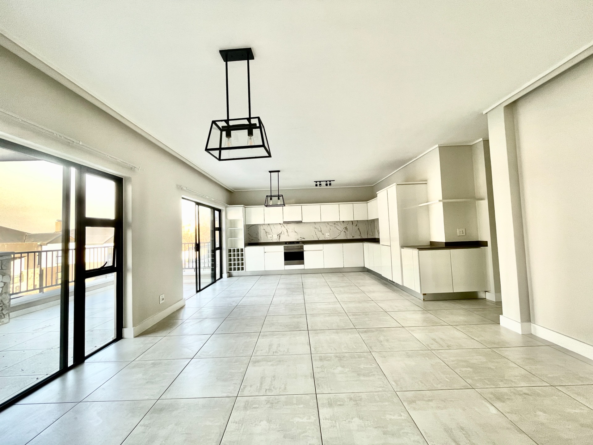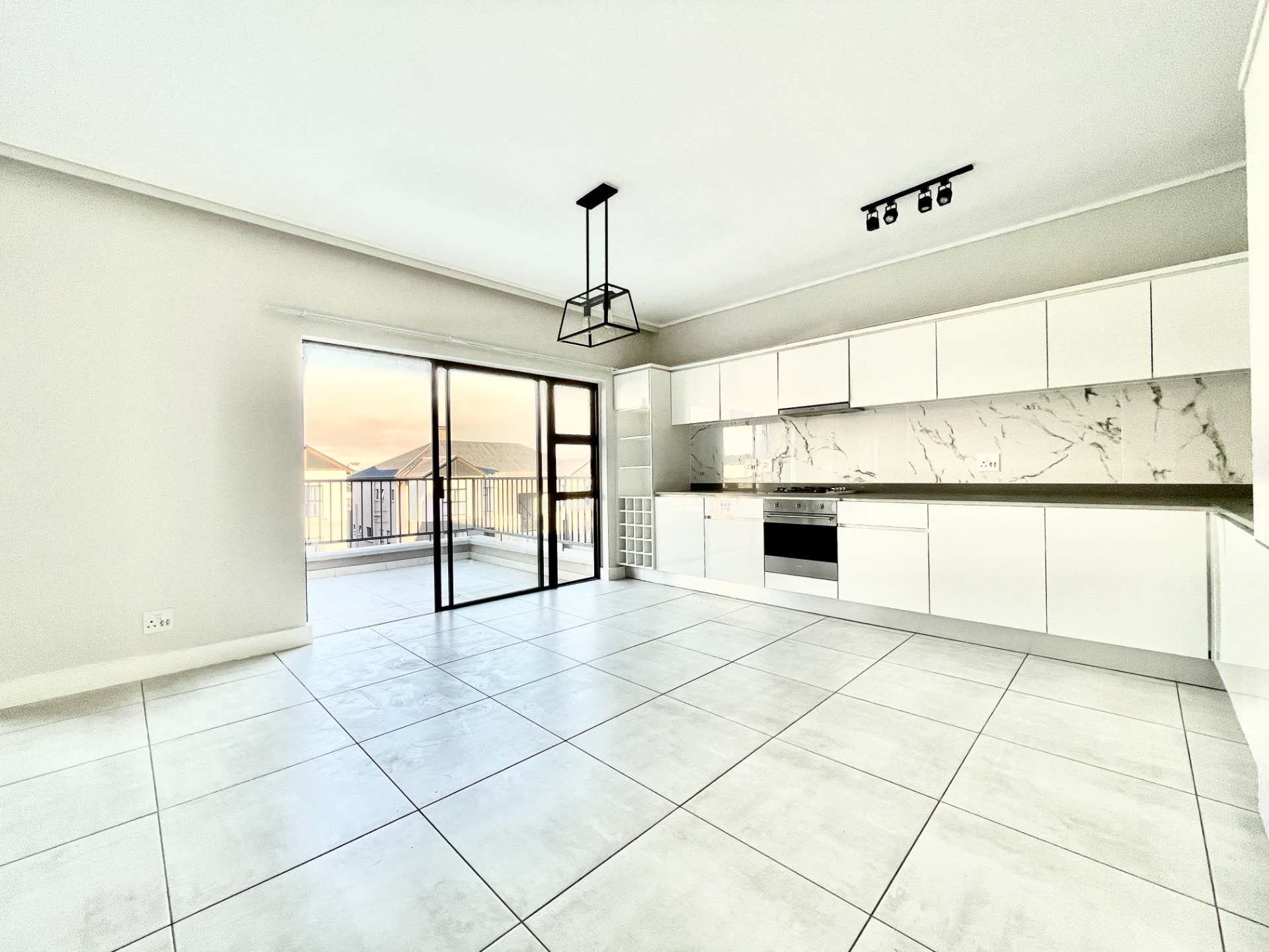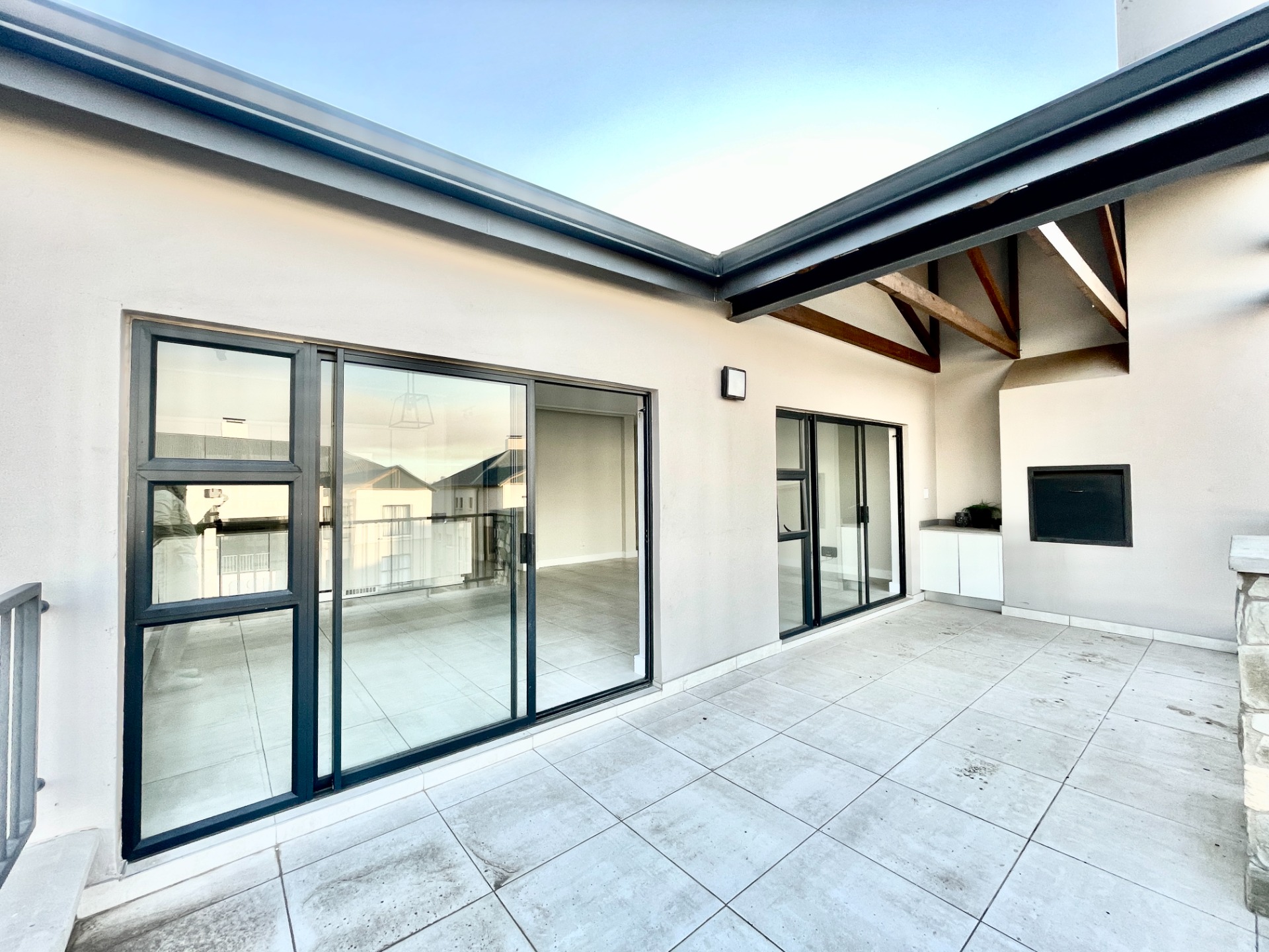 Open-plan living and dining area, leading to a private balcony with a built-in braai—perfect for entertaining