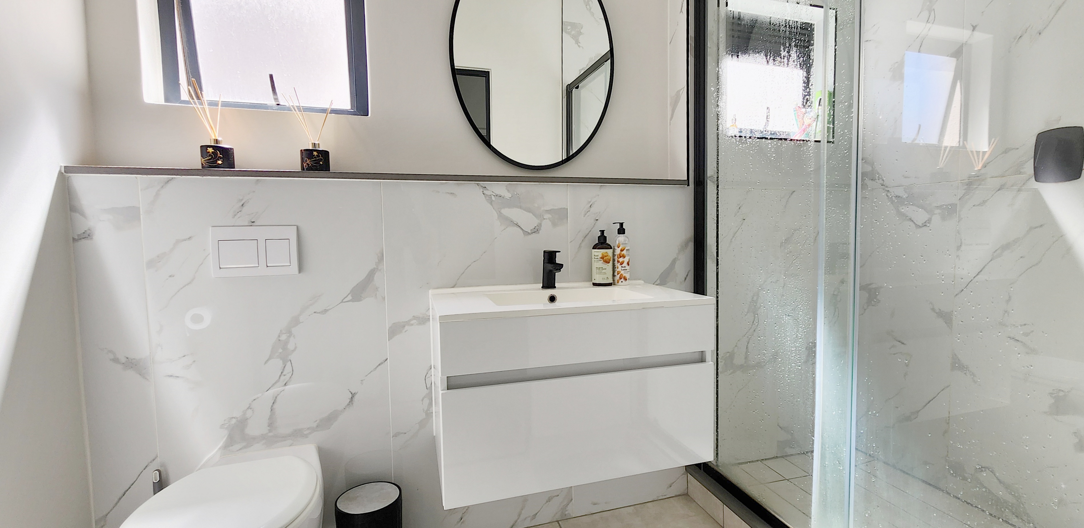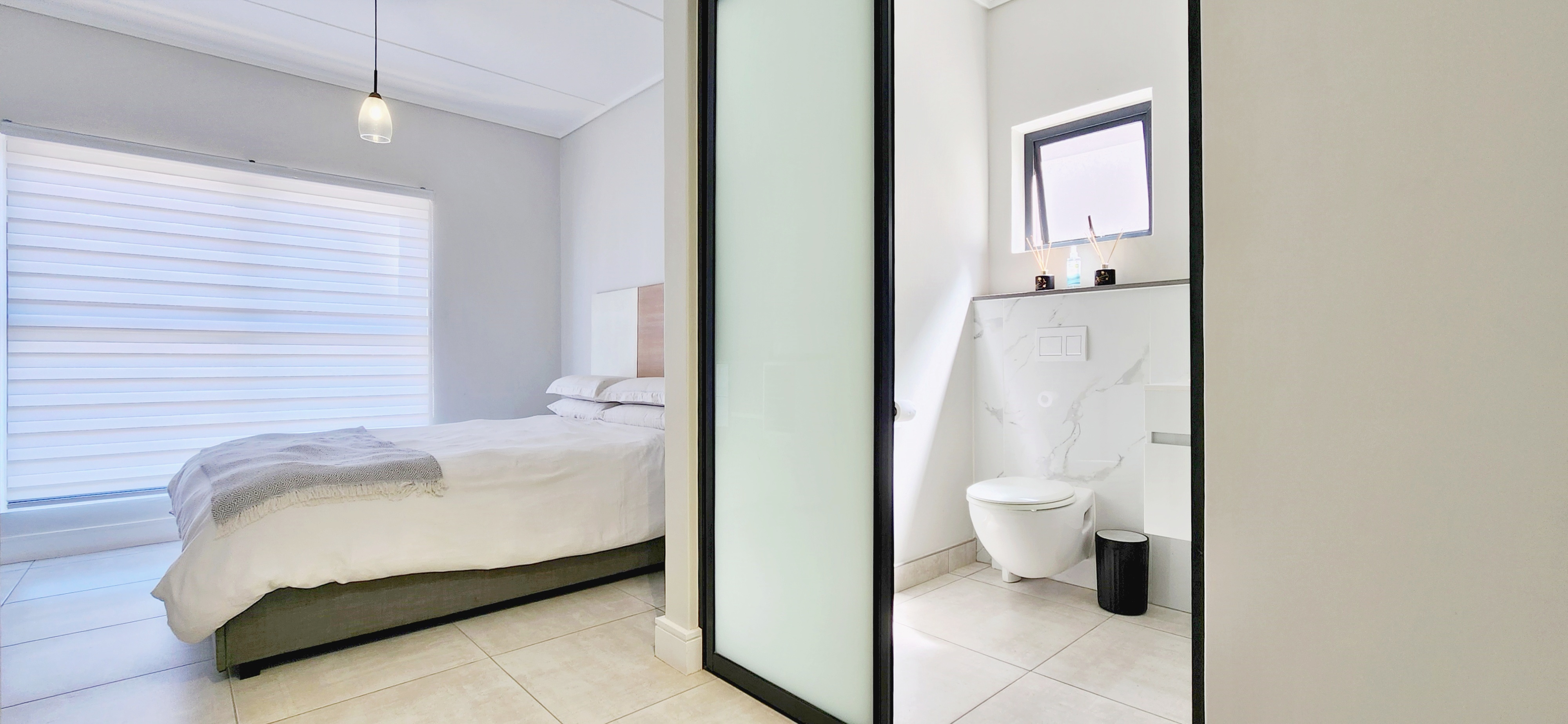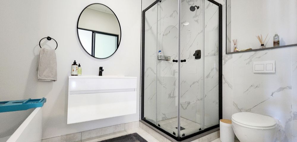 The three bedrooms are generously proportioned, each fitted with built-in cupboards and large windows that bathe the rooms in natural light. The two guest bedrooms share a beautifully appointed full bathroom with a tub, large shower, modern vanity, and toilet. The main bedroom enjoys its own private en-suite, complete with a spacious walk-in shower, sleek vanity, and toilet.