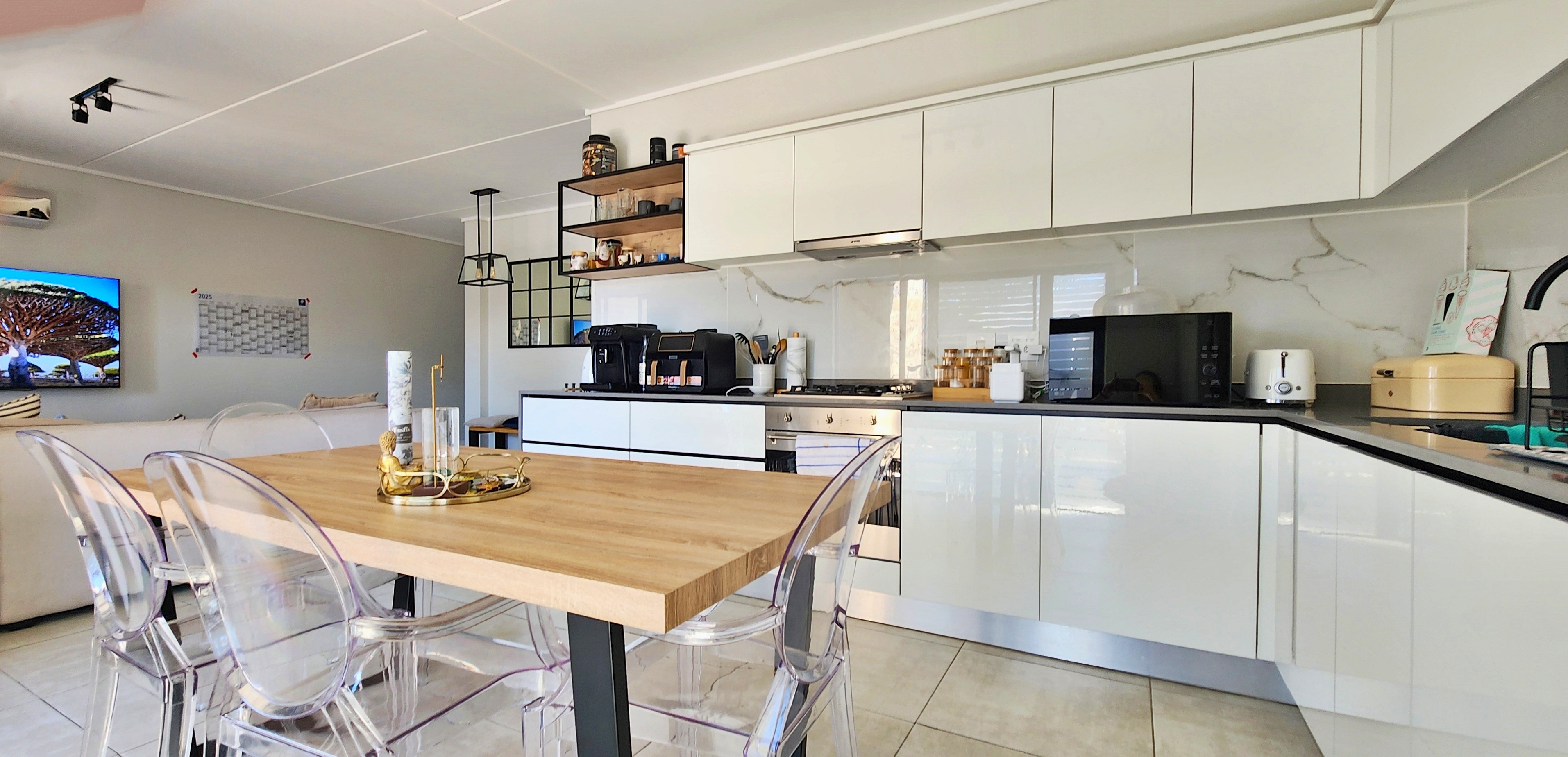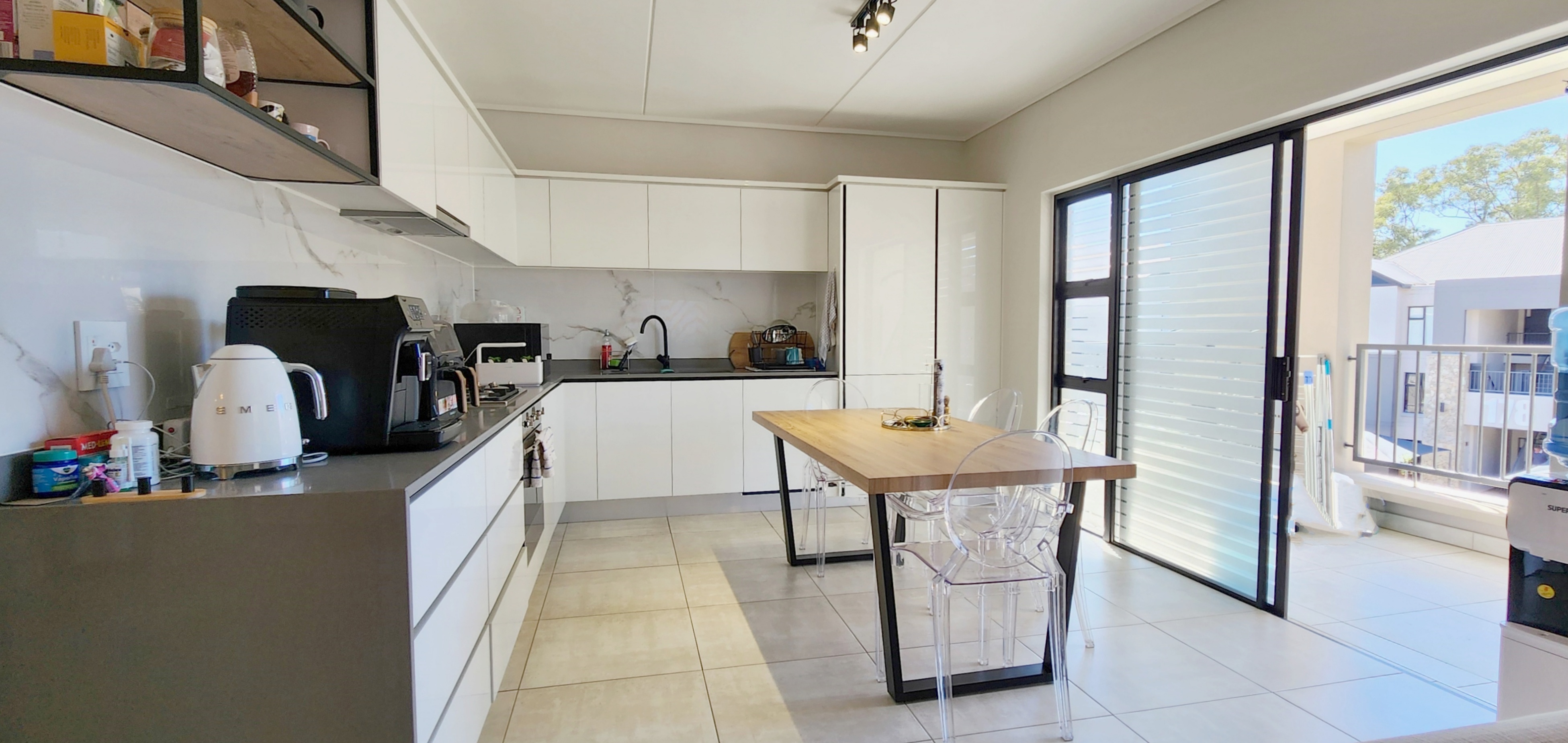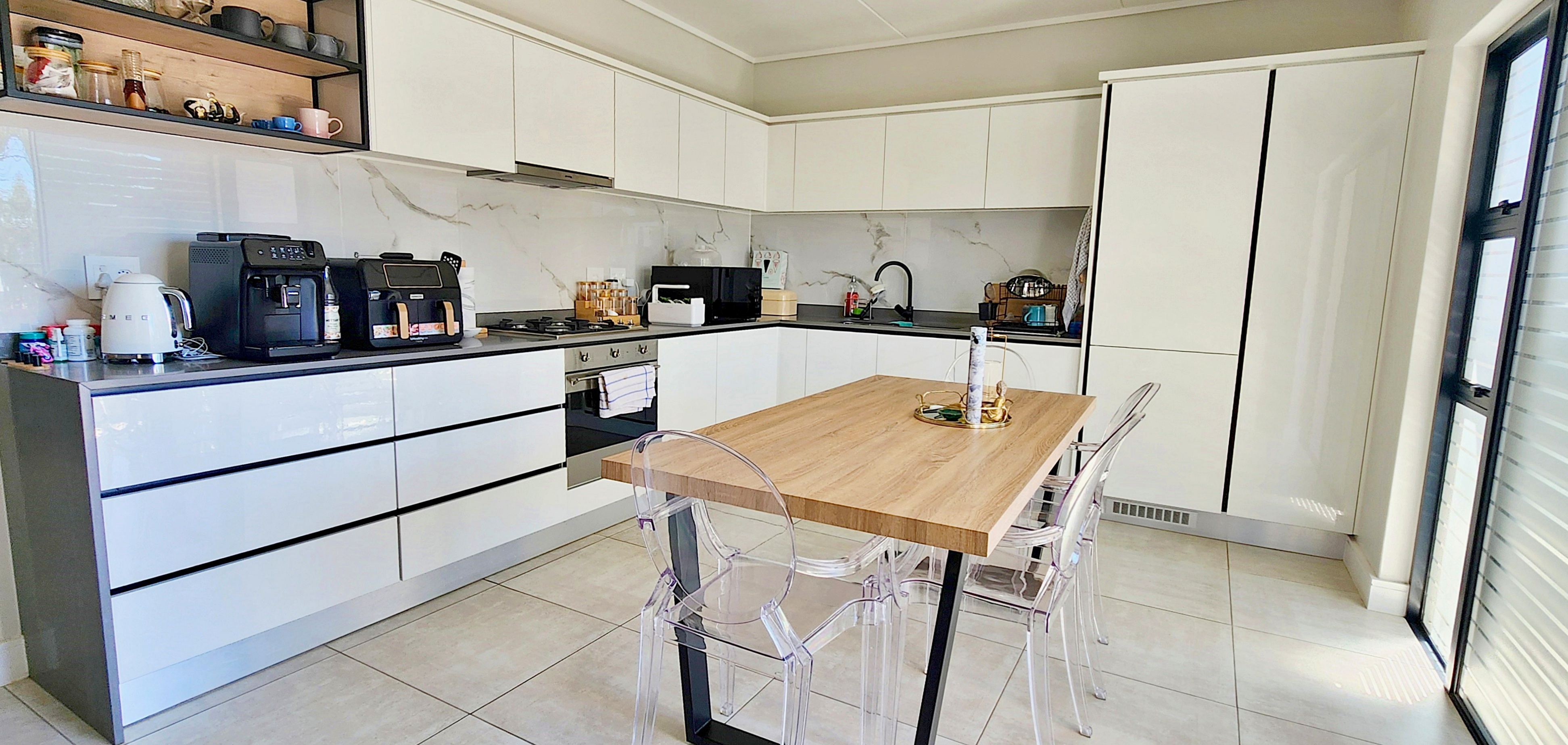 The kitchen is both functional and stylish, featuring high-quality Defy appliances, glossy white cabinetry with warm wood accents, and ample storage space. Fully tiled throughout, the home offers low-maintenance elegance.