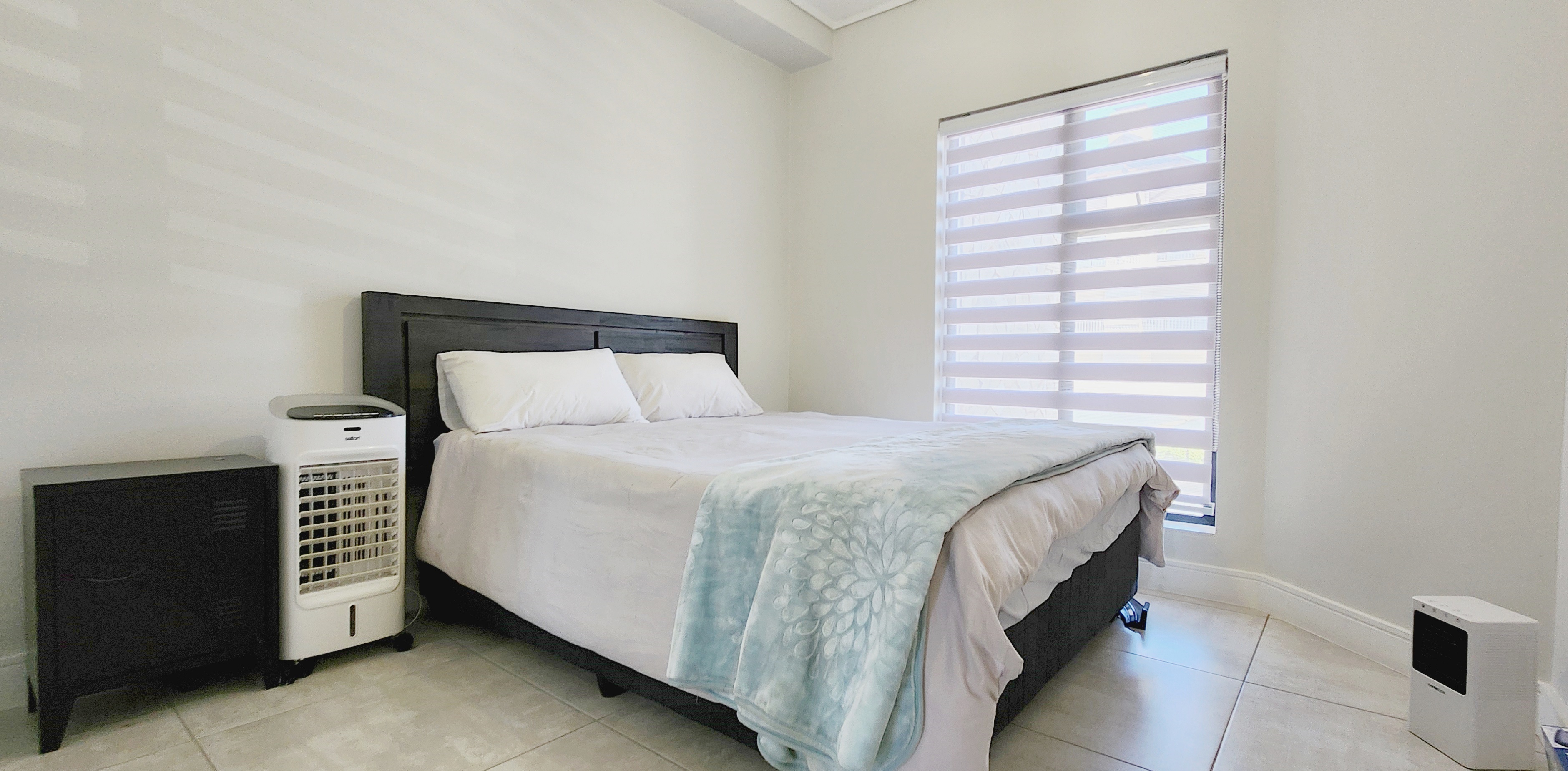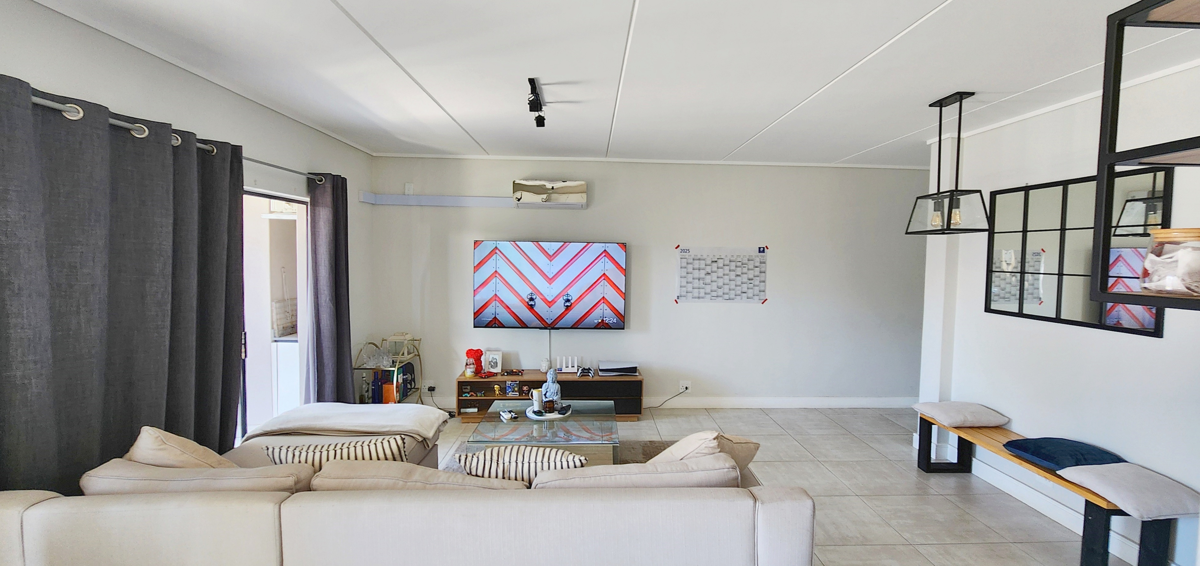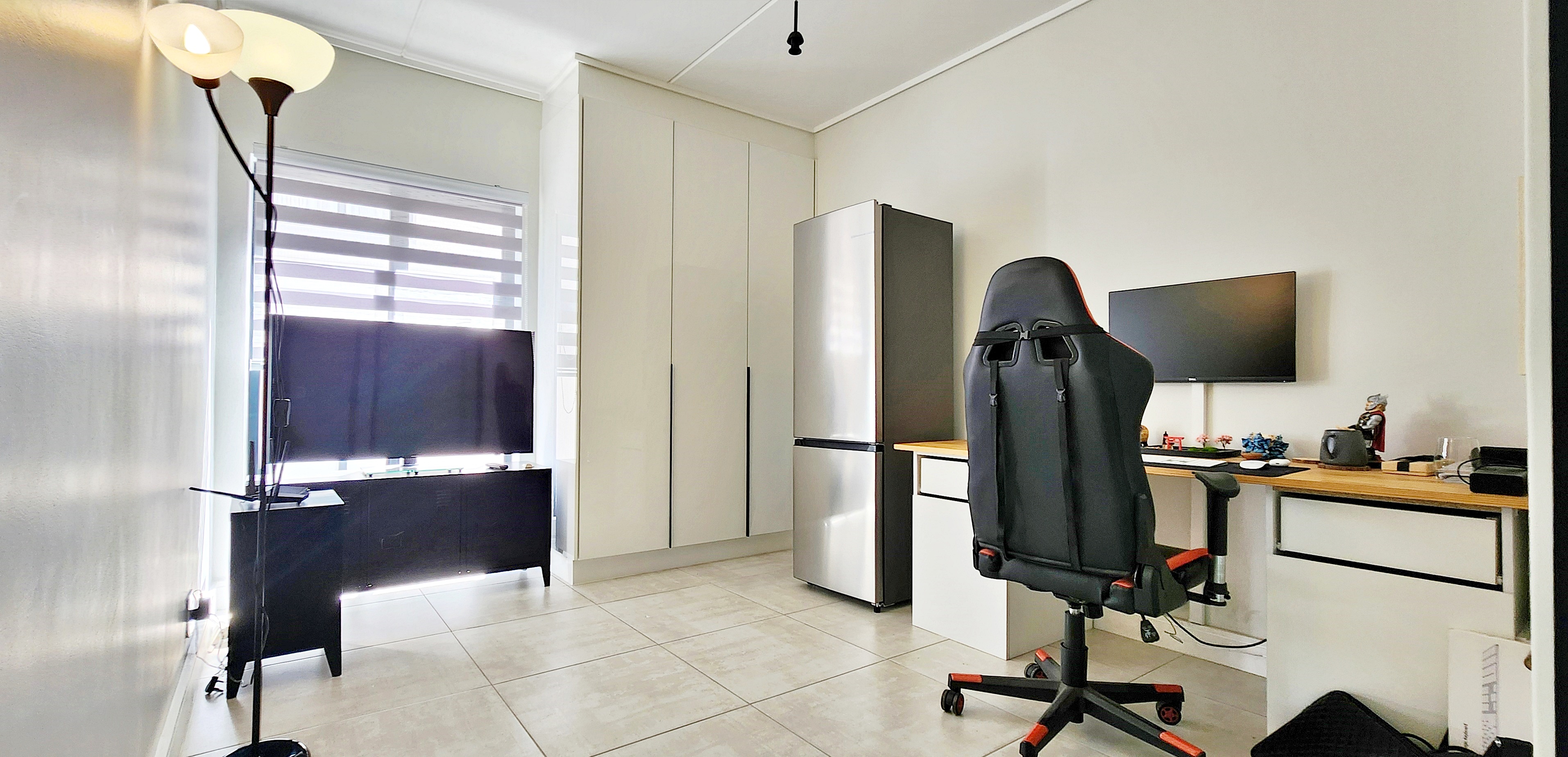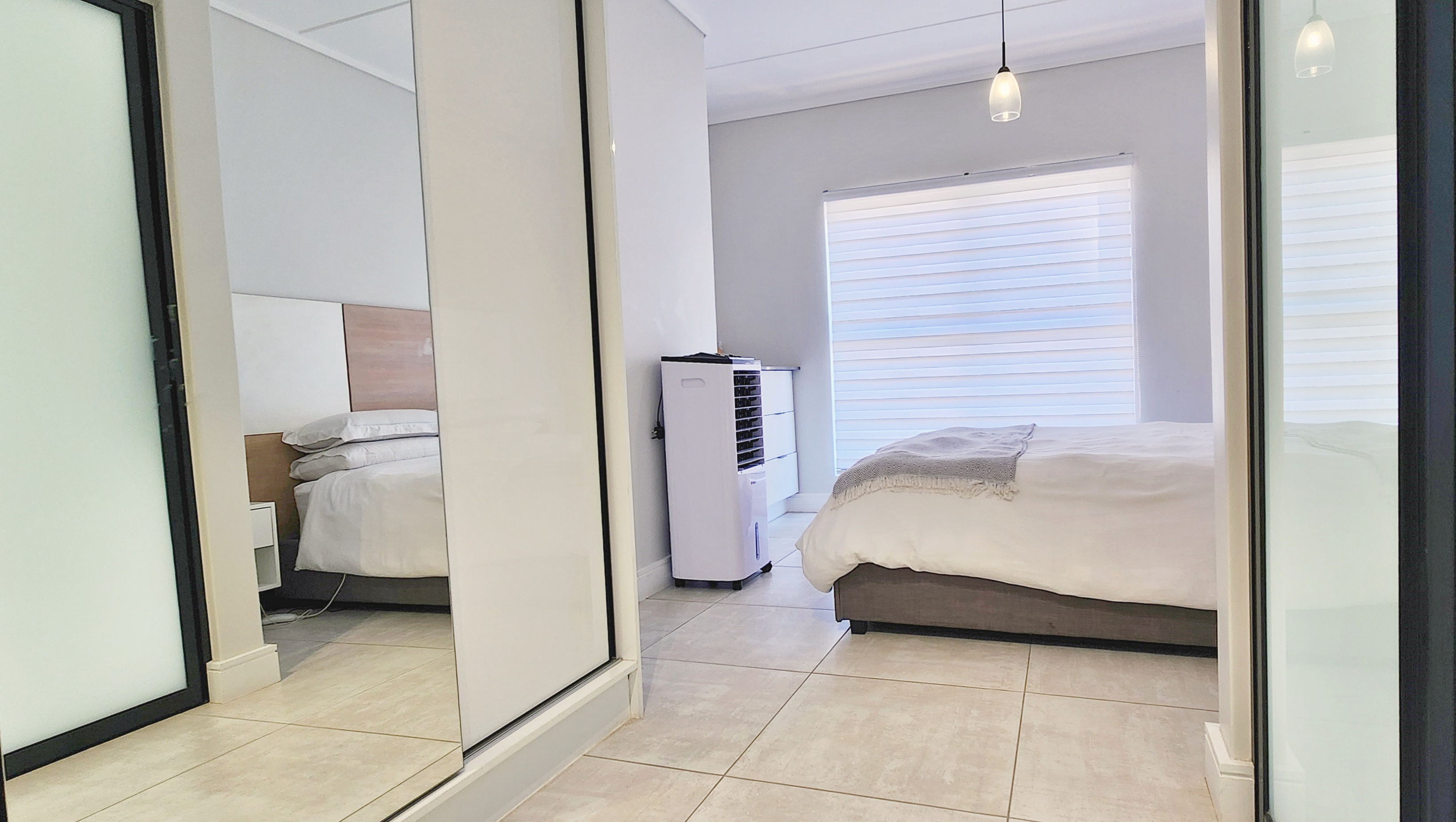 The kitchen is both functional and stylish, featuring high-quality Defy appliances, glossy white cabinetry with warm wood accents, and ample storage space. Fully tiled throughout, the home offers low-maintenance elegance.