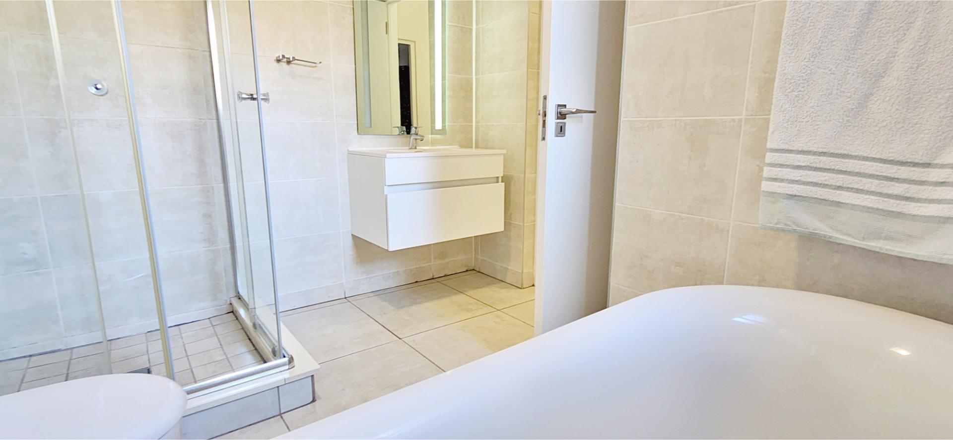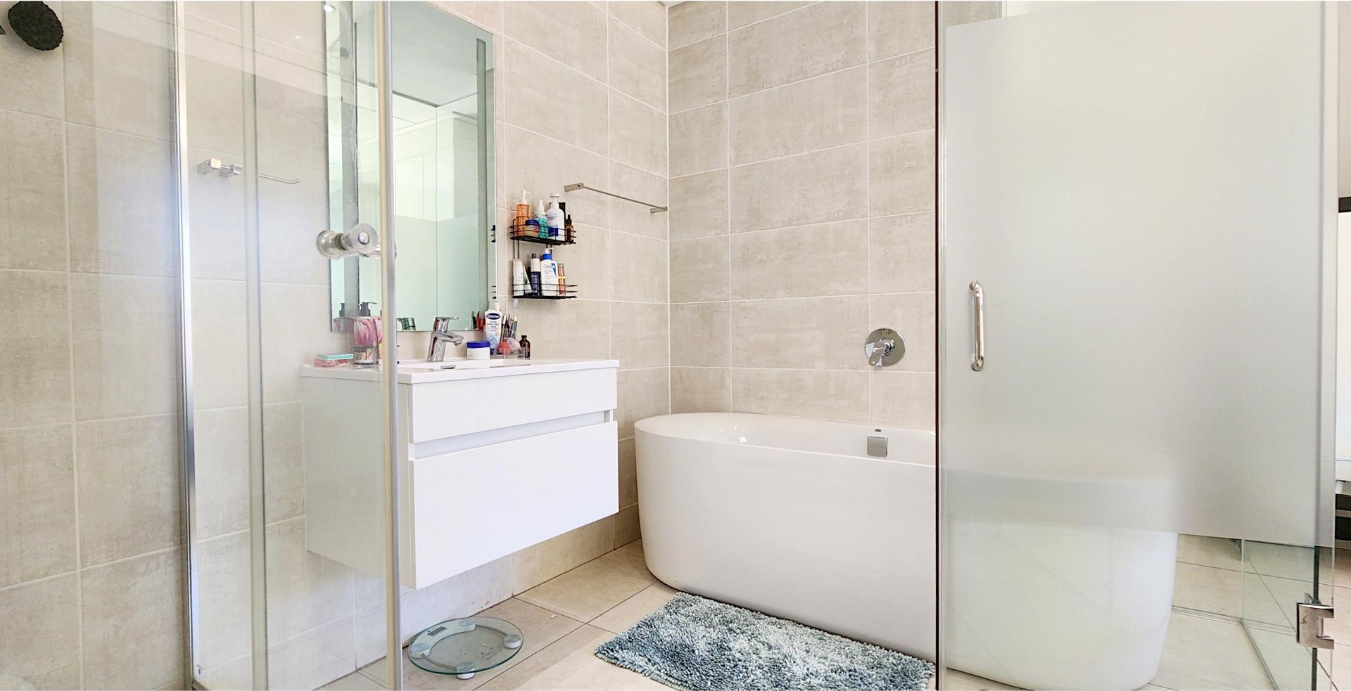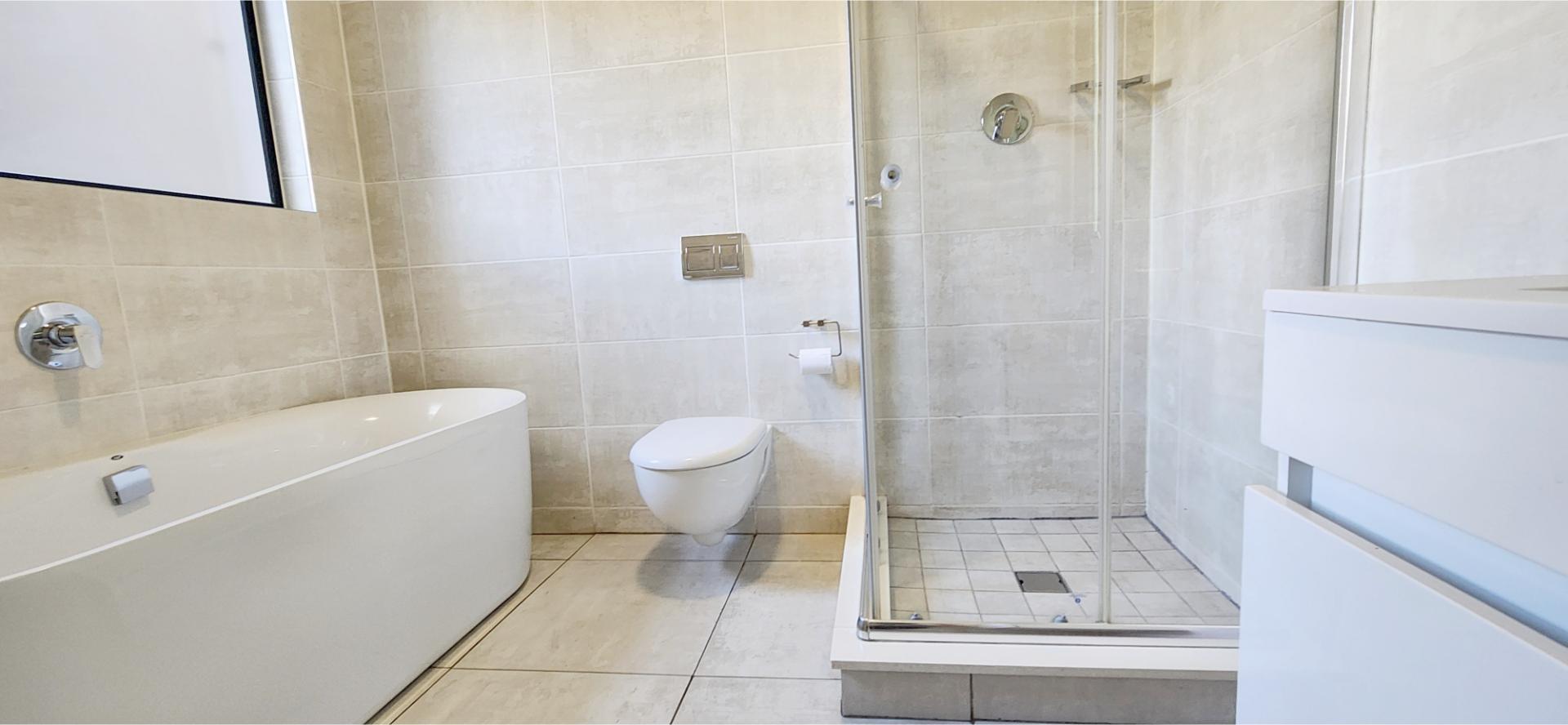 The apartment features three spacious bedrooms with built-in wardrobes. Two share a modern full bathroom located just steps away, while the main bedroom boasts its own full ensuite, thoughtfully designed within a glazed glass enclosure for comfort and privacy.