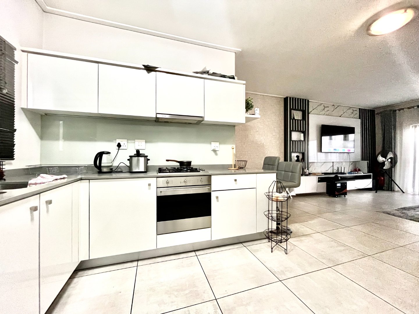 As you enter, you’re welcomed by a light-filled open-plan living and dining area, designed for easy flow and stylish living. The modern kitchen is equipped with high-quality finishes and ample cupboard space, seamlessly integrating into the living space.
