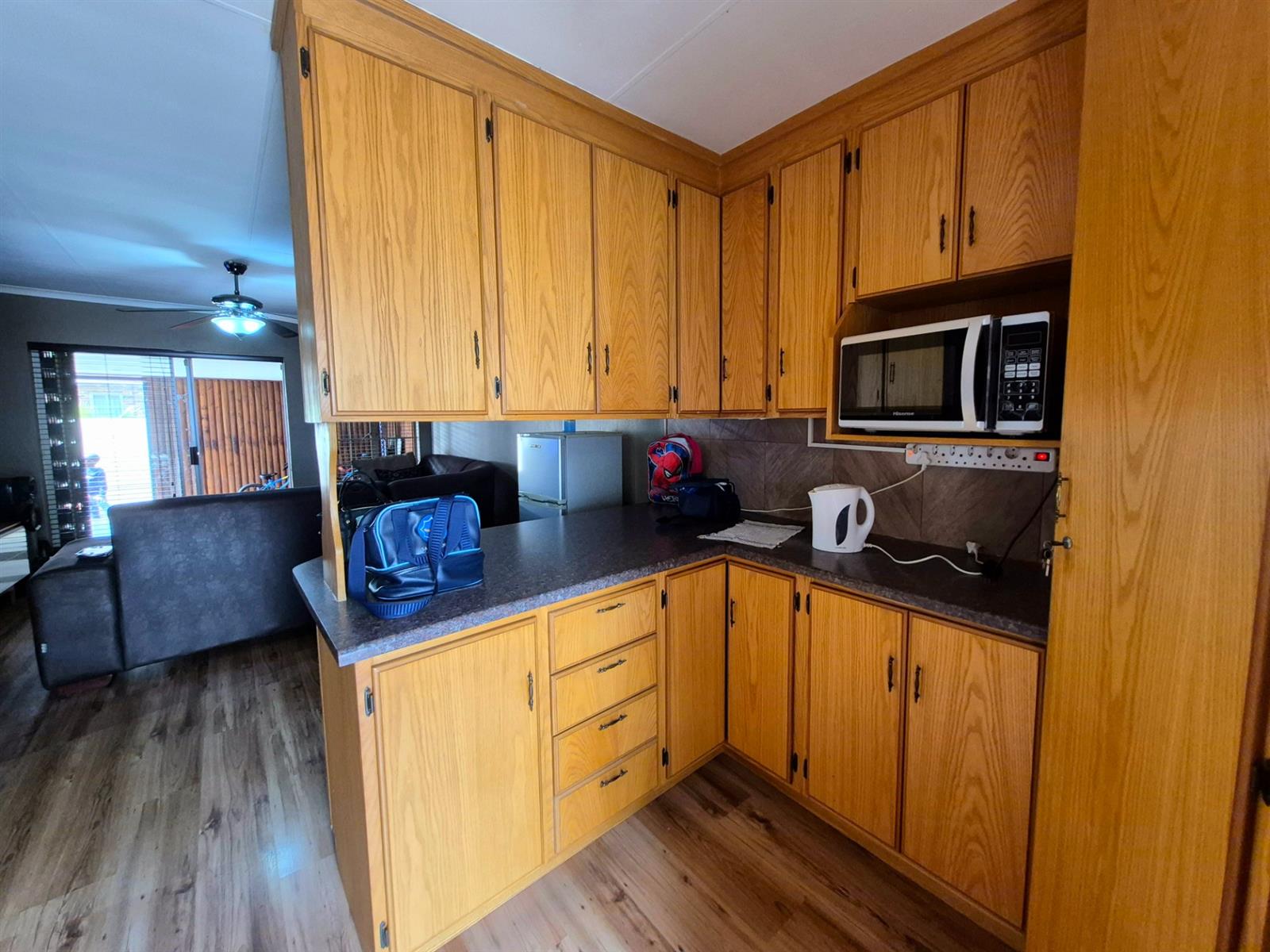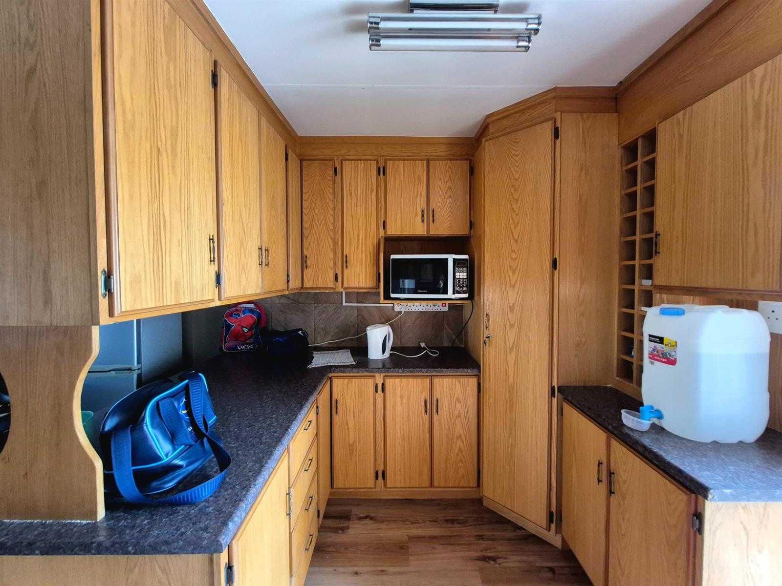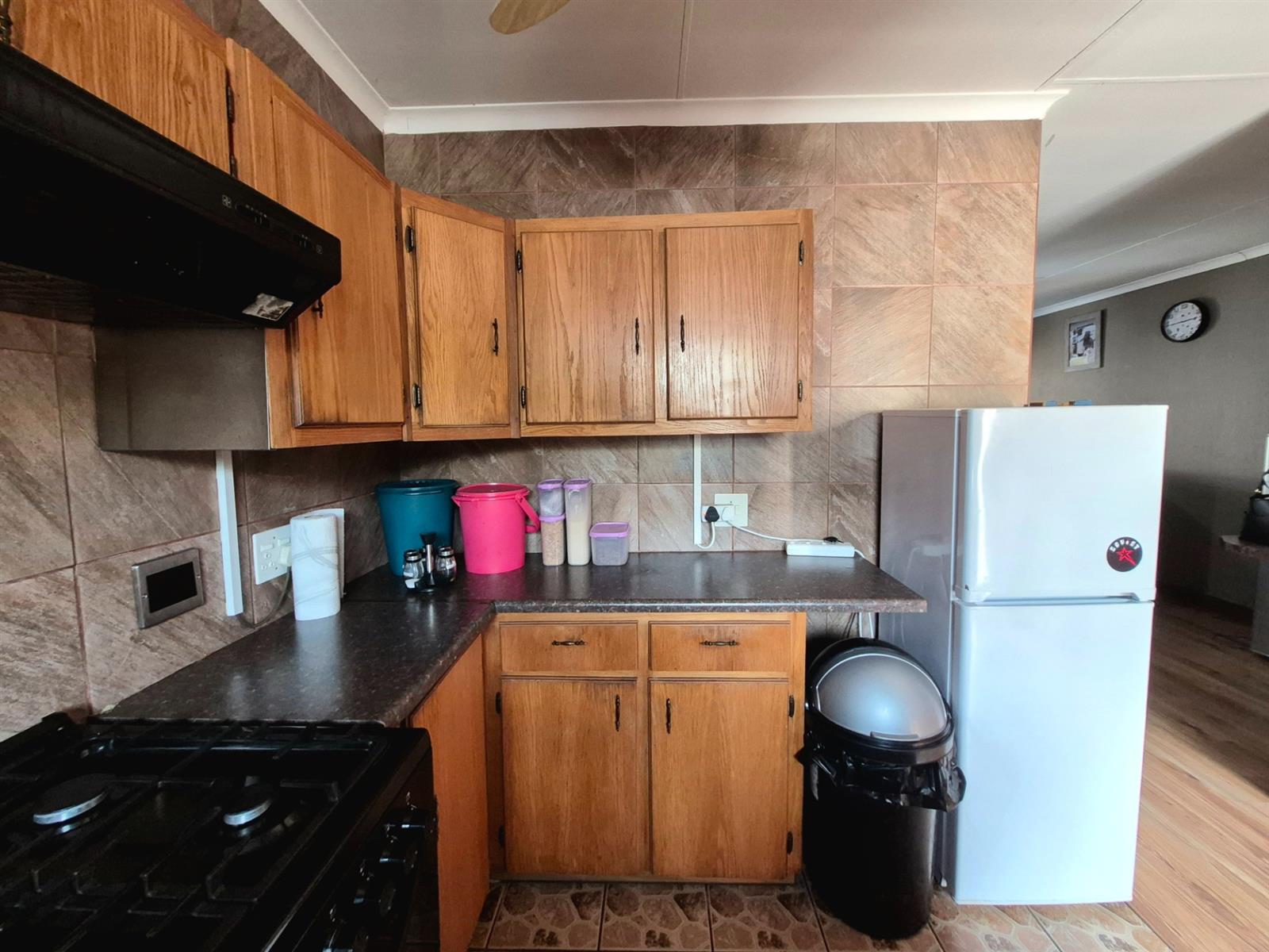 The kitchen is neat and practical with ample cupboard space and a gas stove ideal for everyday cooking