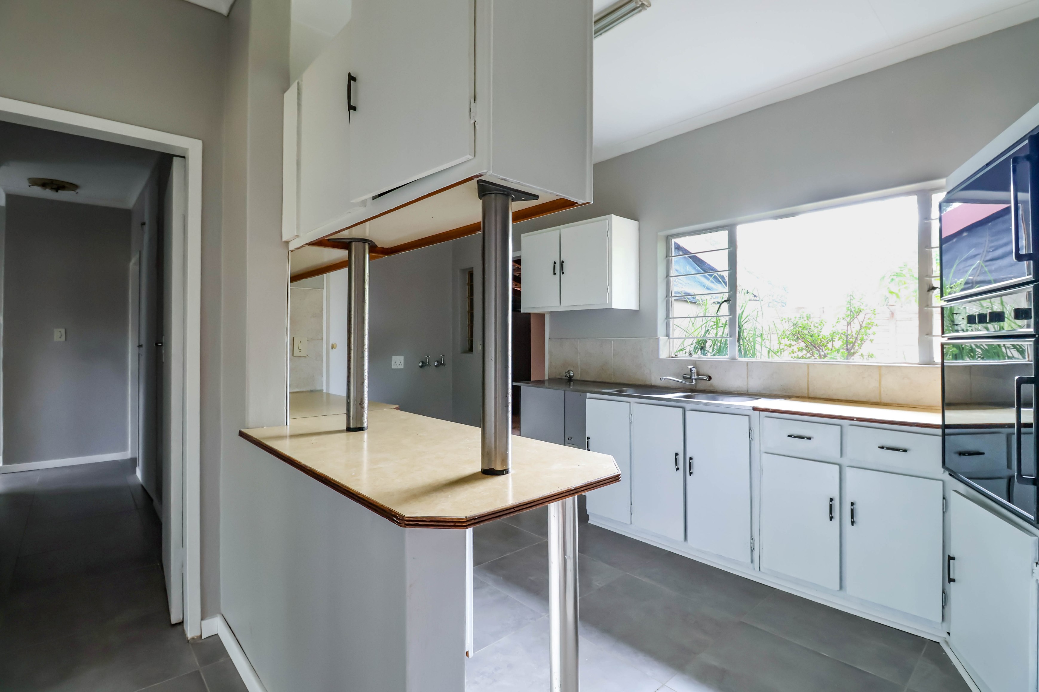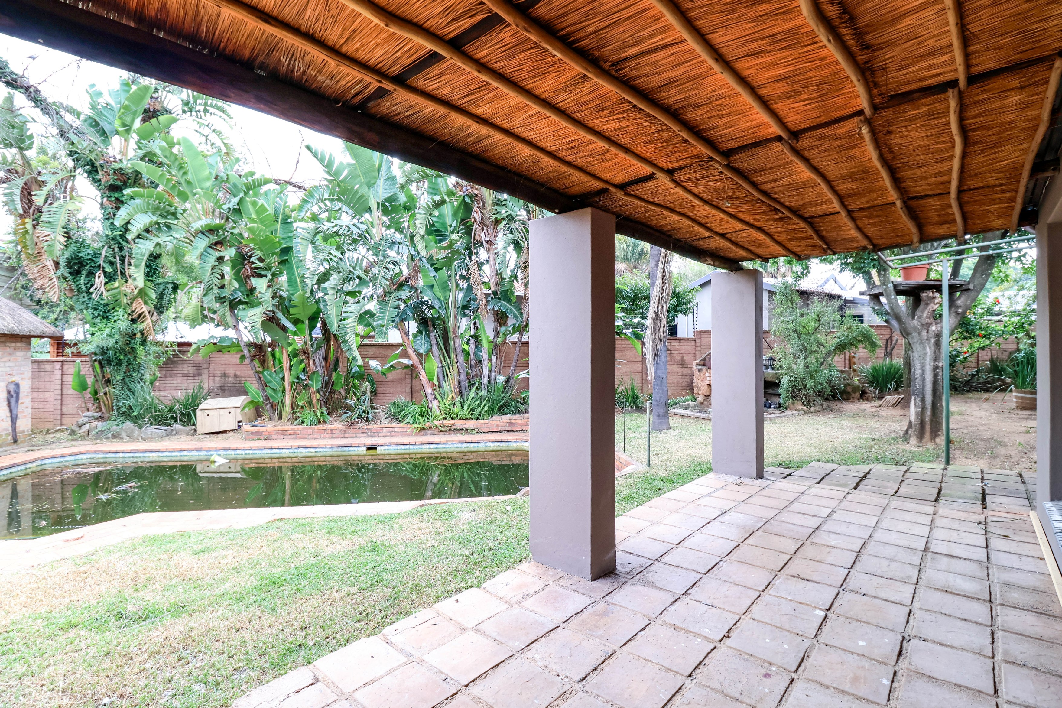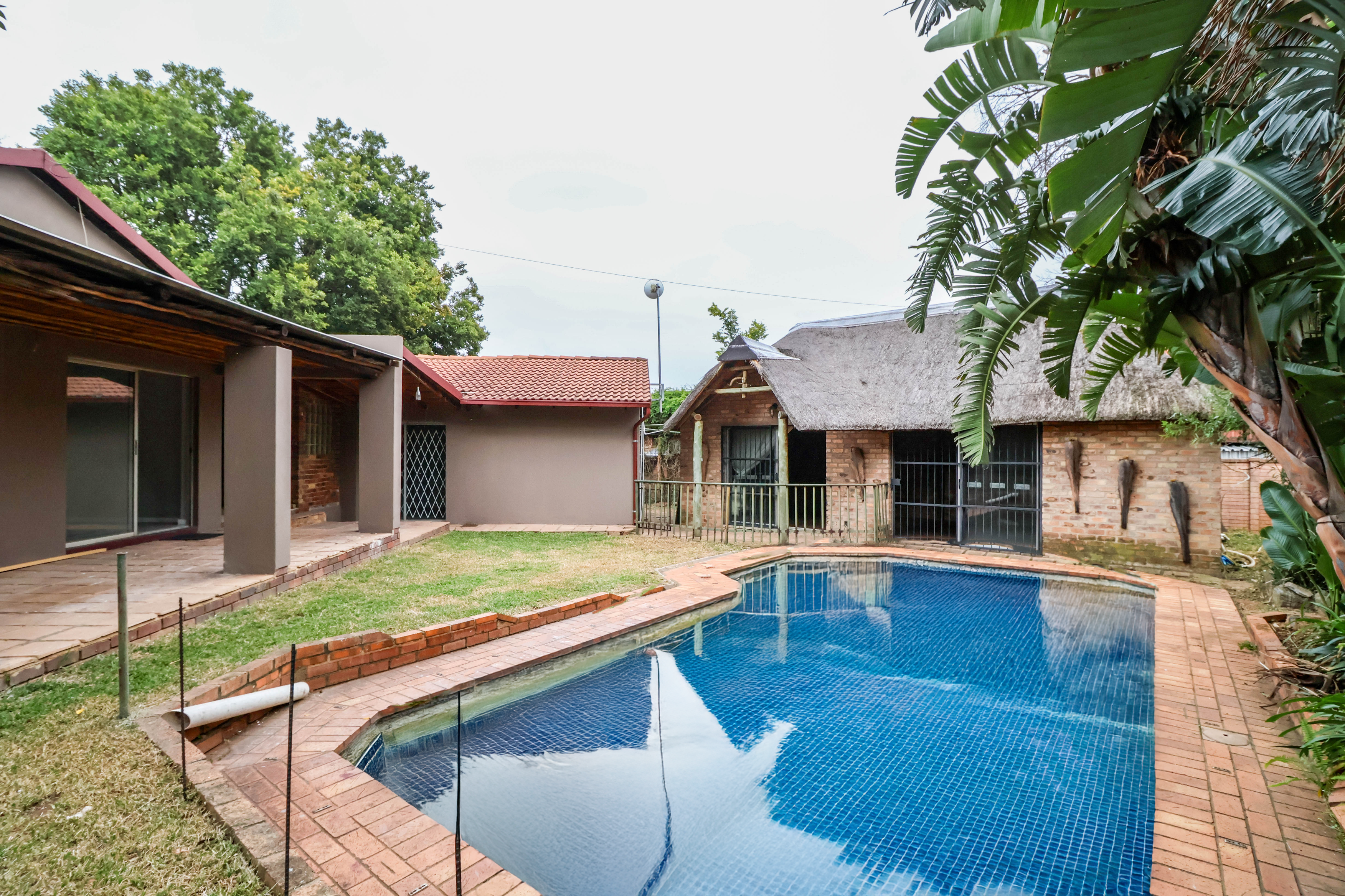 The inviting main residence features four bedrooms, two bathrooms, and a spacious dining and lounge area. The kitchen is well-equipped with ample cupboard space and room for two appliances. A fantastic addition is the covered extension next to the kitchen, which can be easily transformed into a laundry room, maximizing your kitchen space. The lounge opens up to two patios: one with a built-in bar, and the other a covered patio that overlooks the sparkling swimming pool, lapa, and lush garden.