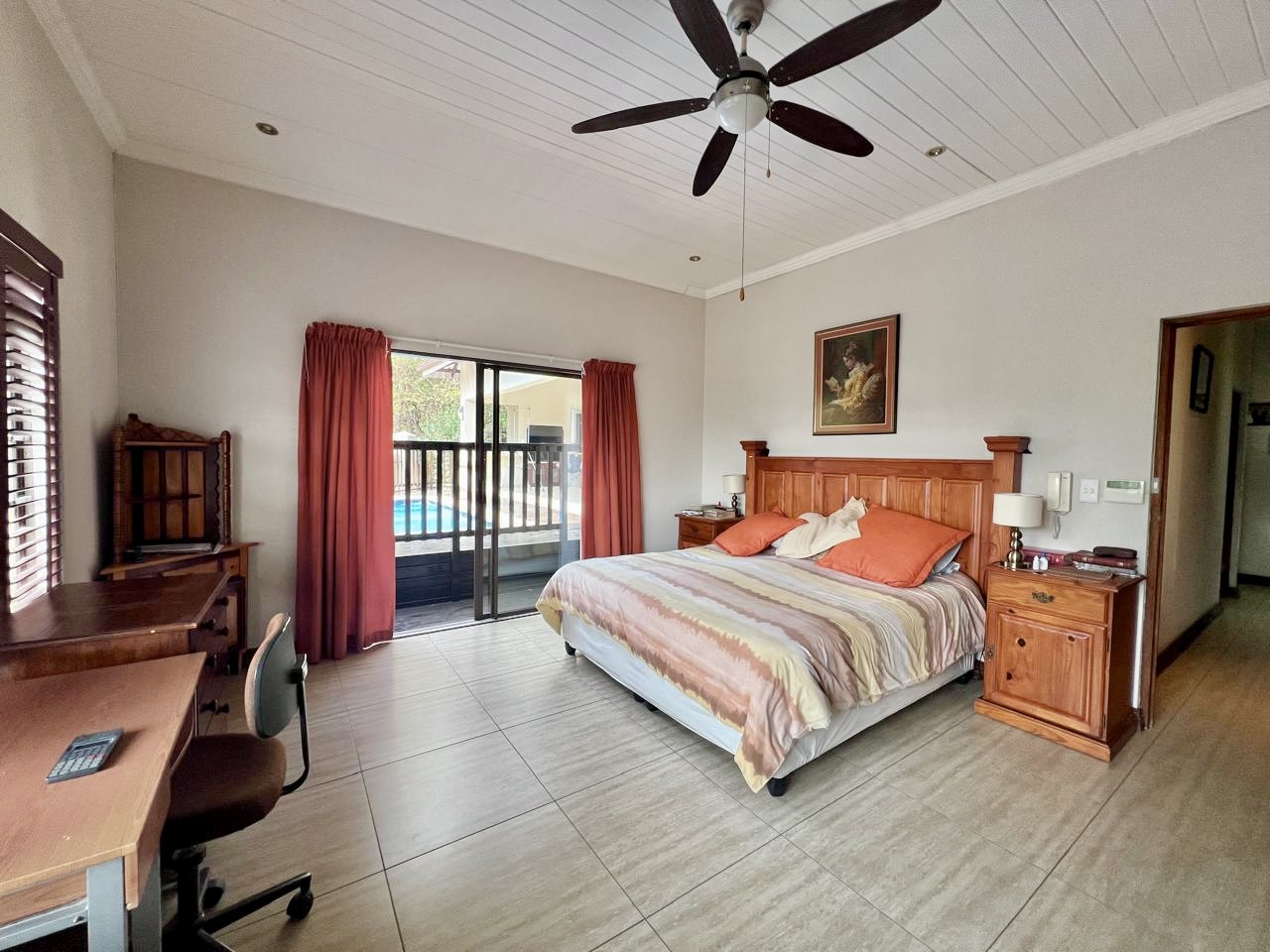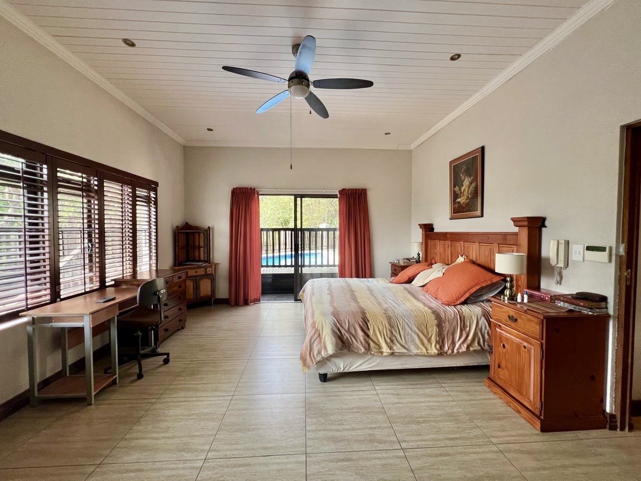 3 Bedrooms – Main suite with built-in wardrobes, ceiling fan, sliding doors to deck & pool, and a full en-suite bathroom. Additional 2 bedrooms include built-in wardrobes and ceiling fans.