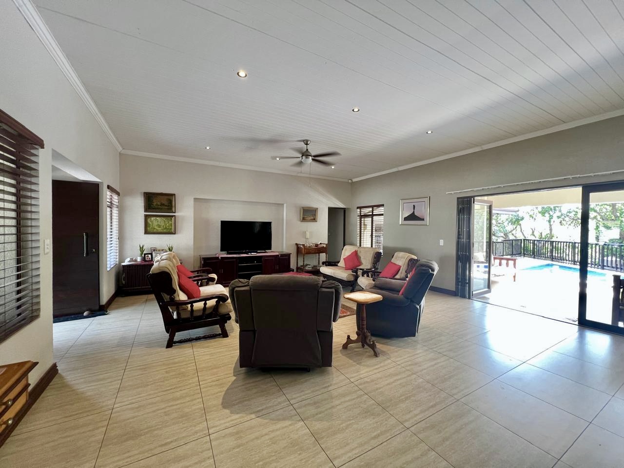 Entertainment Living – Expansive open-plan lounge and dining area with ceiling fans throughout. Entertainment lounge flows seamlessly to the outdoor deck with built-in braai and chlorine swimming pool.