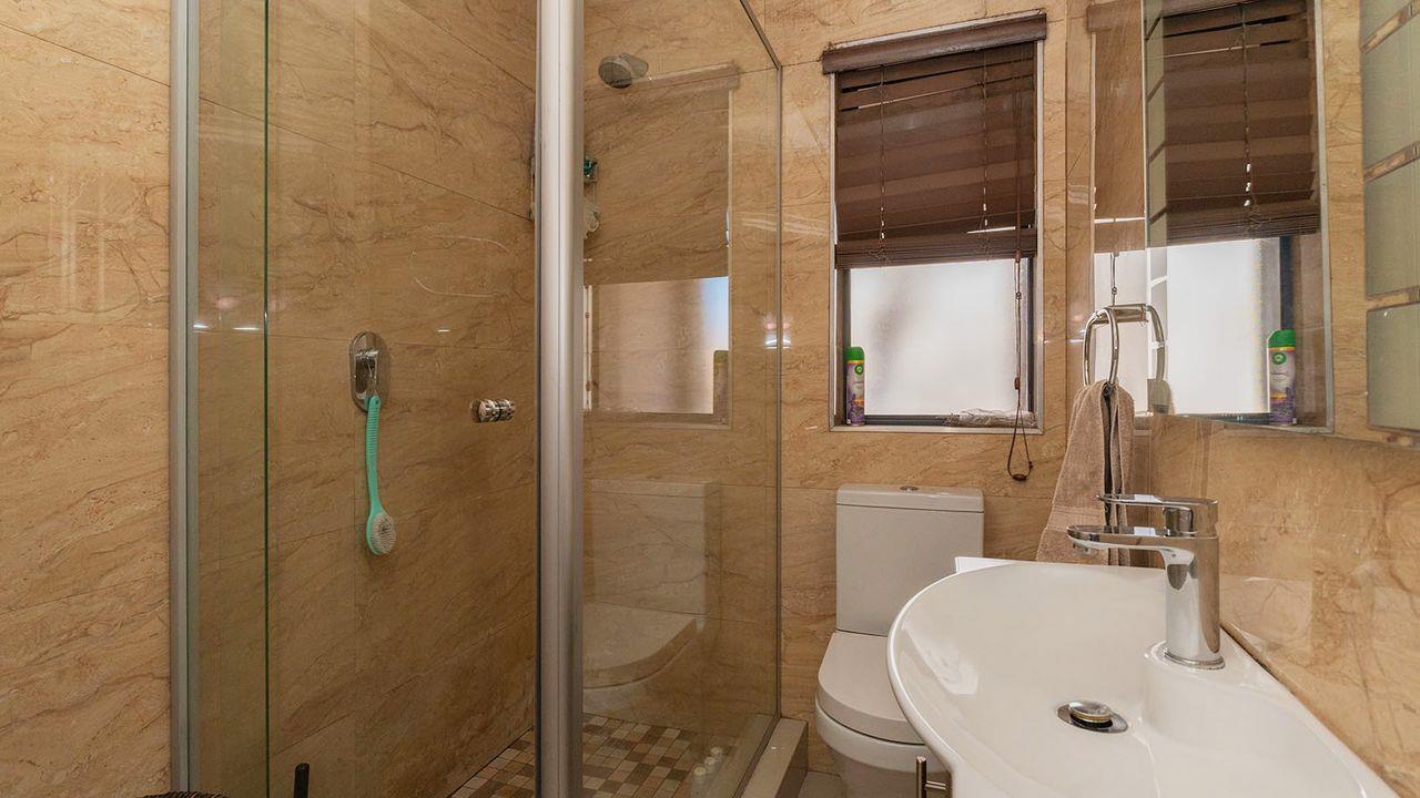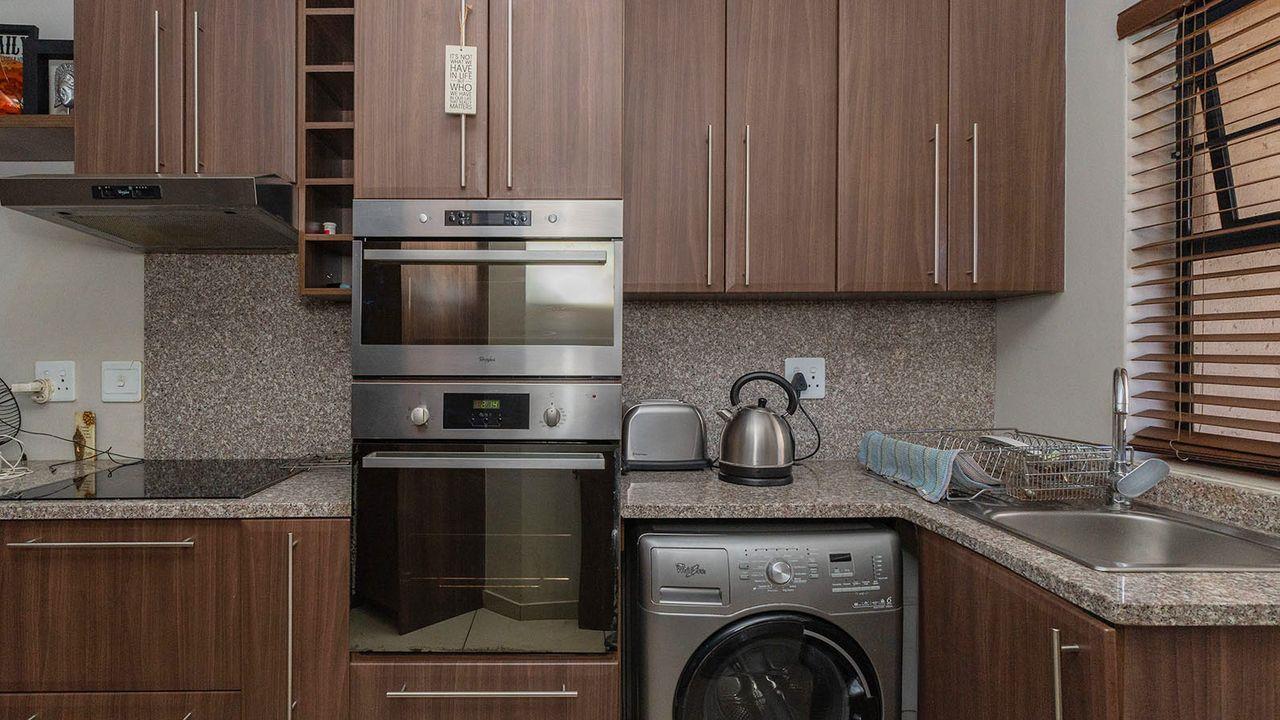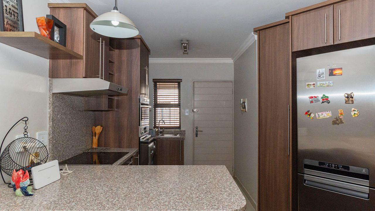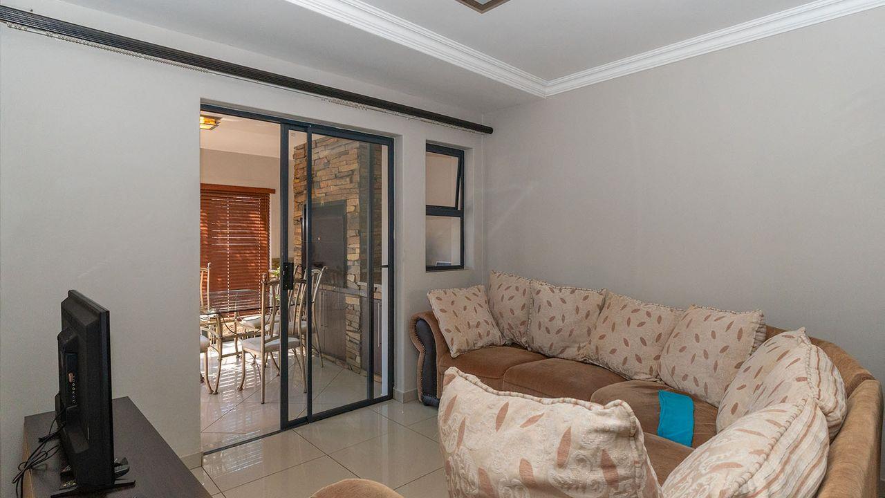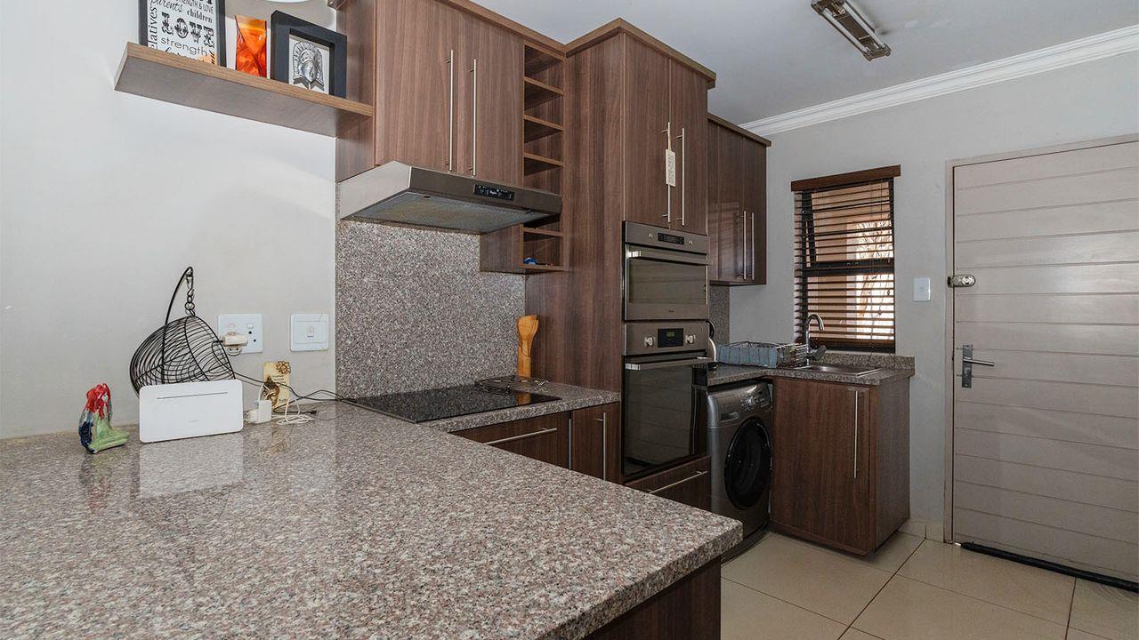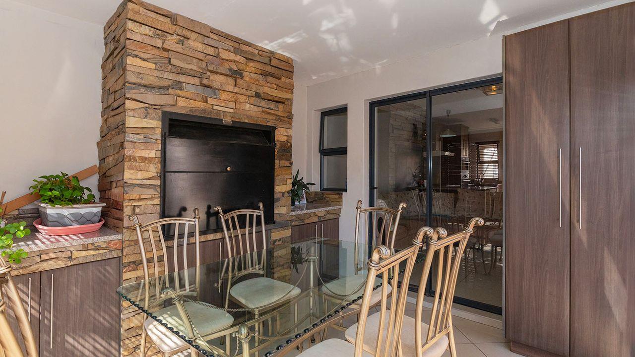 Upon opening your front door, you are greeted by a large open-plan lounge and renovated kitchen, featuring granite countertops and ample cupboard space. The kitchen includes an electric oven and hob, and space for one under-counter appliance. Off the lounge, you have access to an enclosed patio with a built-in braai, perfect for entertaining.