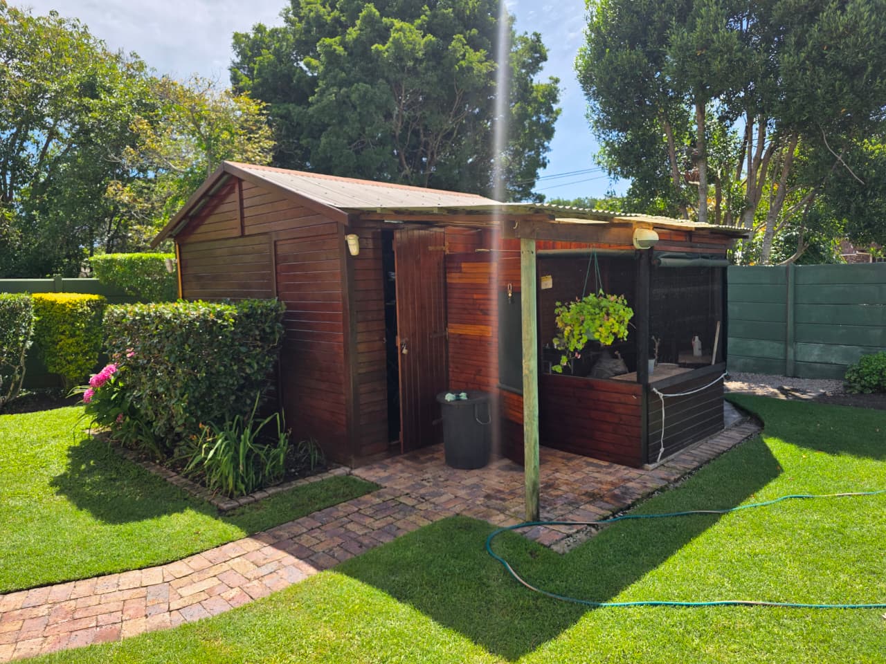 Sliding doors open onto a beautifully designed undercover patio, featuring a built-in braai, full lighting for evening entertainment, and views over the immaculate, manicured lawn—the perfect setting for family gatherings or relaxed weekend braais.