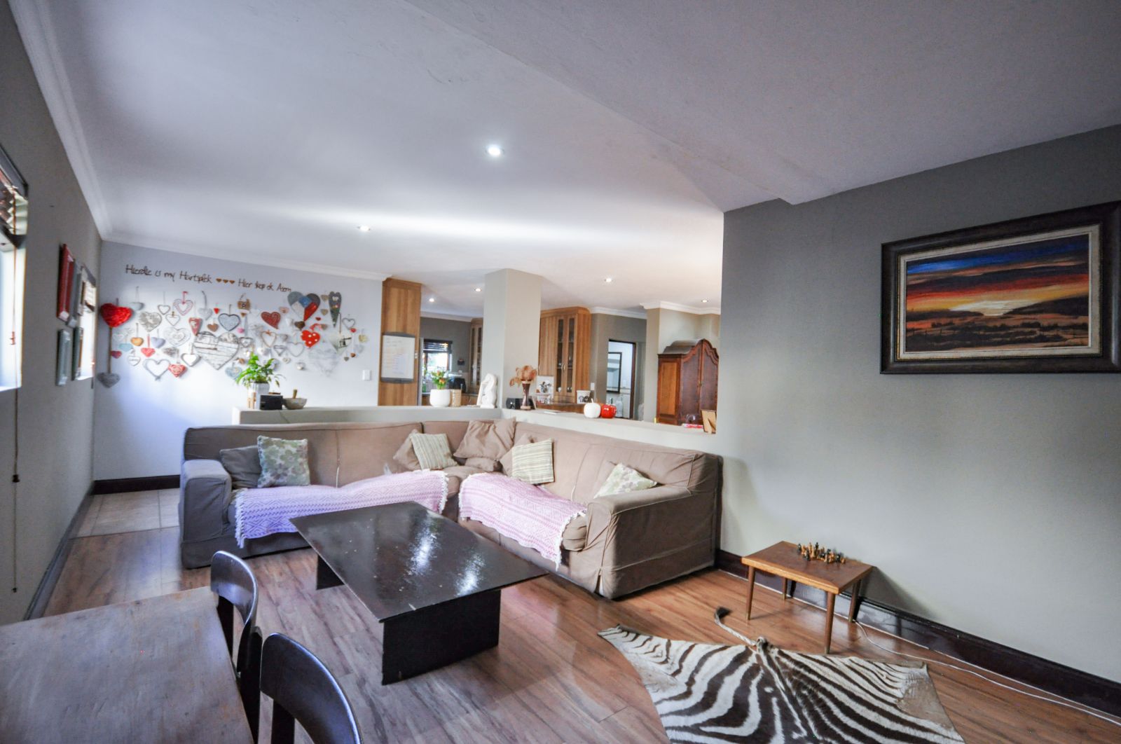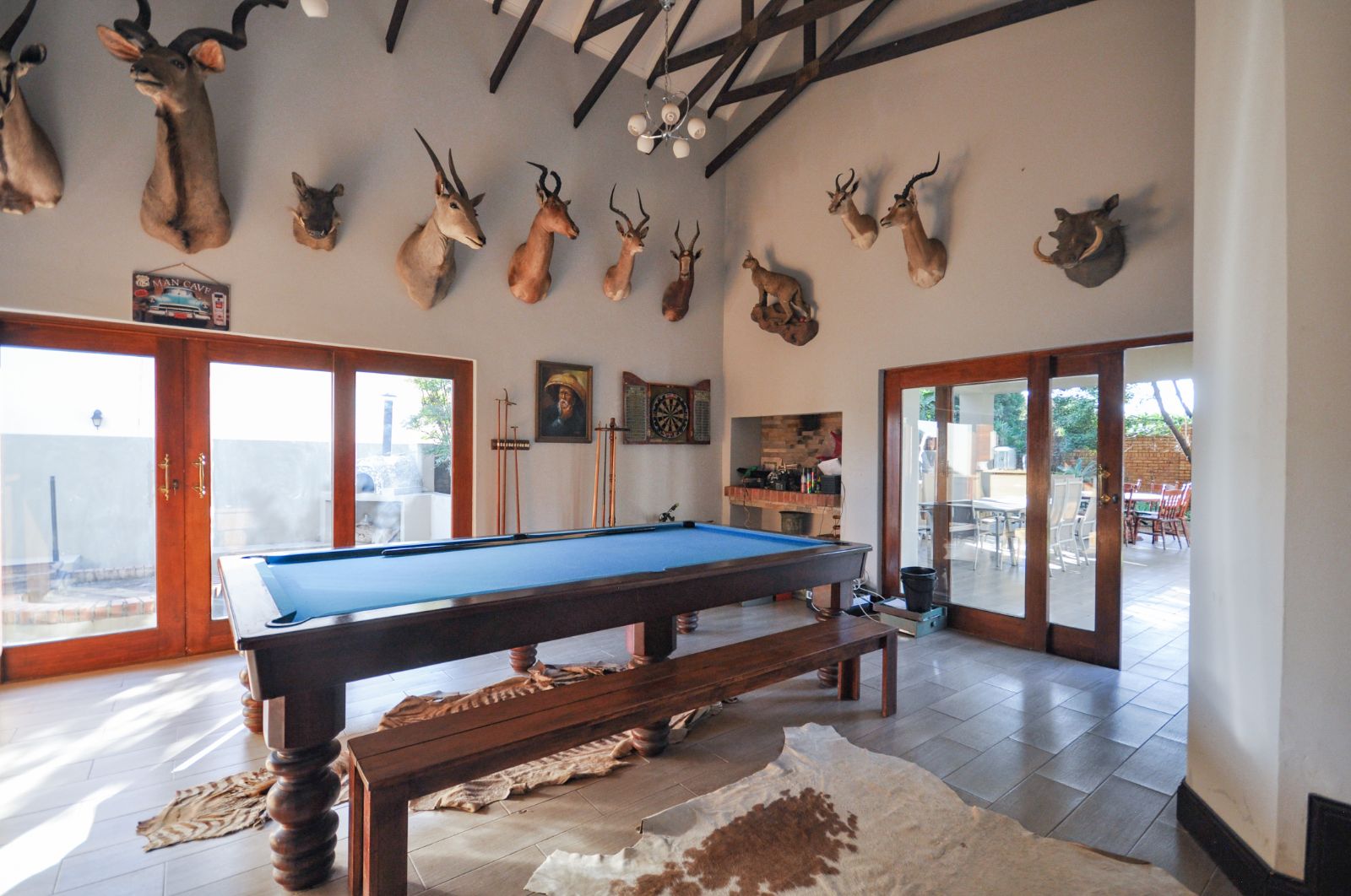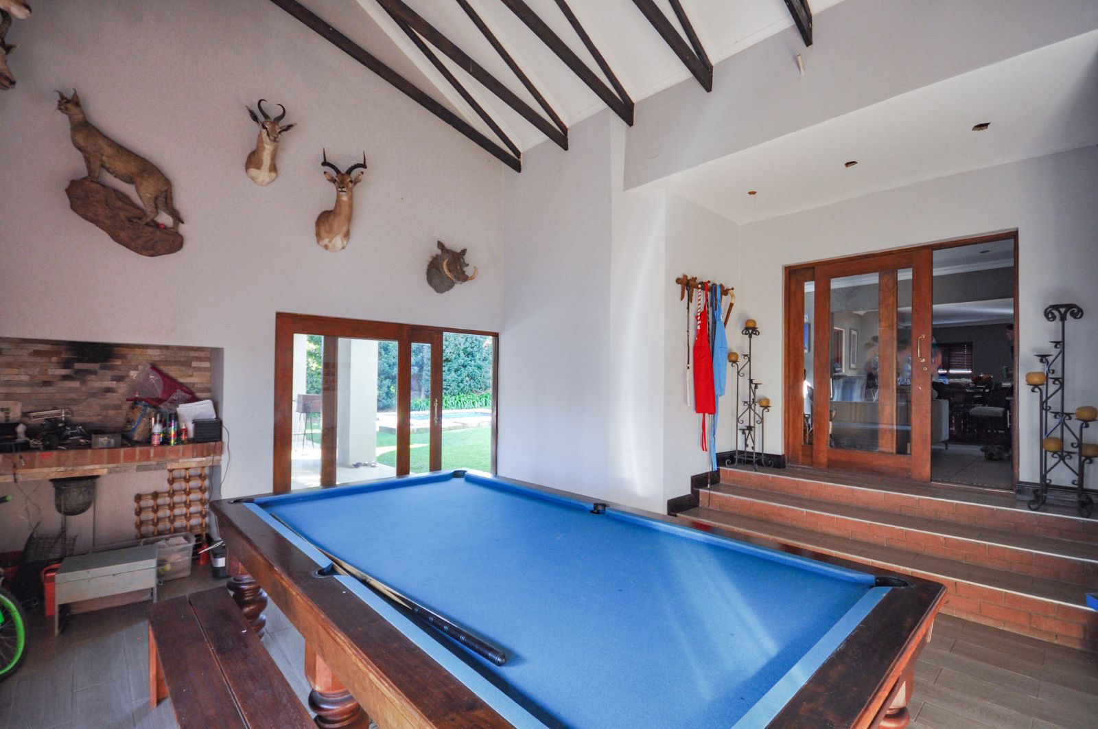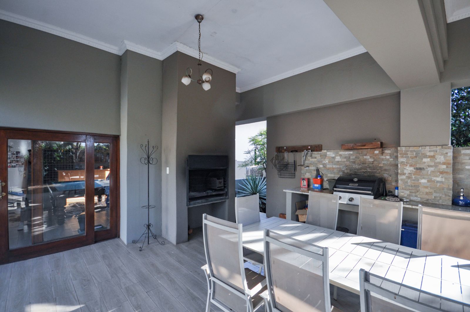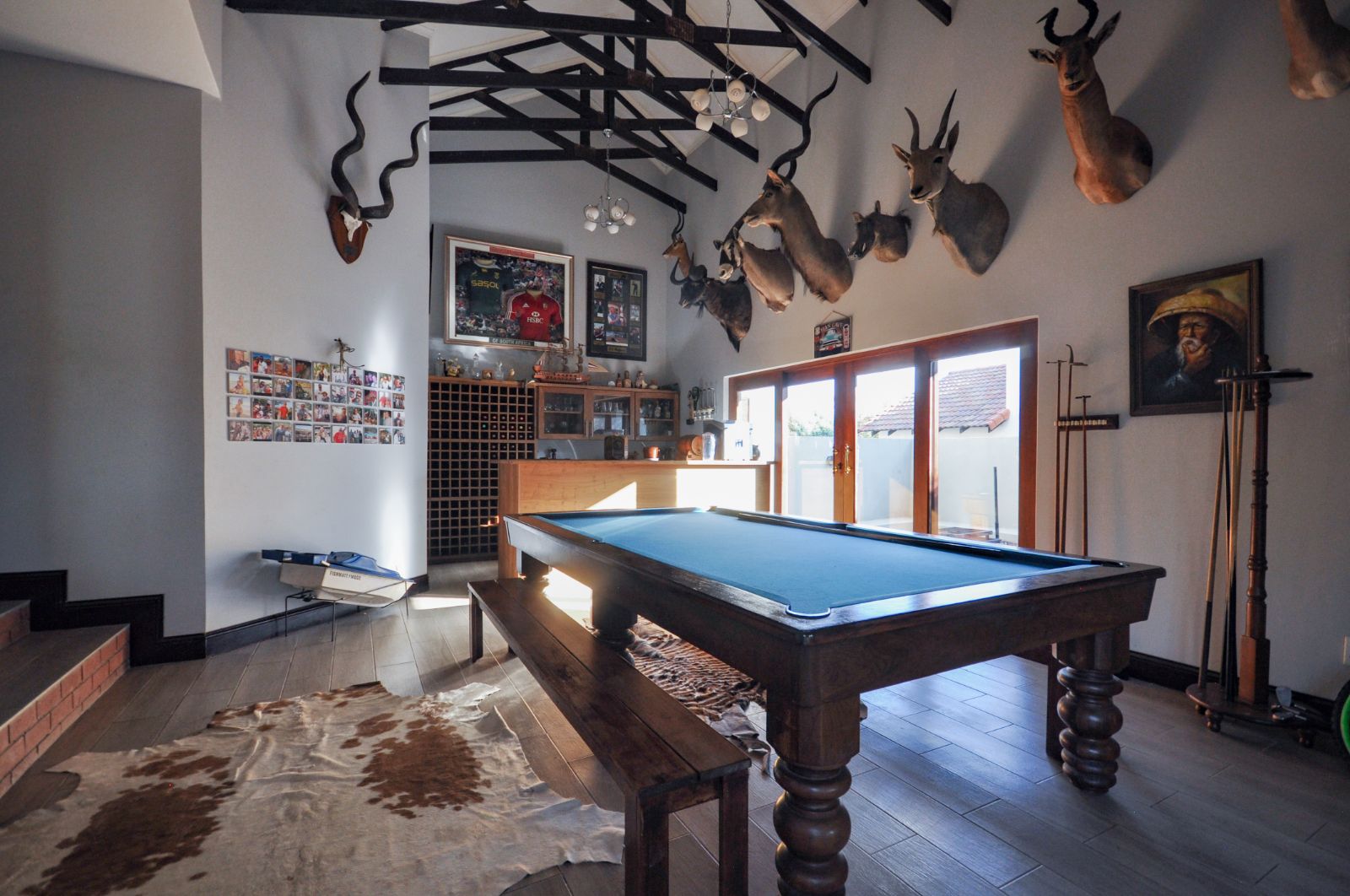 Flowing from the main Living room is a substantial additional Entertainment area, complete with a fitted bar and ample space to accommodate a pool table and other leisure furnishings. Wooden sliding doors reveal a large, covered Patio, which includes a built-in braai, four gas plates, and a delightful view of the expansive Garden—perfect for children to enjoy—as well as a heated swimming Pool for those sunlit days.
