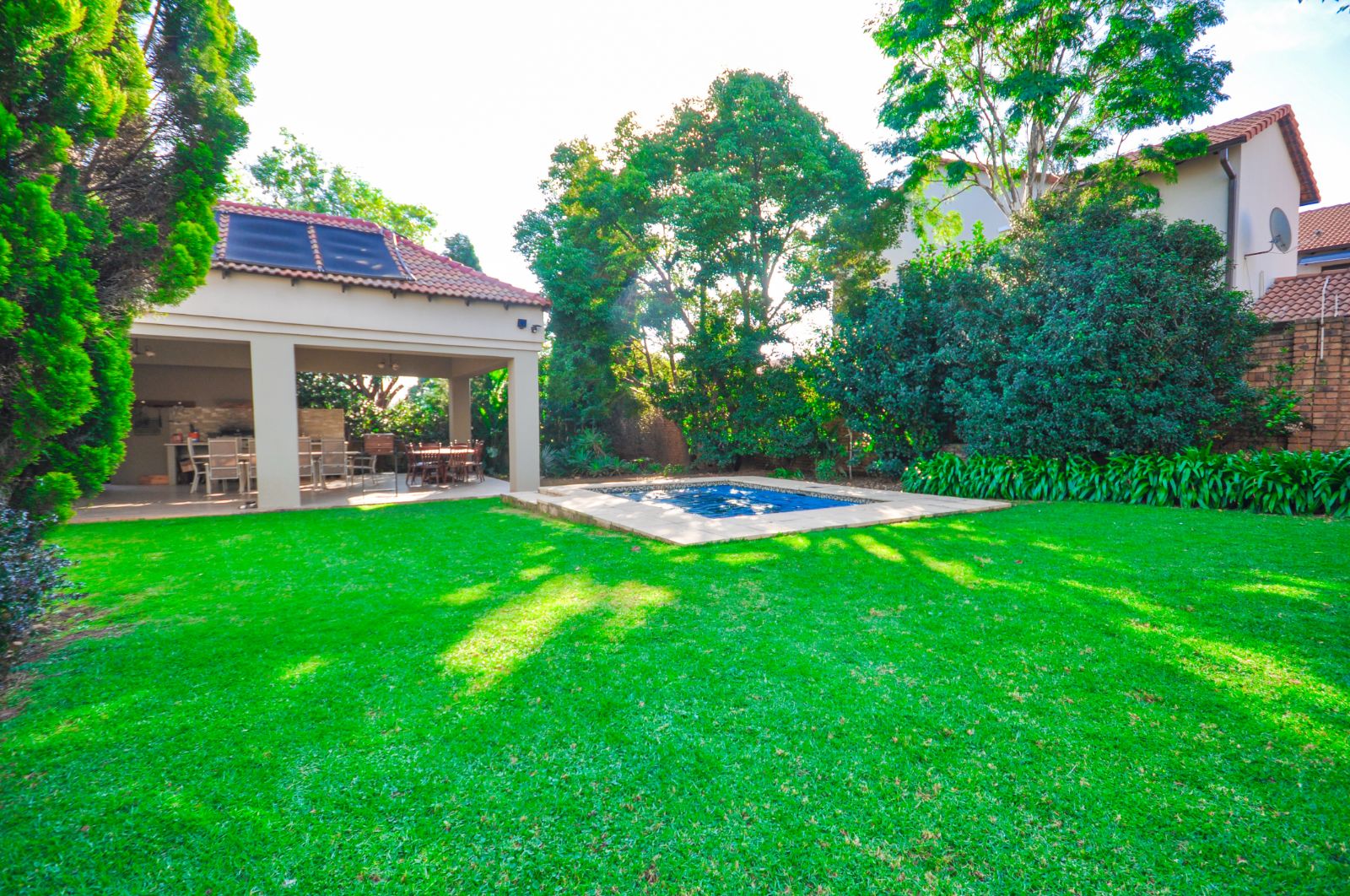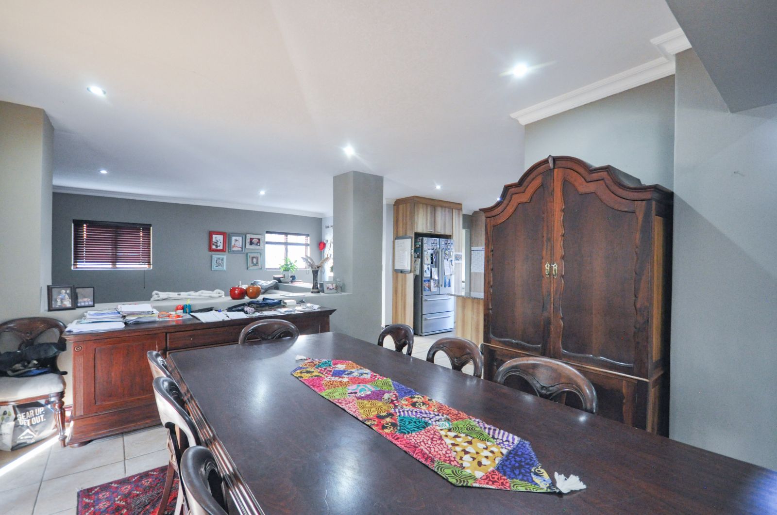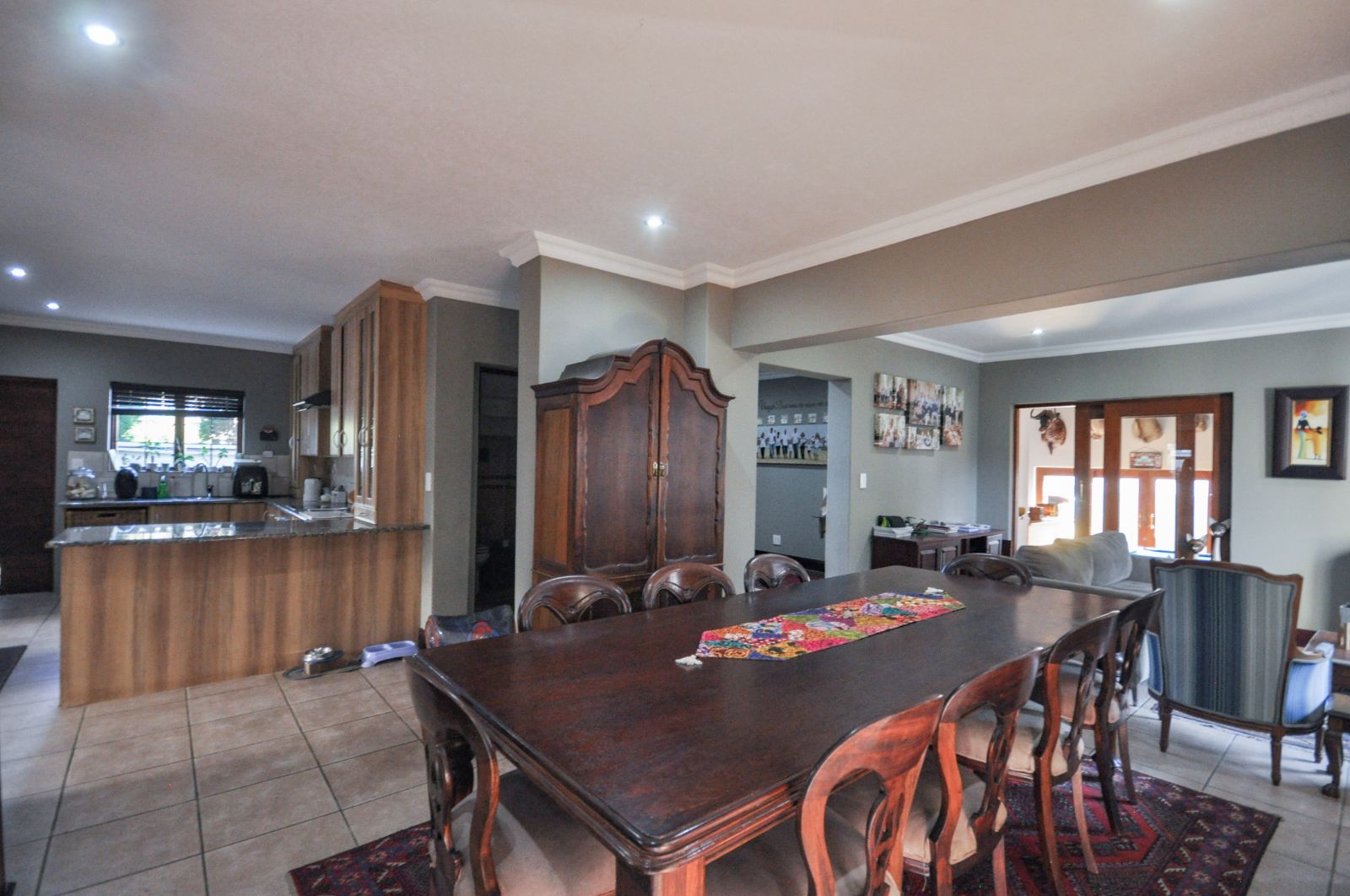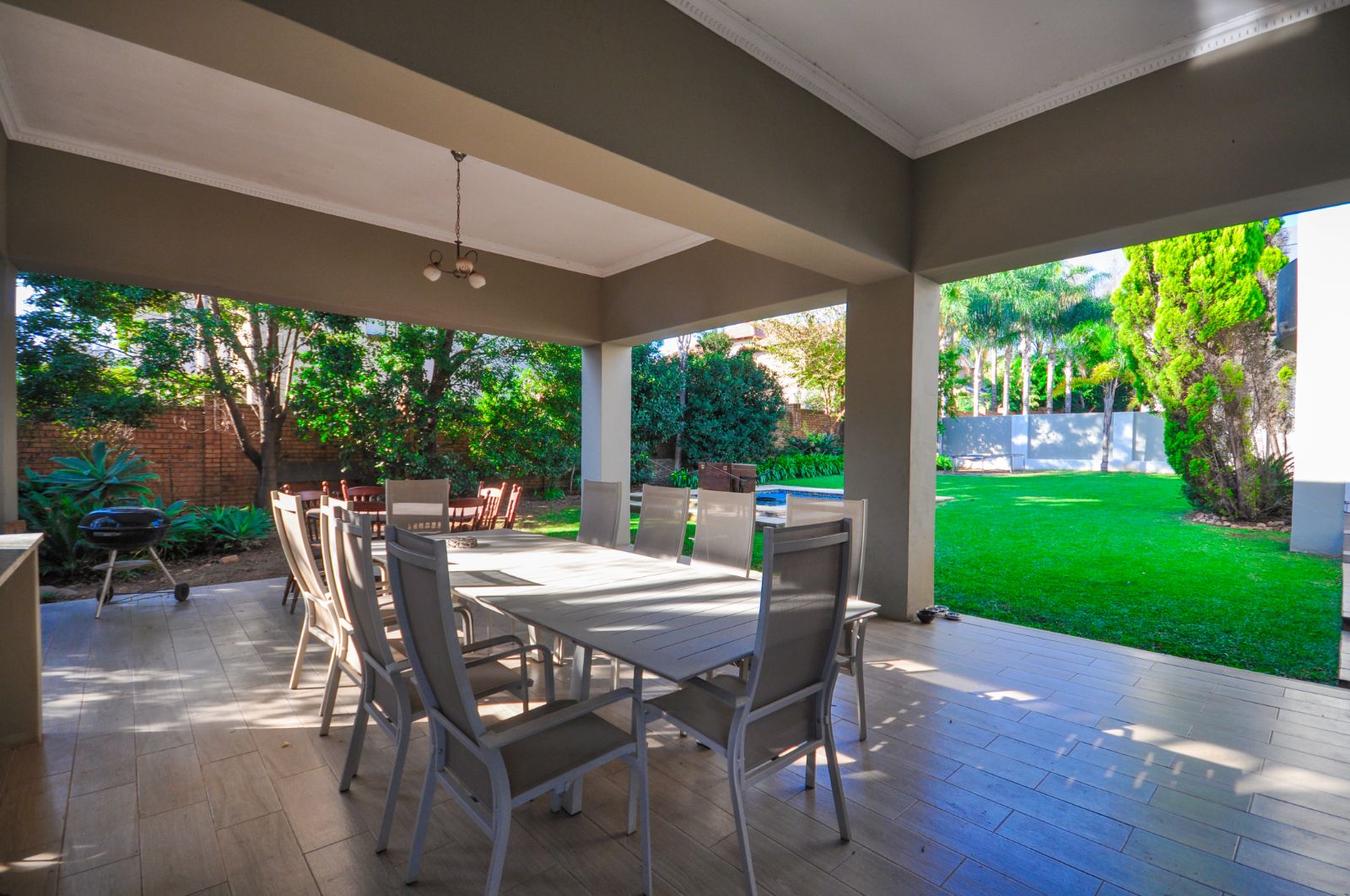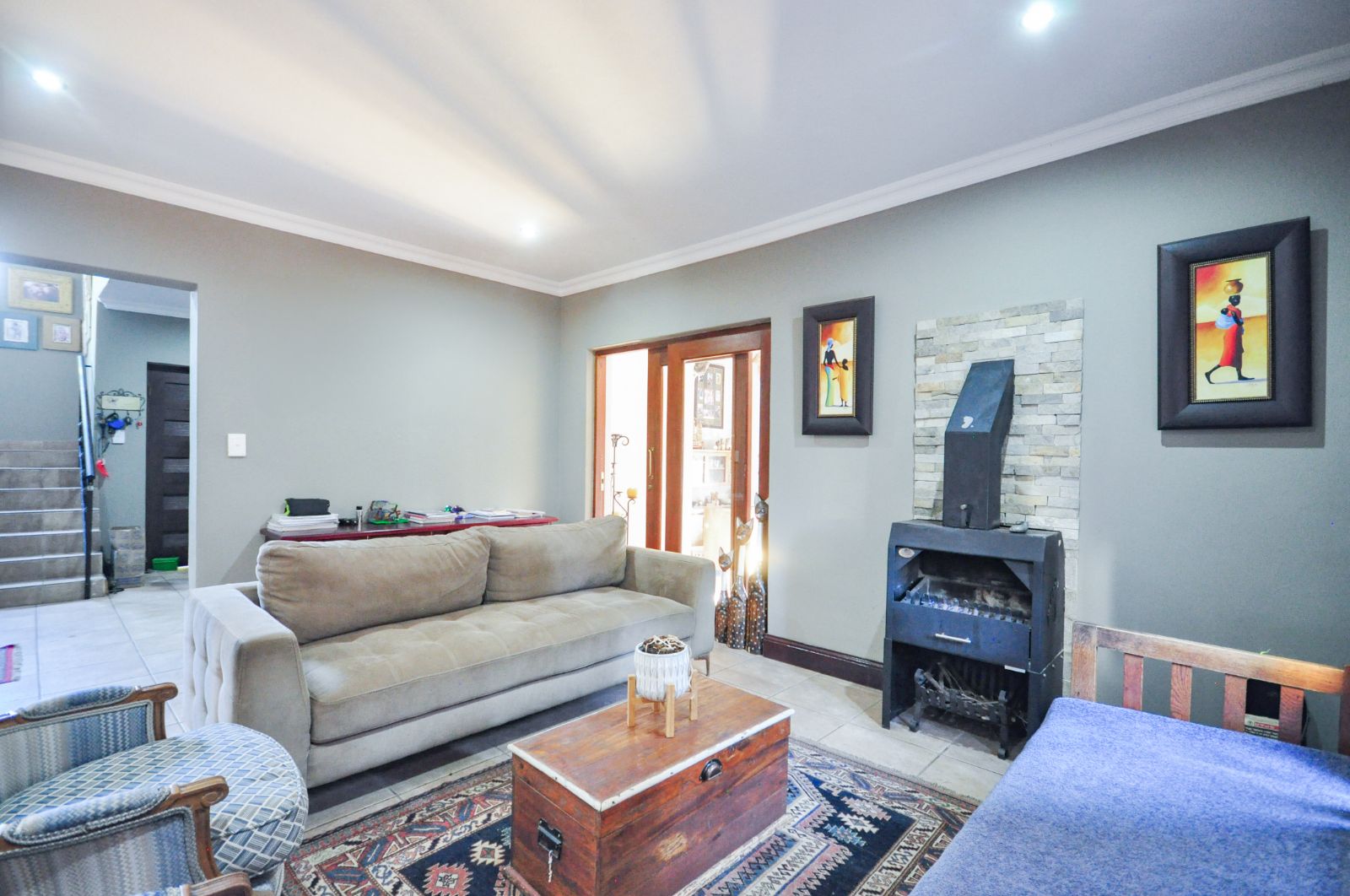 Flowing from the main Living room is a substantial additional Entertainment area, complete with a fitted bar and ample space to accommodate a pool table and other leisure furnishings. Wooden sliding doors reveal a large, covered Patio, which includes a built-in braai, four gas plates, and a delightful view of the expansive Garden—perfect for children to enjoy—as well as a heated swimming Pool for those sunlit days.