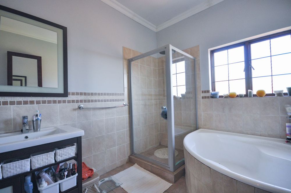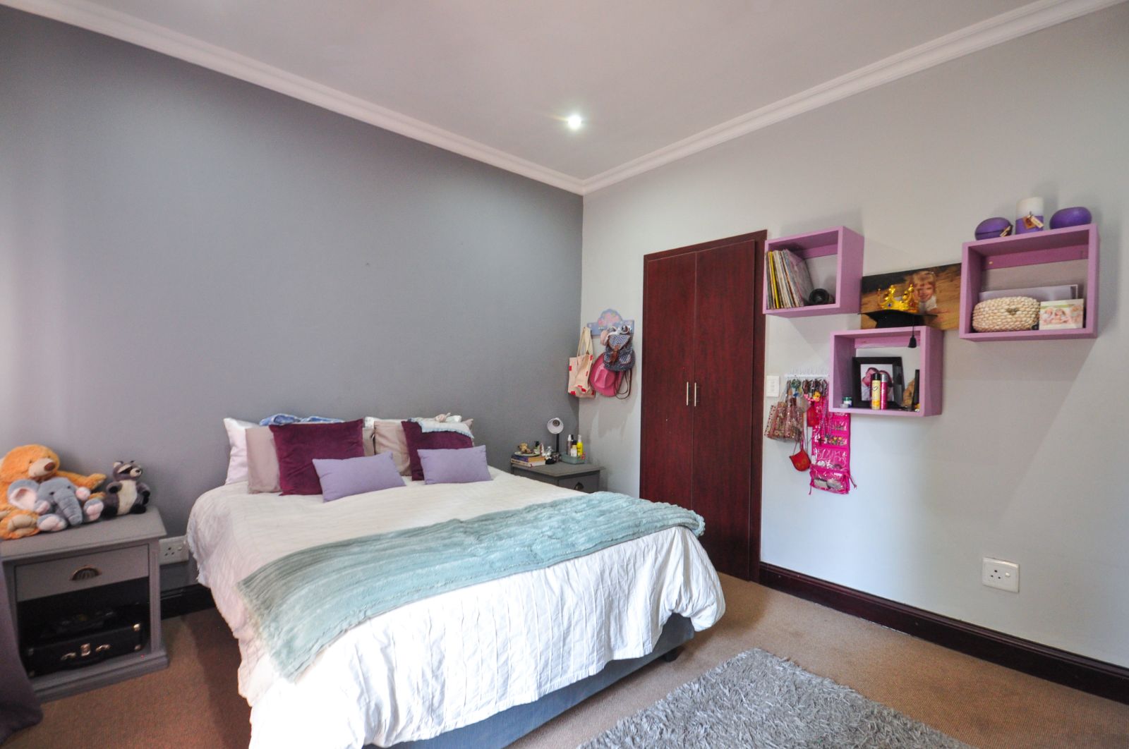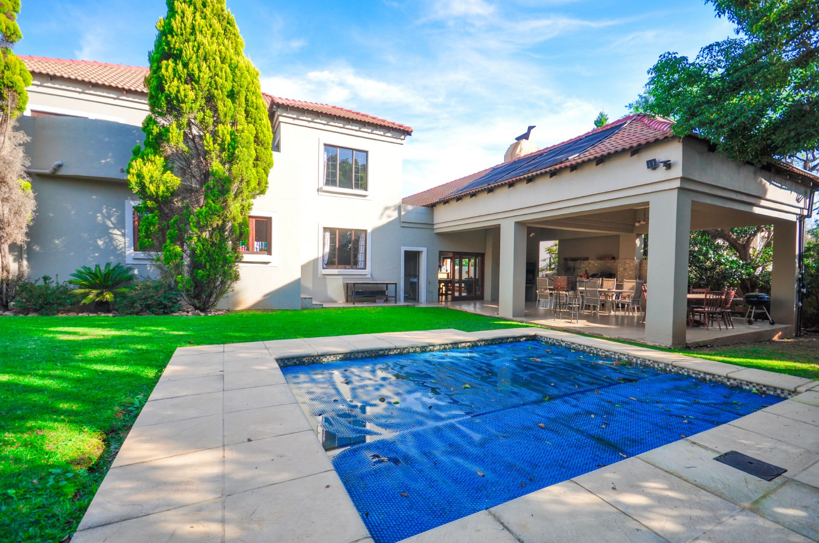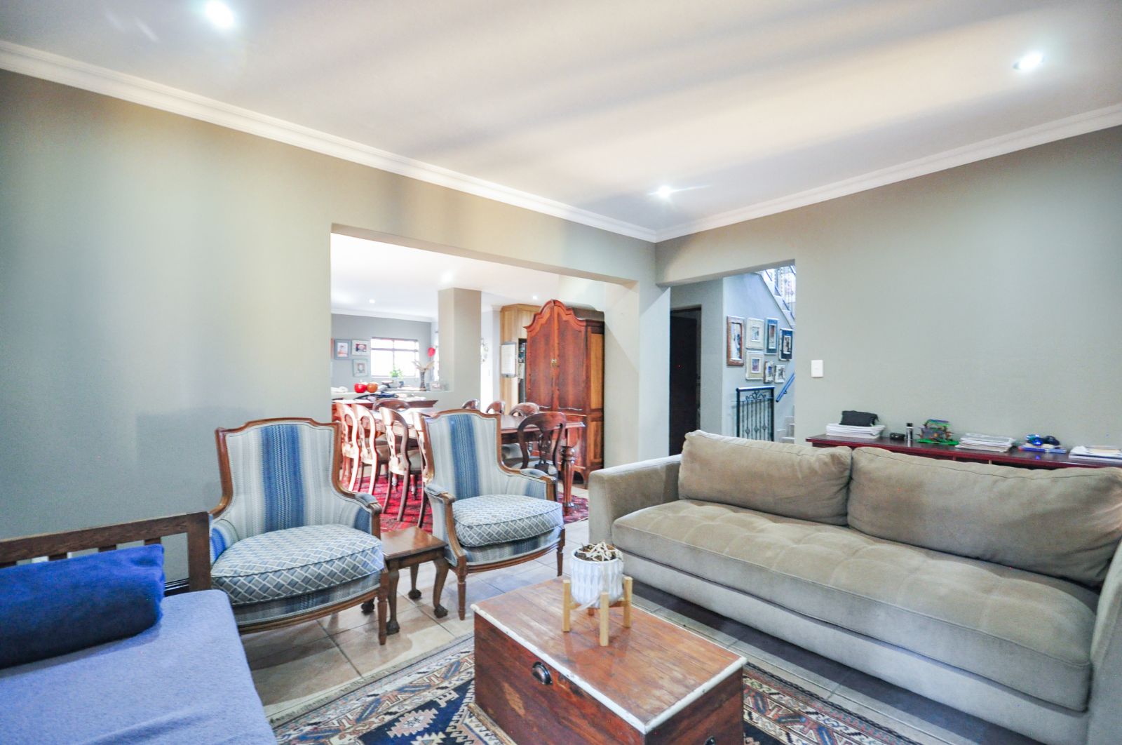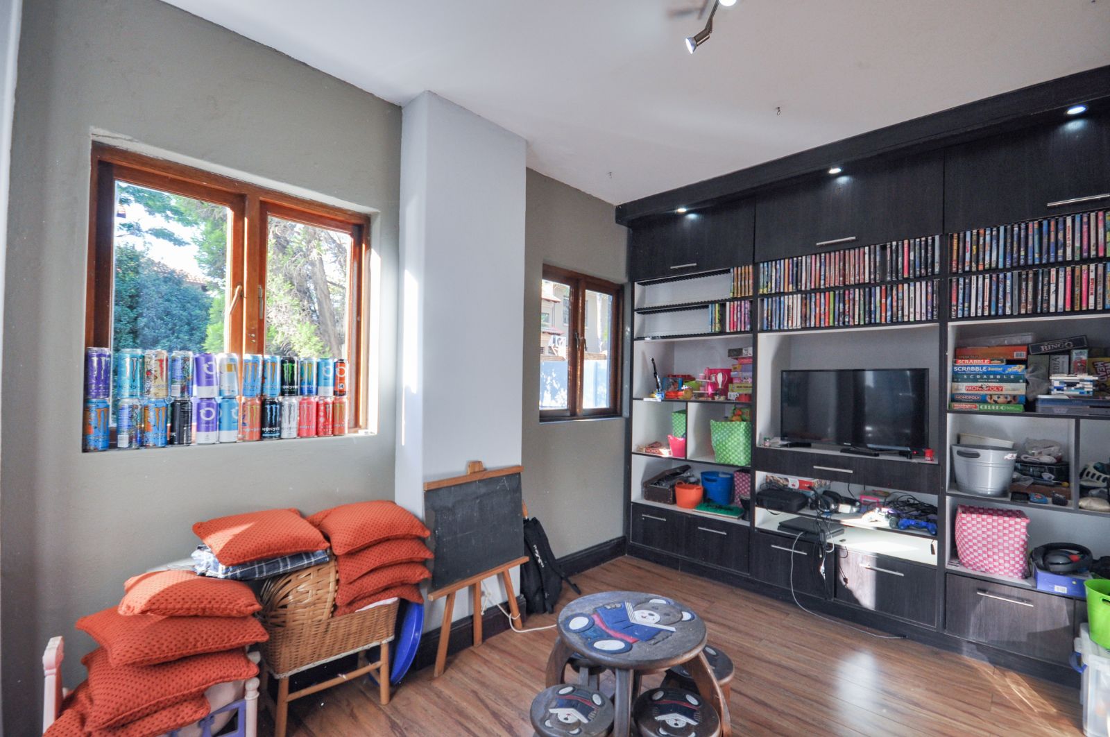 Flowing from the main Living room is a substantial additional Entertainment area, complete with a fitted bar and ample space to accommodate a pool table and other leisure furnishings. Wooden sliding doors reveal a large, covered Patio, which includes a built-in braai, four gas plates, and a delightful view of the expansive Garden—perfect for children to enjoy—as well as a heated swimming Pool for those sunlit days.