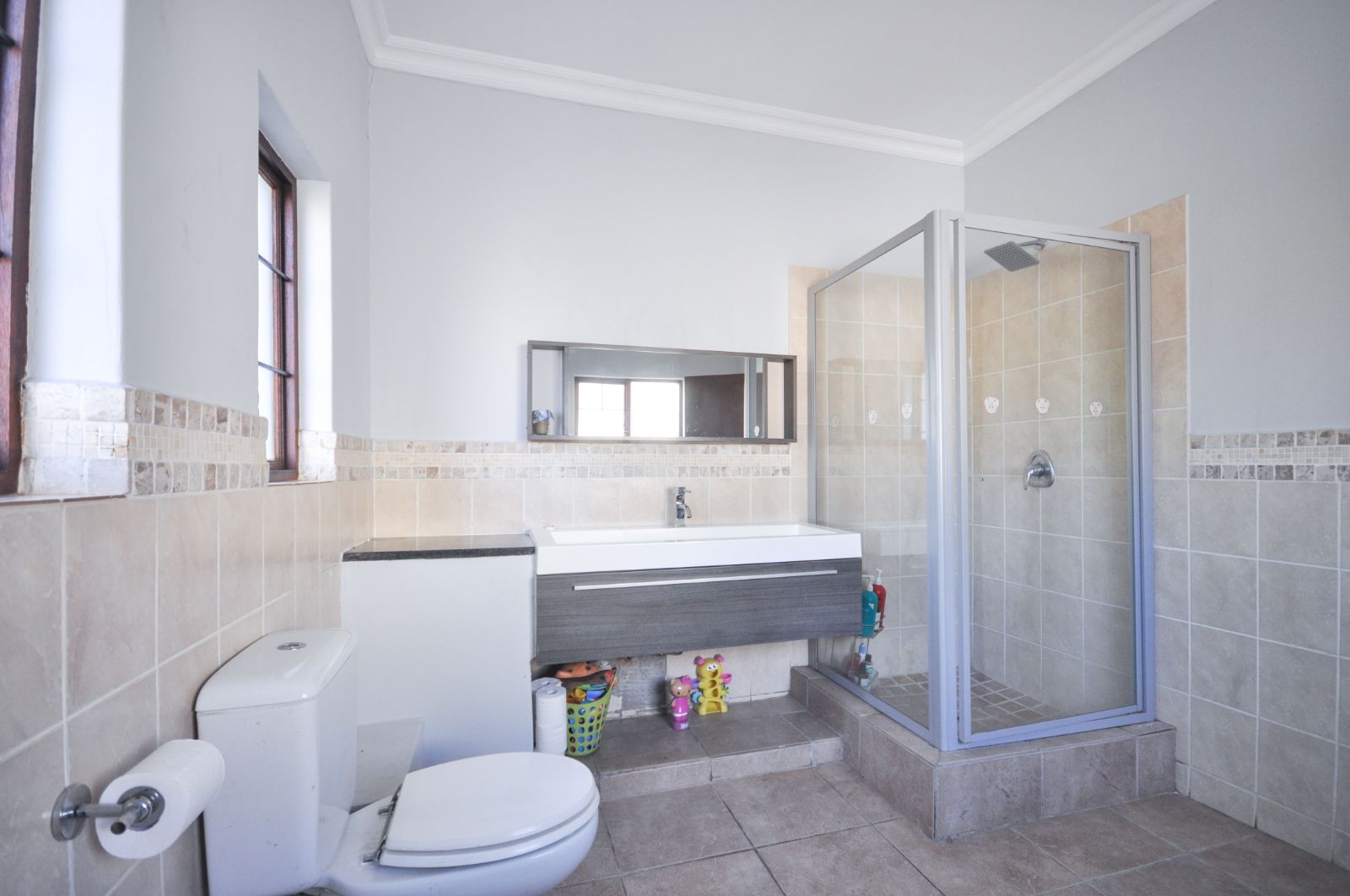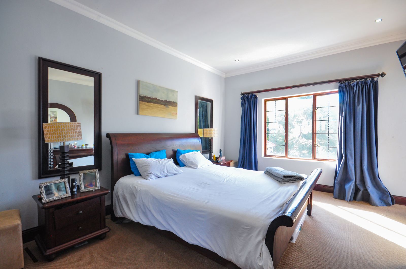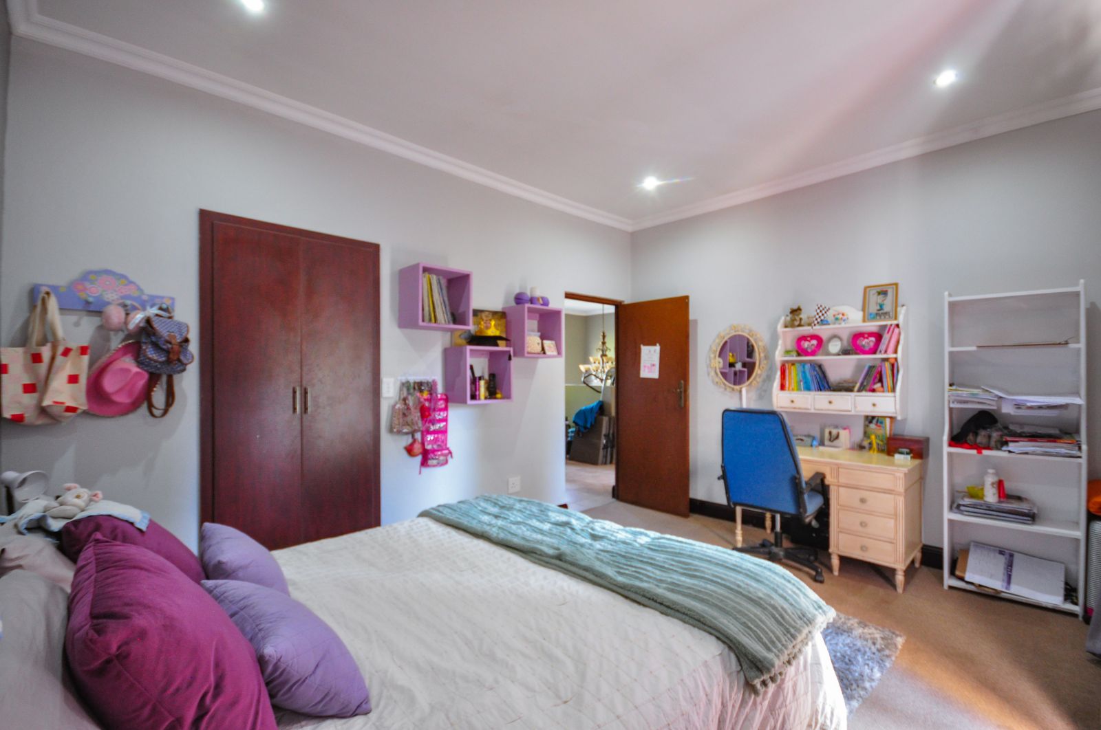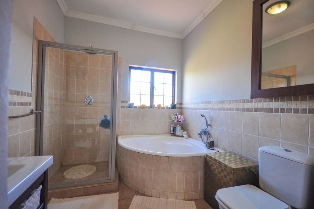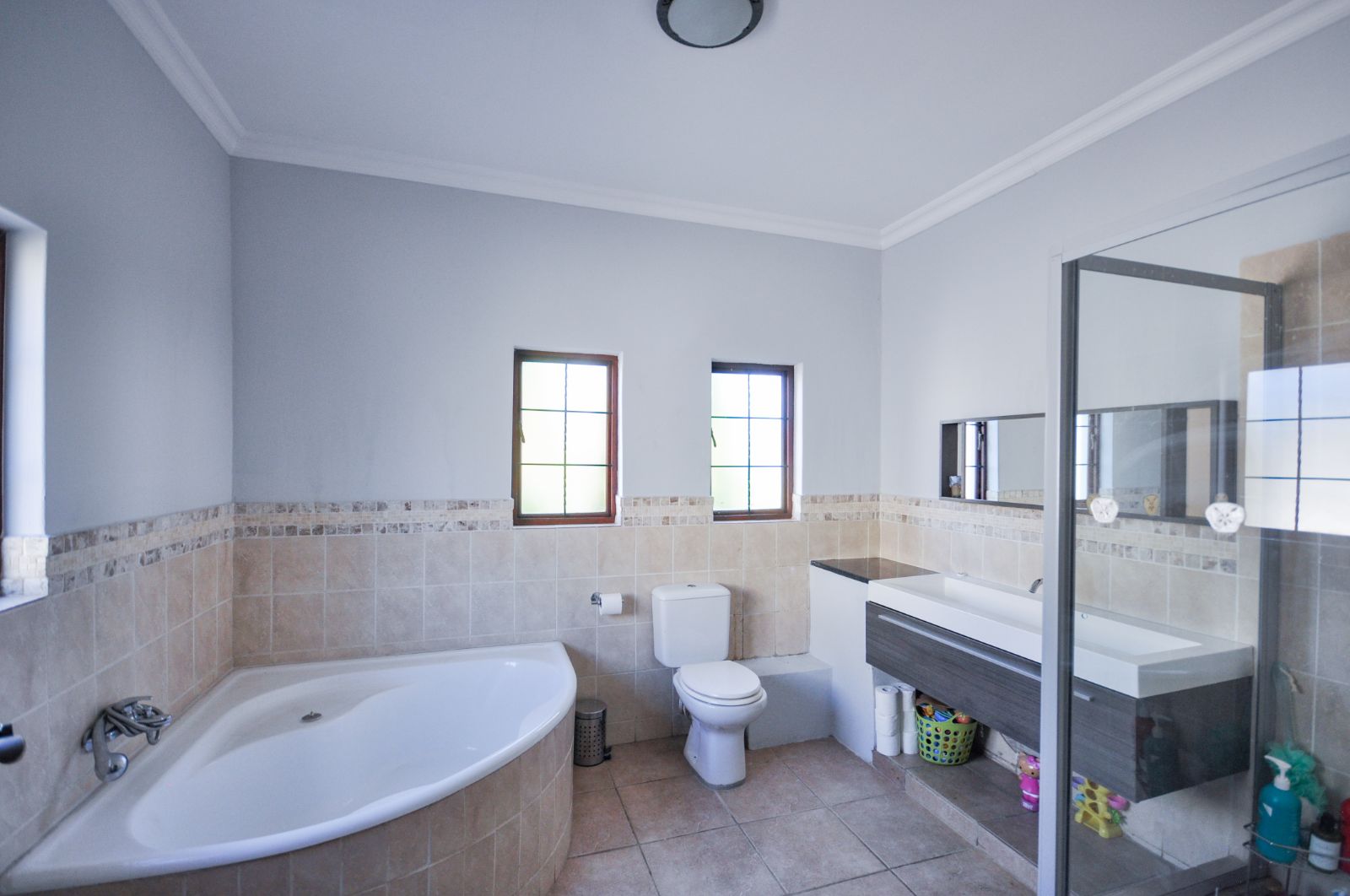 Flowing from the main Living room is a substantial additional Entertainment area, complete with a fitted bar and ample space to accommodate a pool table and other leisure furnishings. Wooden sliding doors reveal a large, covered Patio, which includes a built-in braai, four gas plates, and a delightful view of the expansive Garden—perfect for children to enjoy—as well as a heated swimming Pool for those sunlit days.