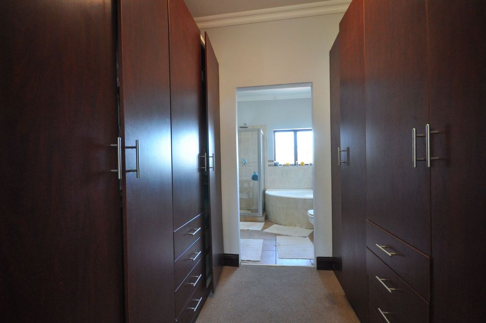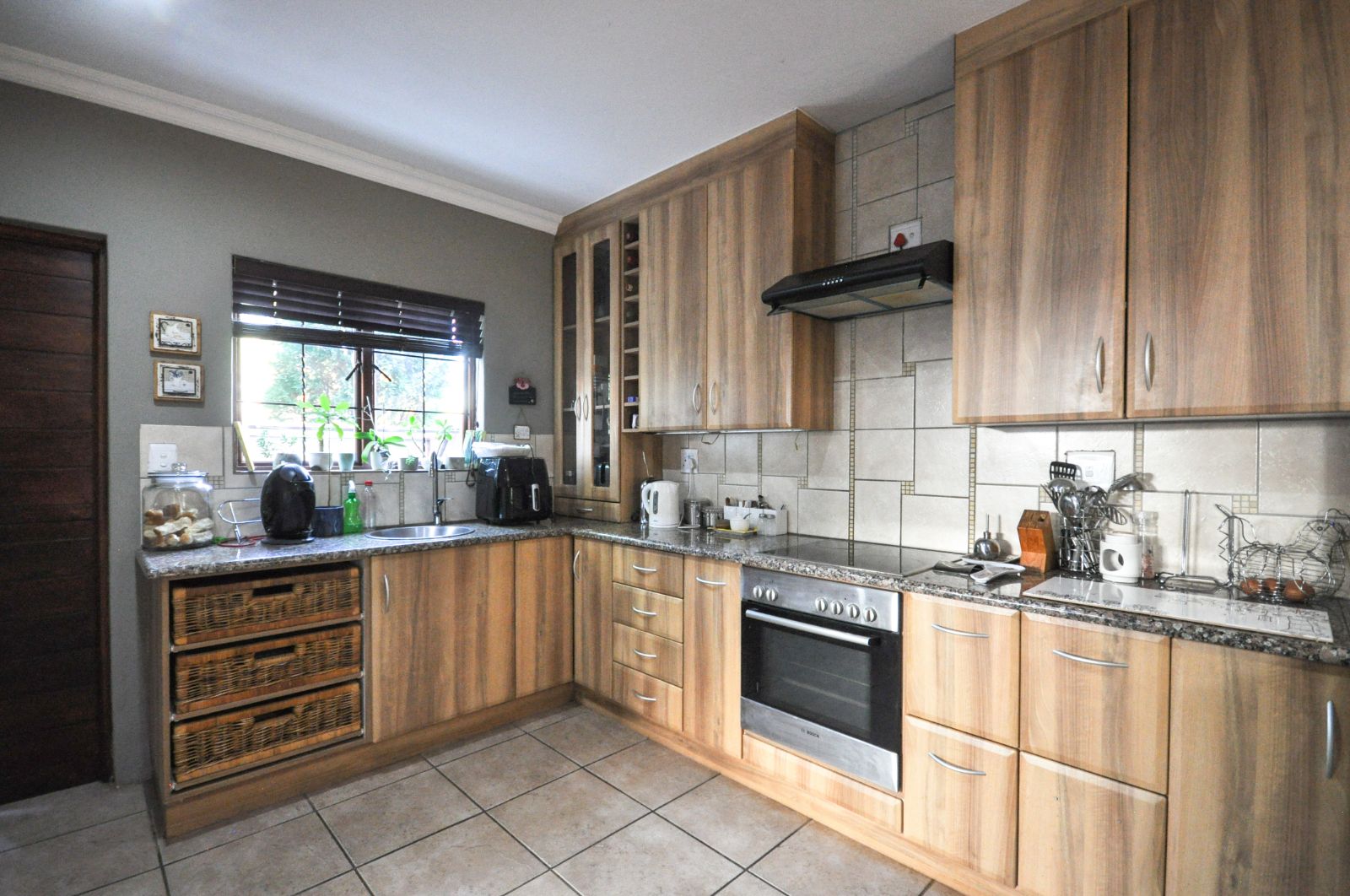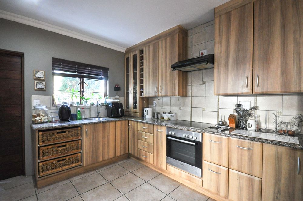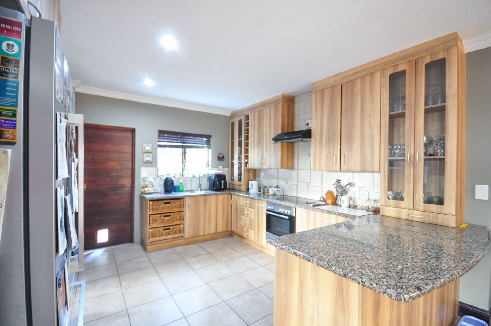 The open-plan Kitchen is appointed with granite countertops, an electric stove, and beautifully crafted cabinetry. A separate Scullery offers space for three electrical appliances, and a generous walk-in pantry enhances the functionality of the space. Adjacent to the Kitchen, a courtyard features a modestly covered area, ideal for the storage of tiles or miscellaneous items.
