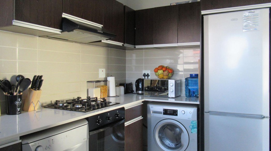 The apartment features a spacious bedroom with built-in cupboards and a full bathroom, complete with both a shower and bathtub. The open-plan living area flows seamlessly into a contemporary kitchen, making it the perfect space to relax or entertain.
