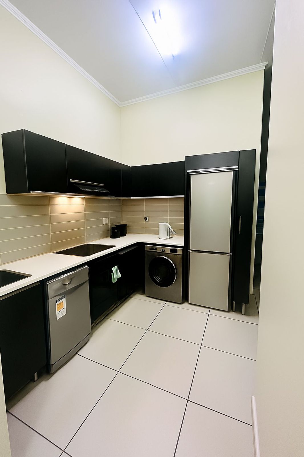 The modern kitchen is fully equipped with a fridge, washing machine, and dishwasher, and seamlessly connects to the open-plan lounge and dining area. A private balcony offers peaceful views, perfect for unwinding at the end of the day. The full bathroom includes both a bathtub and a shower.