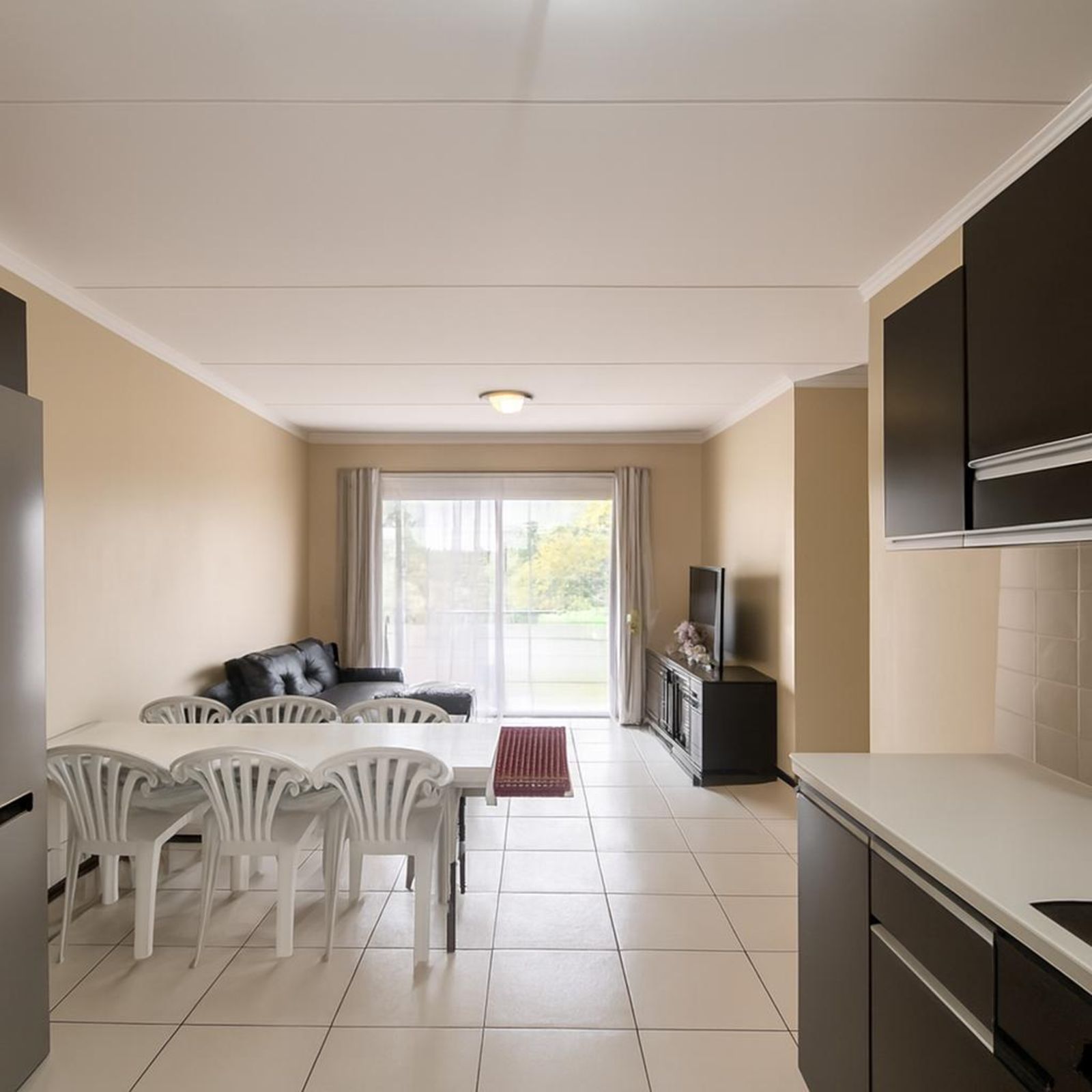 Open-plan living area leading to balcony