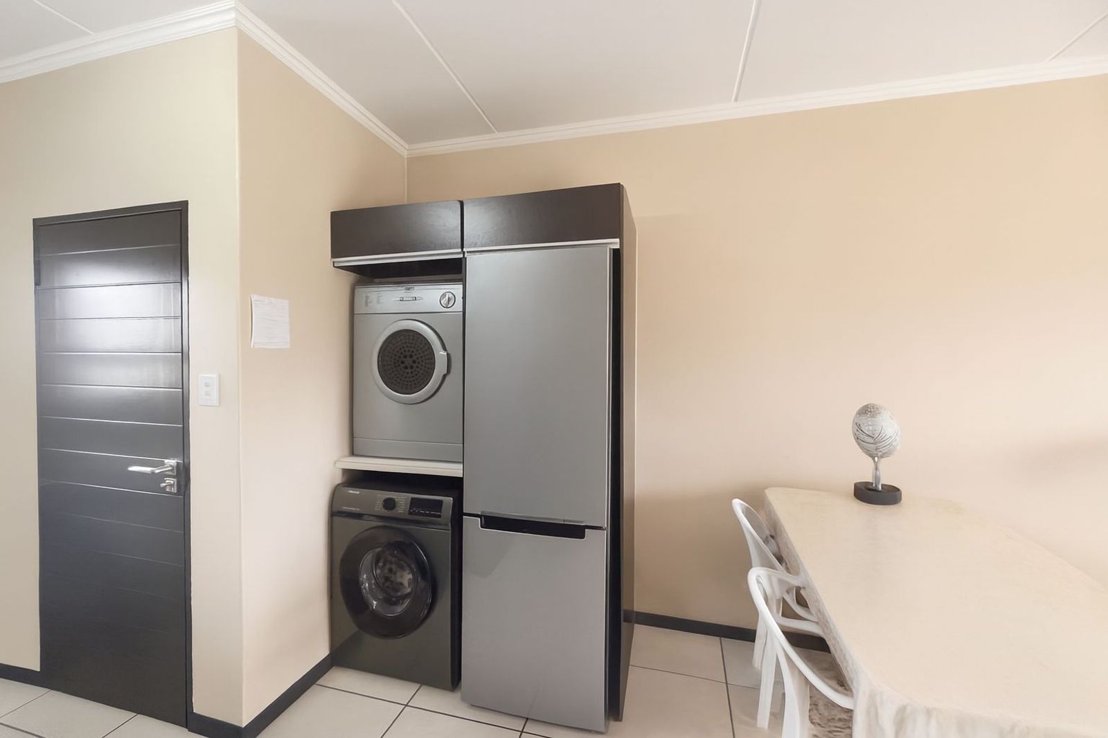 The home features a spacious open-plan kitchen, dining, and lounge area that flows effortlessly onto a private balcony, ideal for morning coffee or evening relaxation. The modern kitchen is fitted with Caesarstone countertops and includes integrated appliances – fridge, washing machine, dishwasher, and tumble dryer – for ultimate convenience.