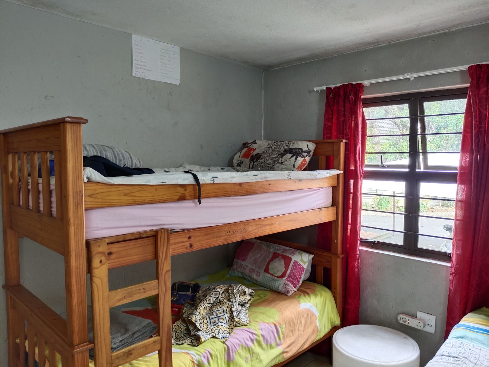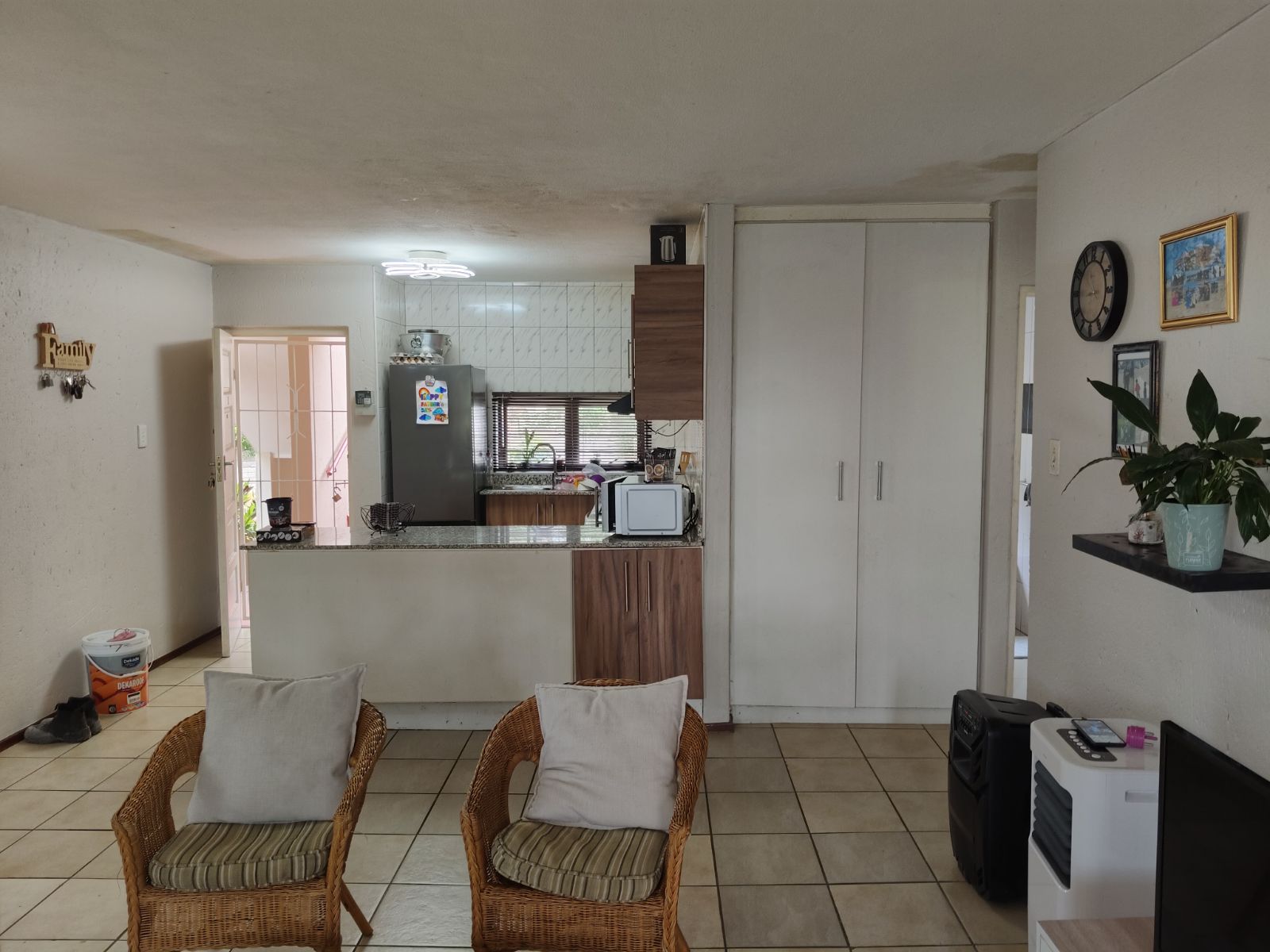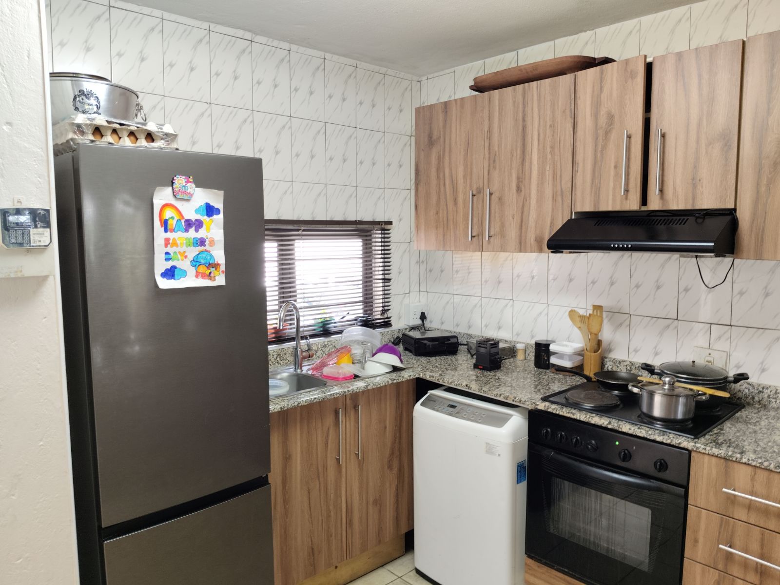 The open-plan kitchen has stone tops, generous cupboard space, a double sink, an under counter oven & plumbing for appliances.