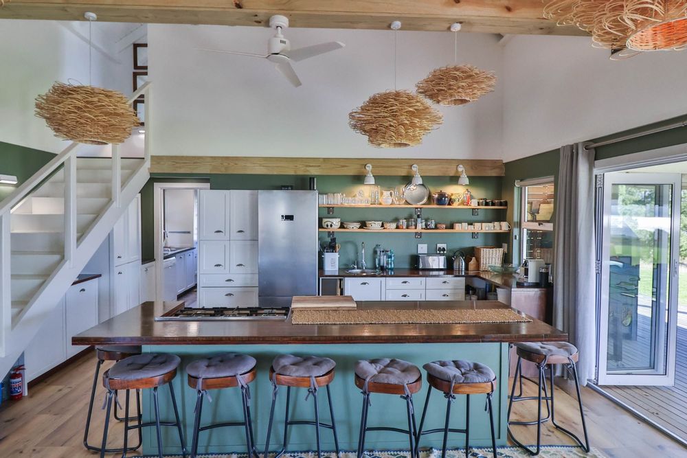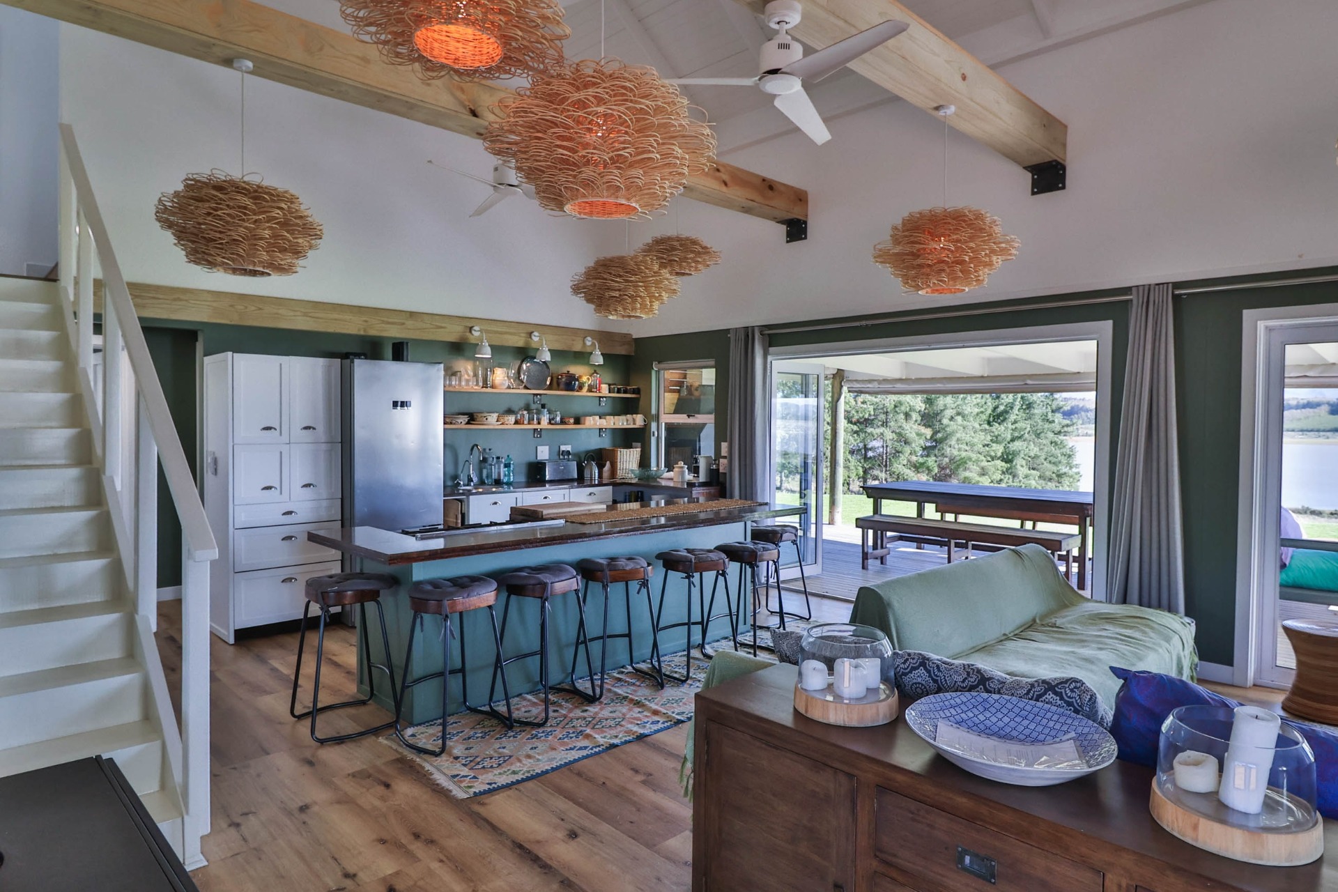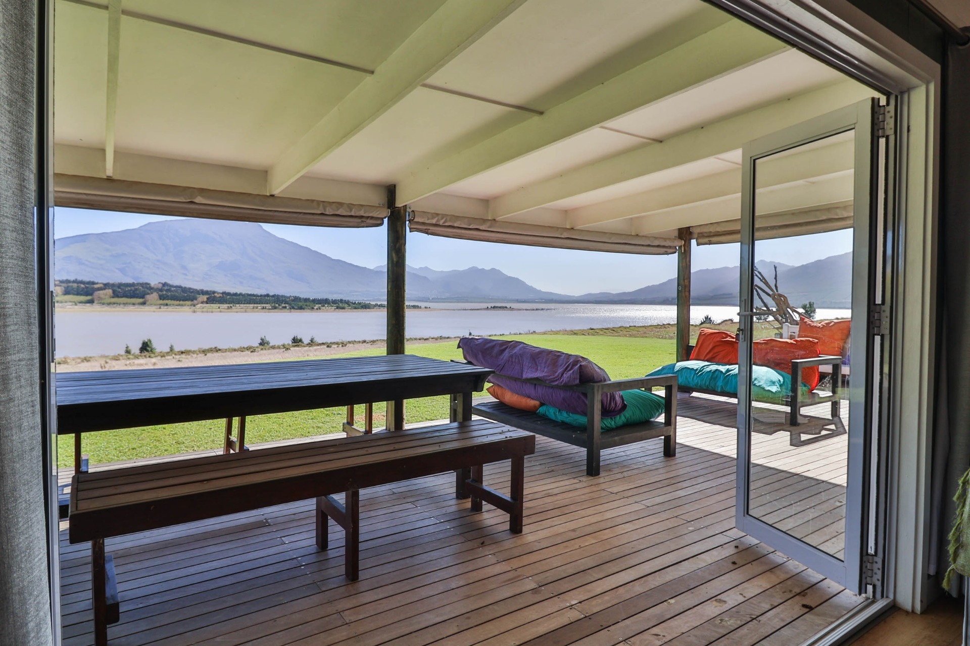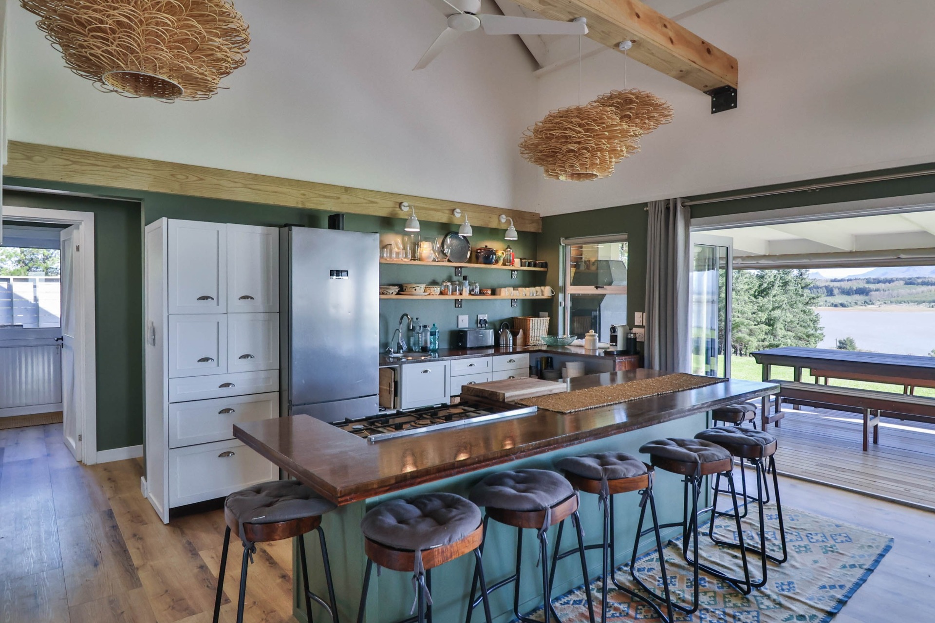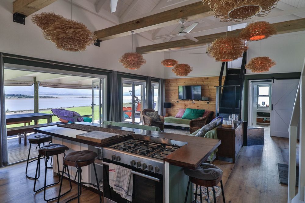 Step inside to discover expansive living spaces adorned with contemporary furnishings and elegant decor. The open-plan layout includes a fully-equipped kitchen, and a cozy lounge with panoramic stacker doors overlooking the dam.
