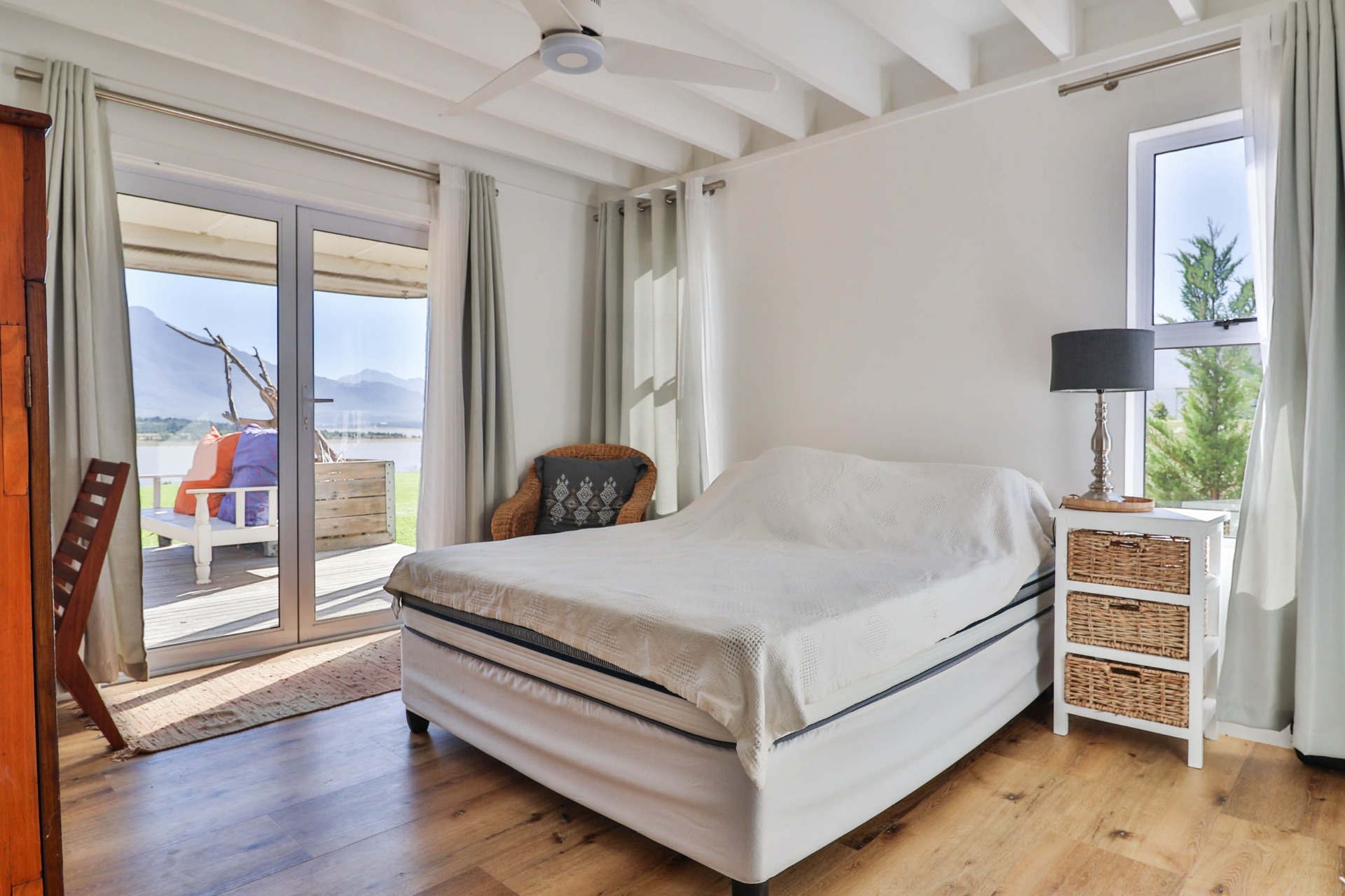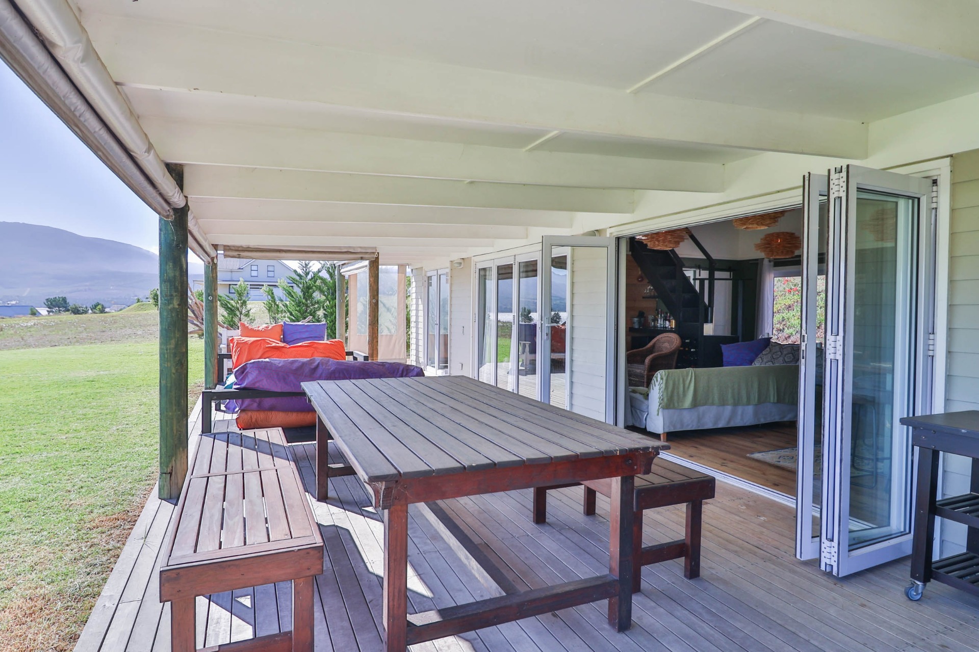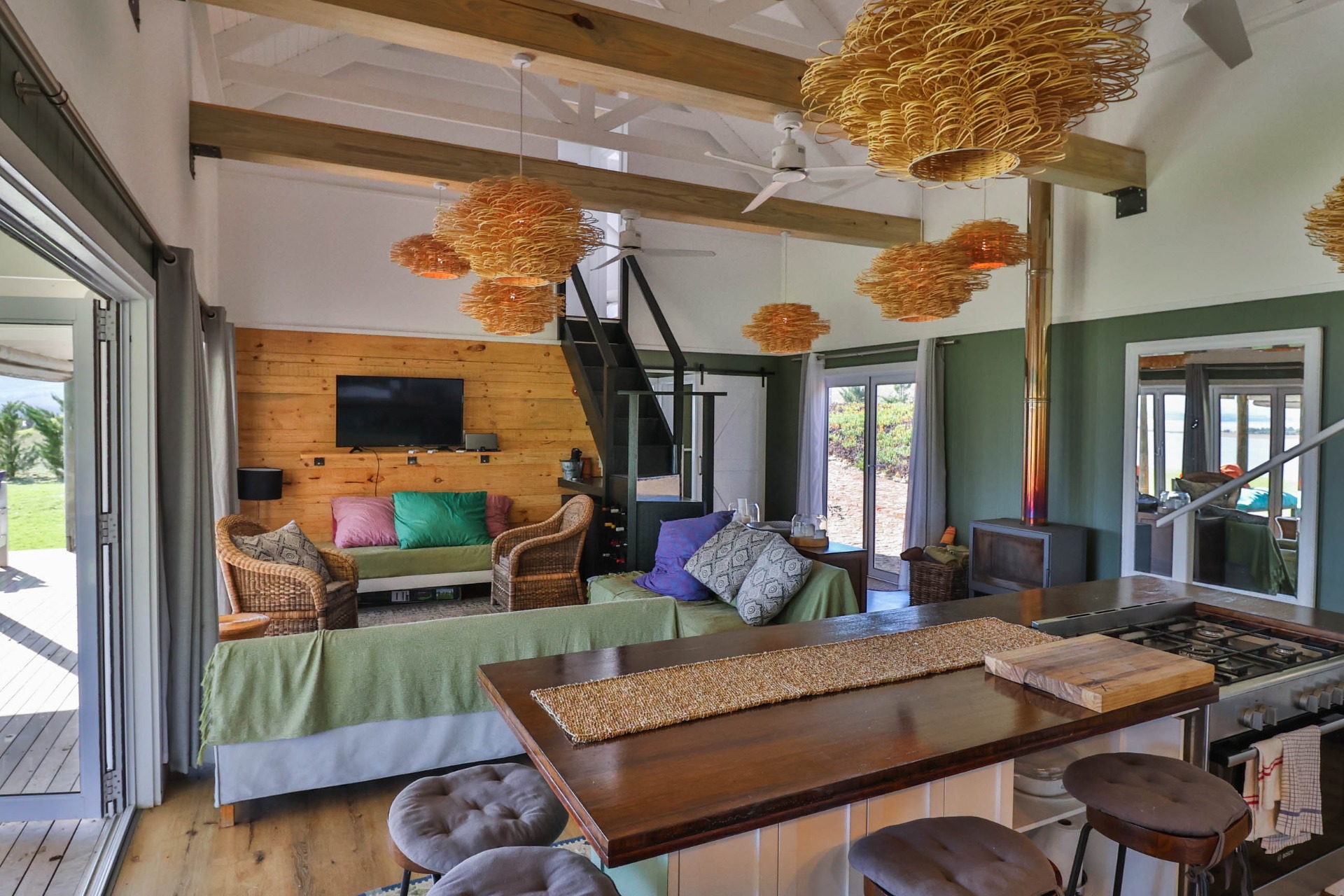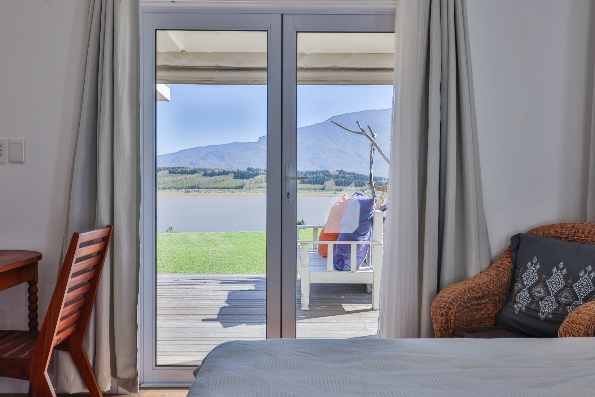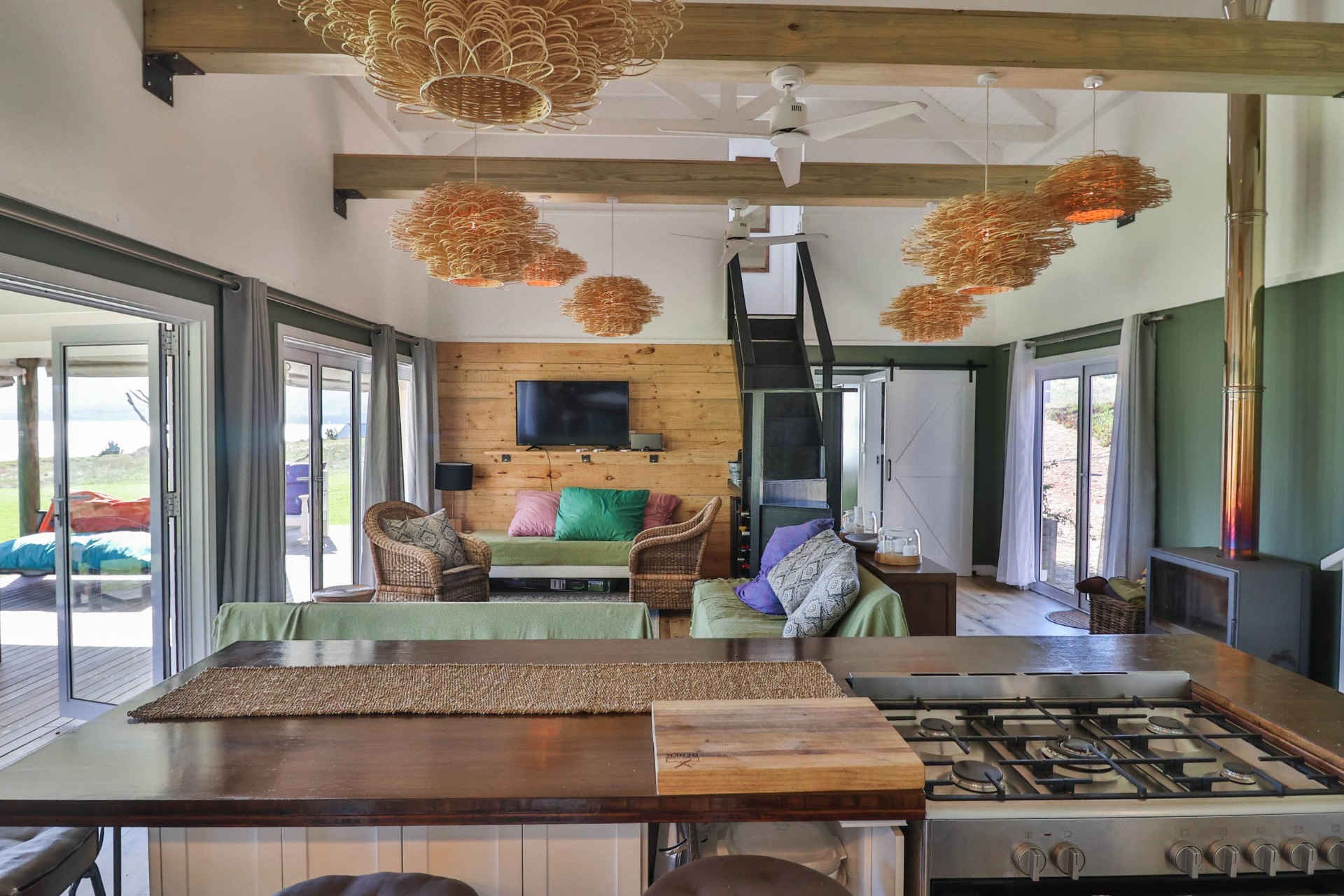 Step inside to discover expansive living spaces adorned with contemporary furnishings and elegant decor. The open-plan layout includes a fully-equipped kitchen, and a cozy lounge with panoramic stacker doors overlooking the dam.