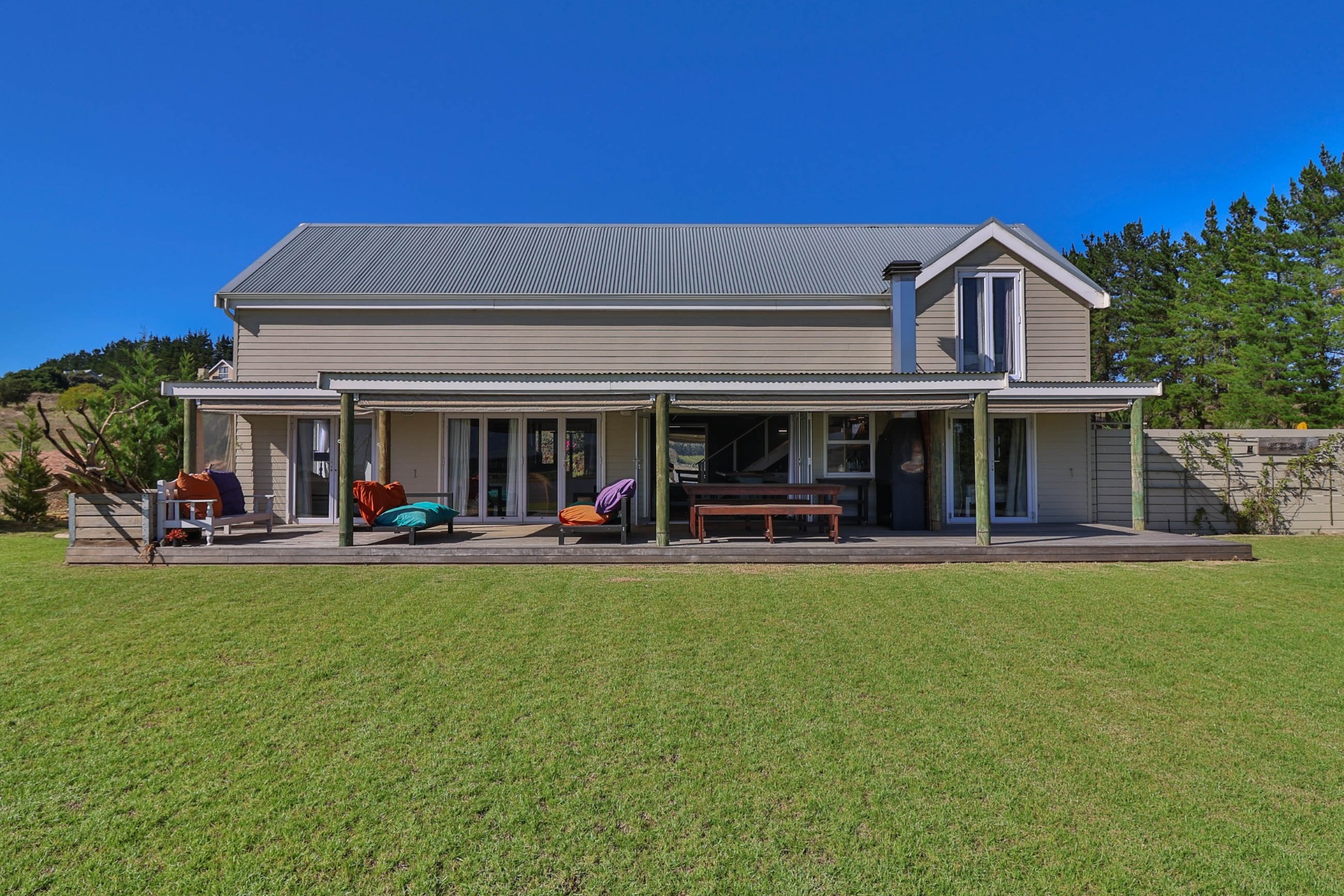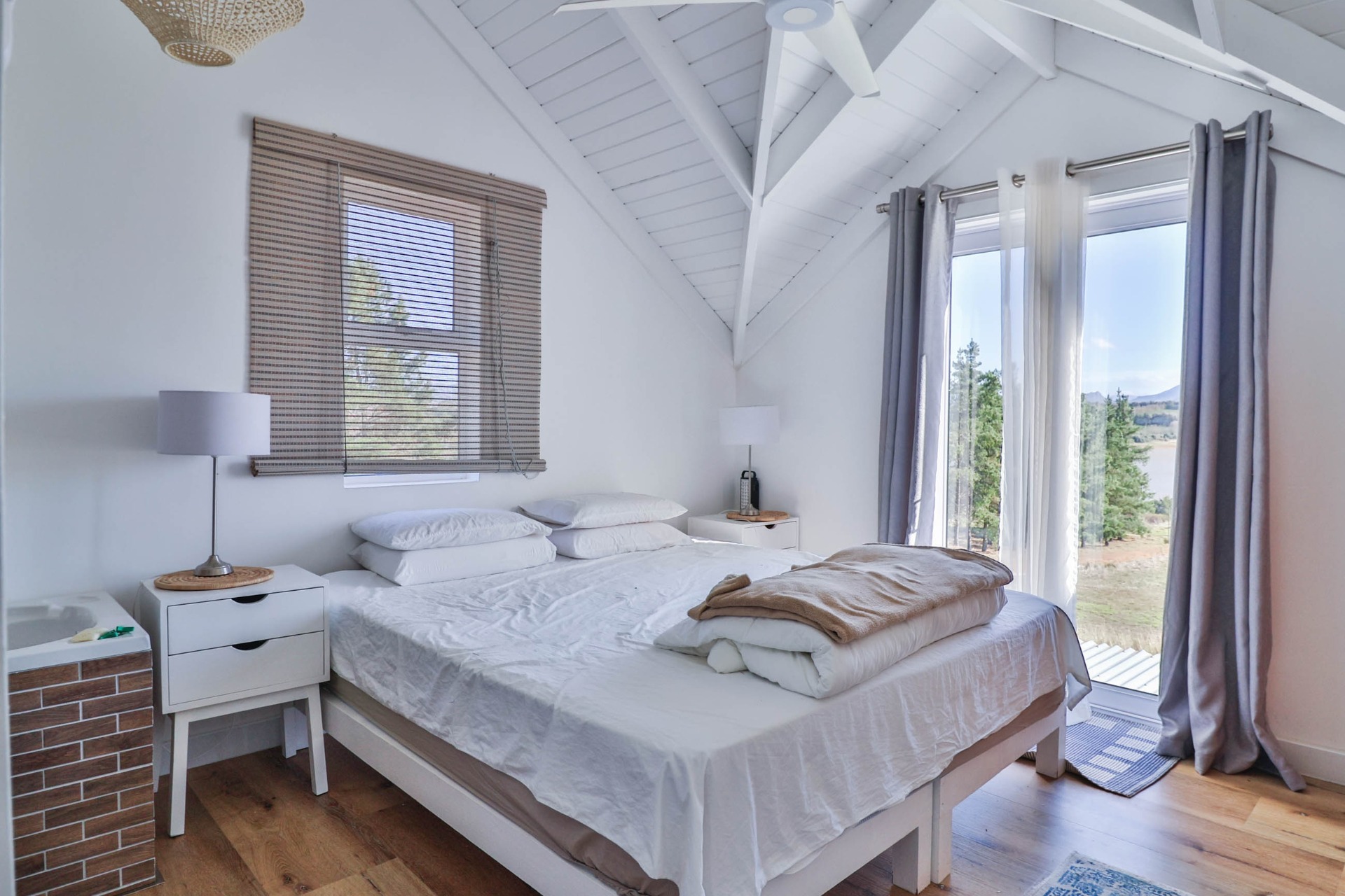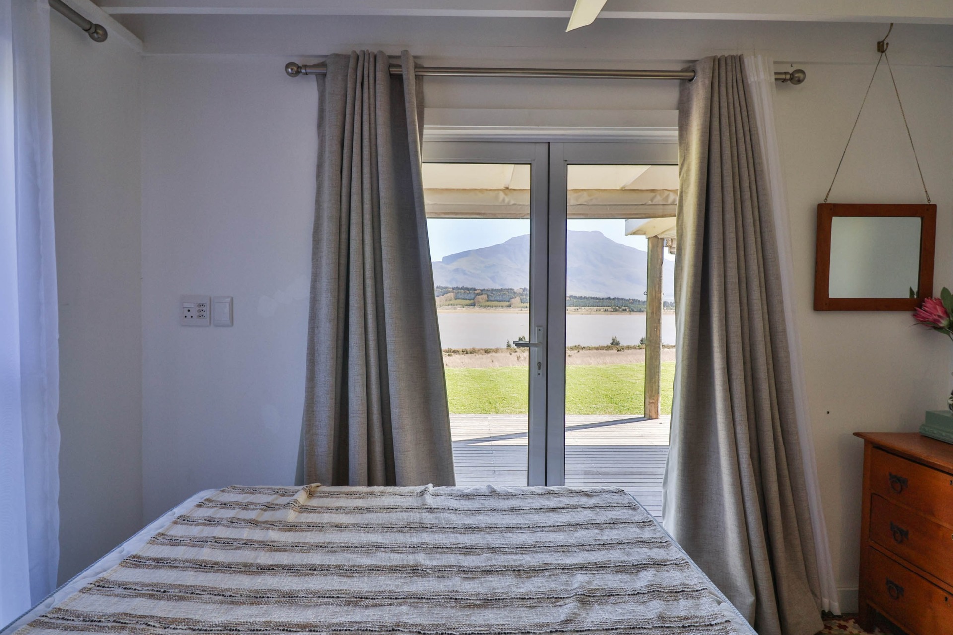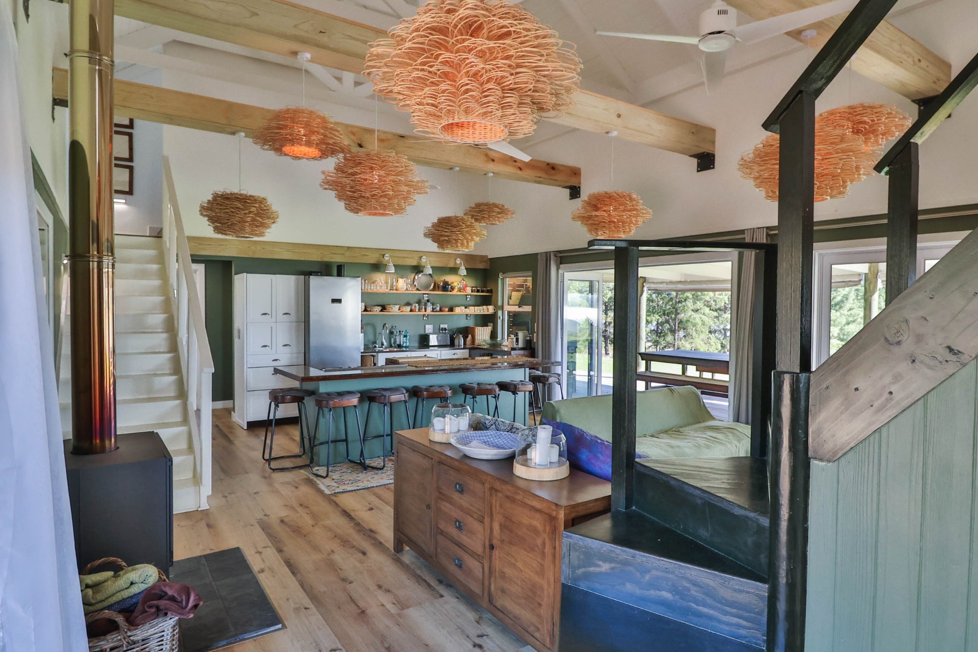 Step inside to discover expansive living spaces adorned with contemporary furnishings and elegant decor. The open-plan layout includes a fully-equipped kitchen, and a cozy lounge with panoramic stacker doors overlooking the dam.