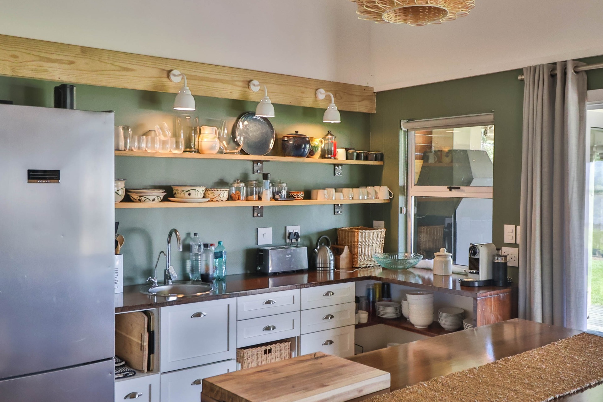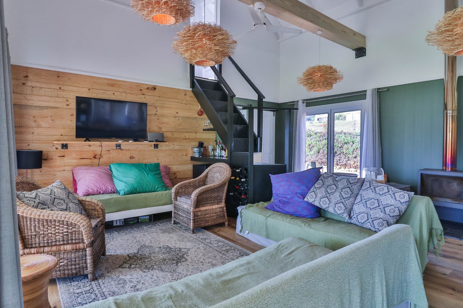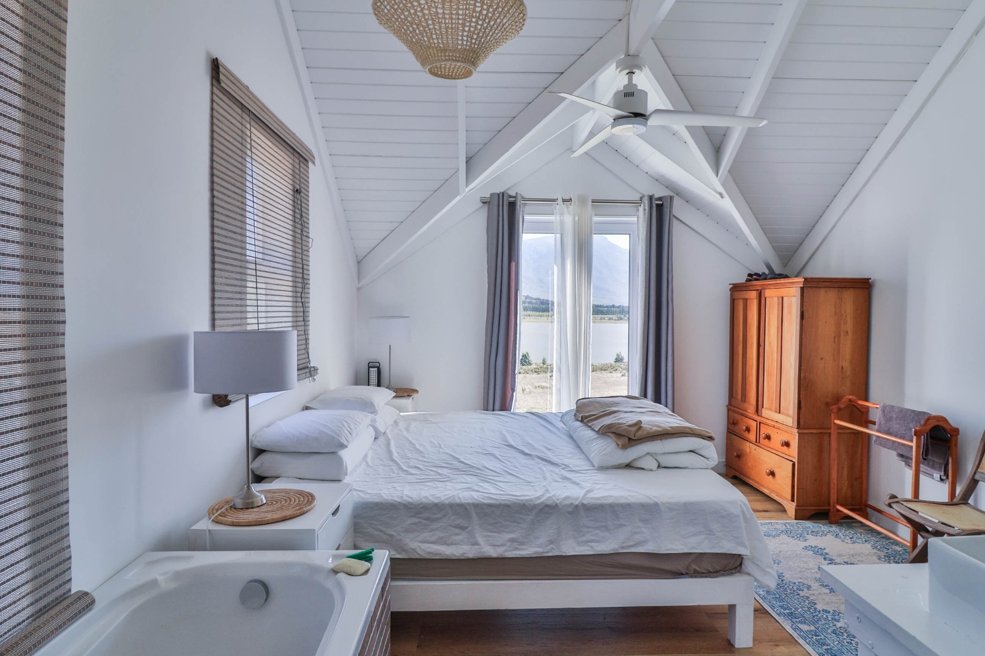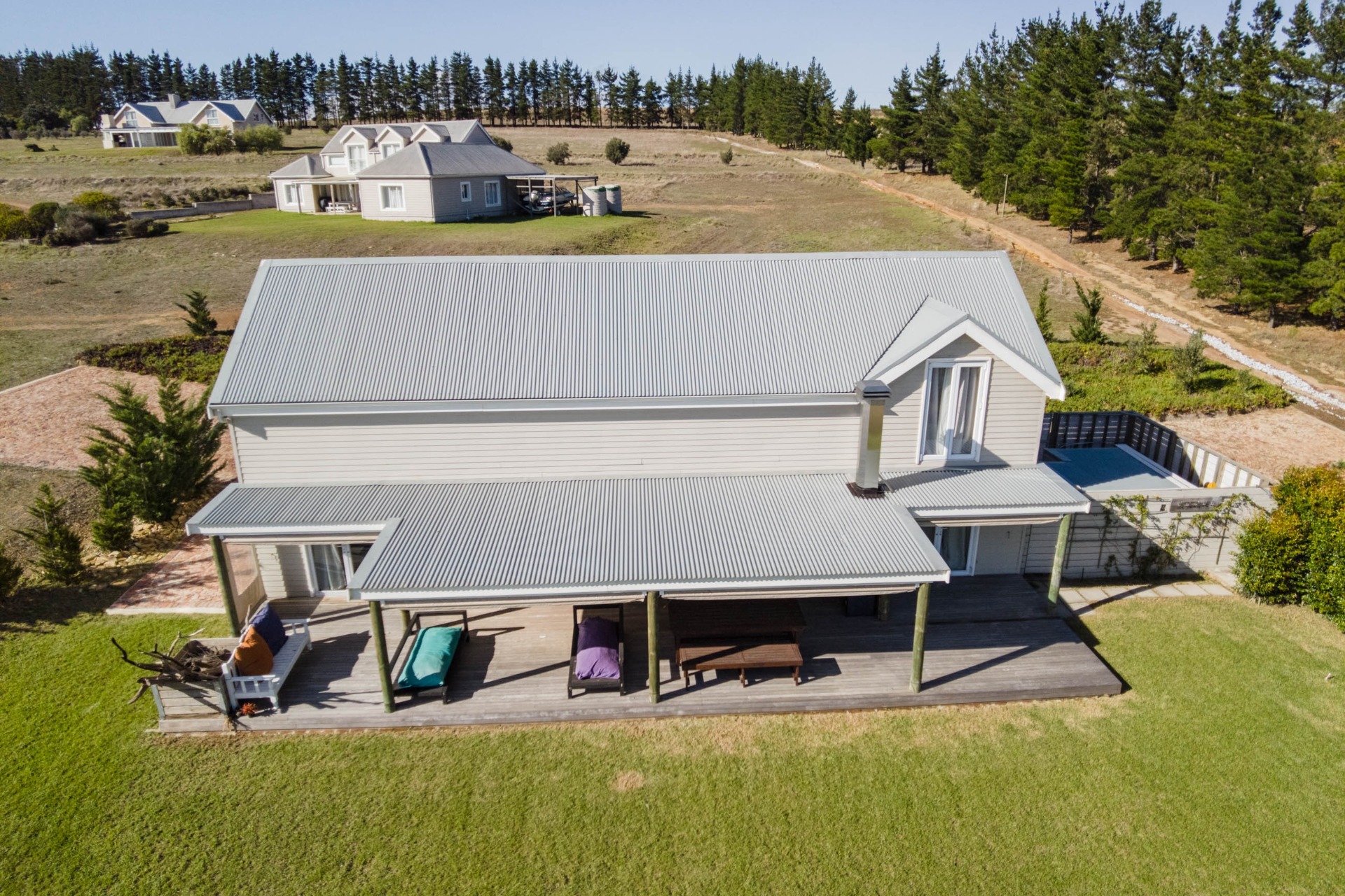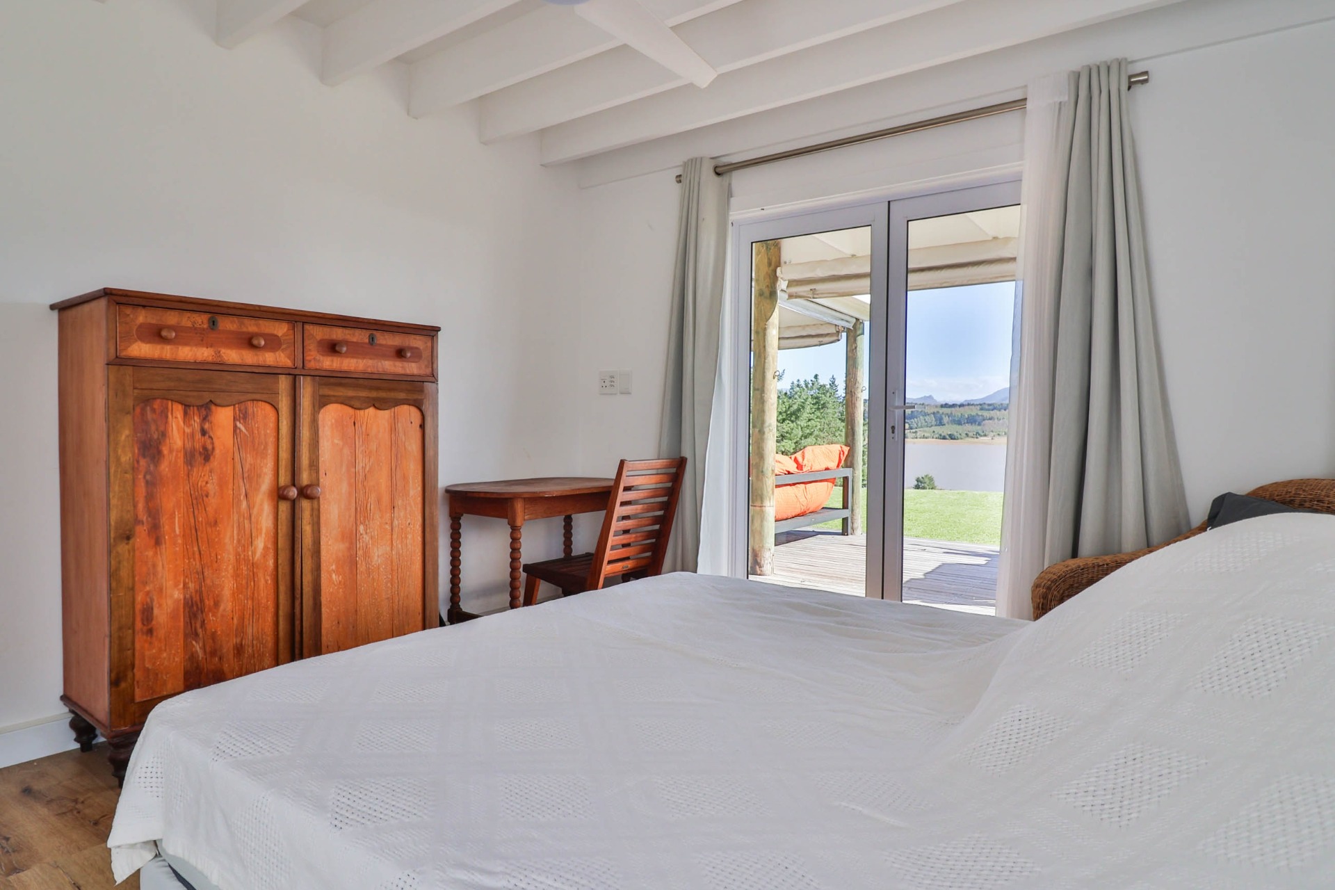 Step inside to discover expansive living spaces adorned with contemporary furnishings and elegant decor. The open-plan layout includes a fully-equipped kitchen, and a cozy lounge with panoramic stacker doors overlooking the dam.