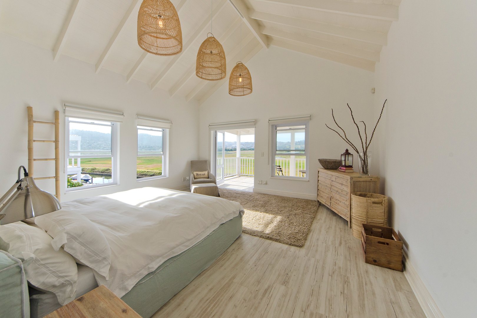 A calming sense of space and expansive water views are a key feature of the home. The spacious open-plan lounge and dining area feature glass stacking doors on two sides, seamlessly connecting to the covered north and east facing patios— perfect for year-round entertaining while enjoying uninterrupted deep-water canal and serene wetland views of Knysna’s picturesque lagoon.