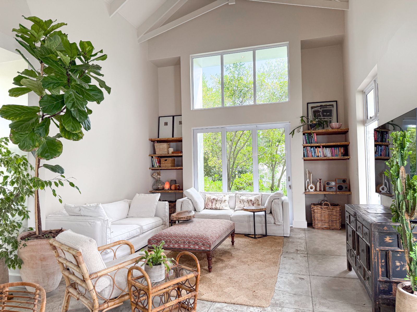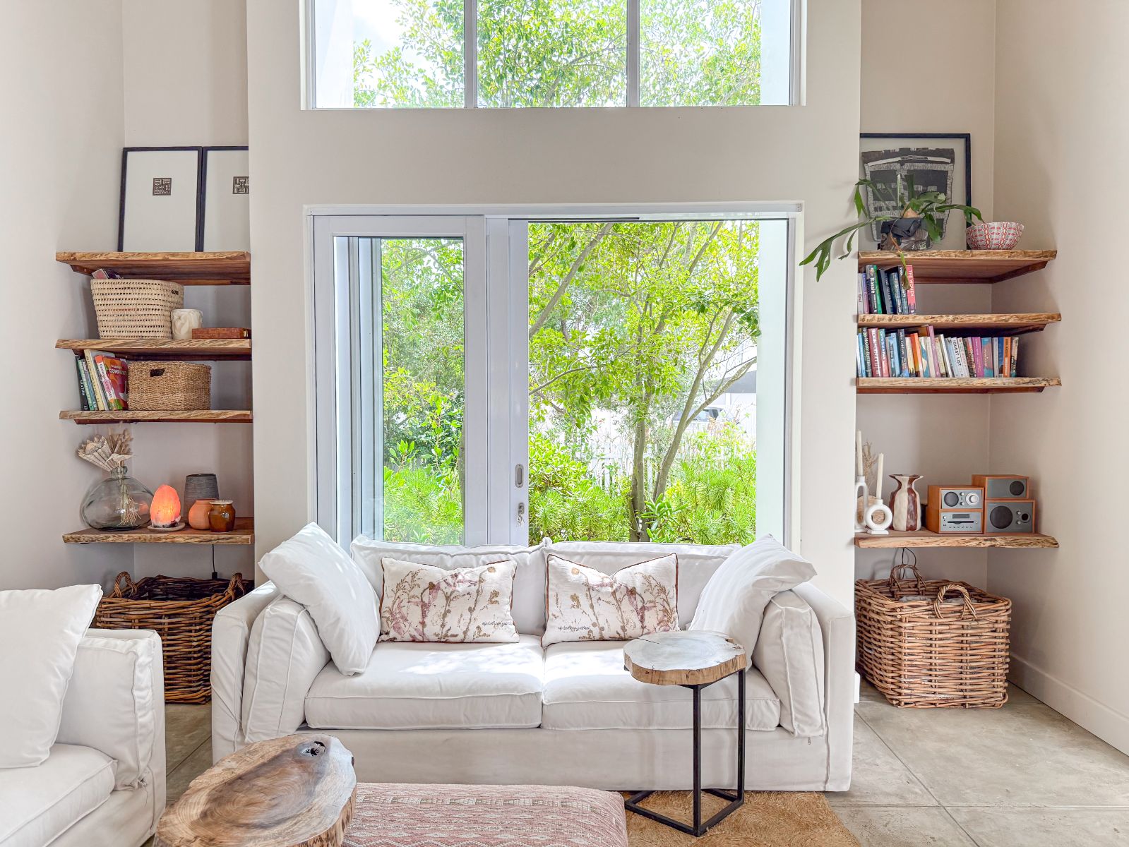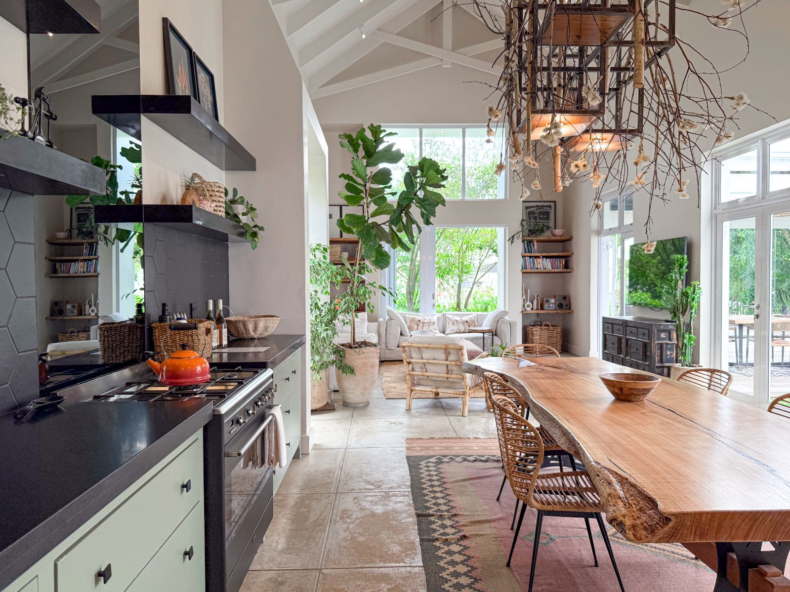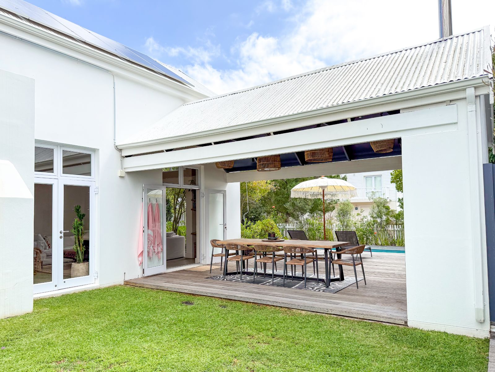 The bright and airy open-plan kitchen, dining, and living space opens through French doors onto a lush lawn and inviting entertainment area. A three-panel sliding door in the lounge floods the space with natural light and connects effortlessly to the outdoors. The kitchen is both stylish and functional, complete with a separate scullery for extra storage.