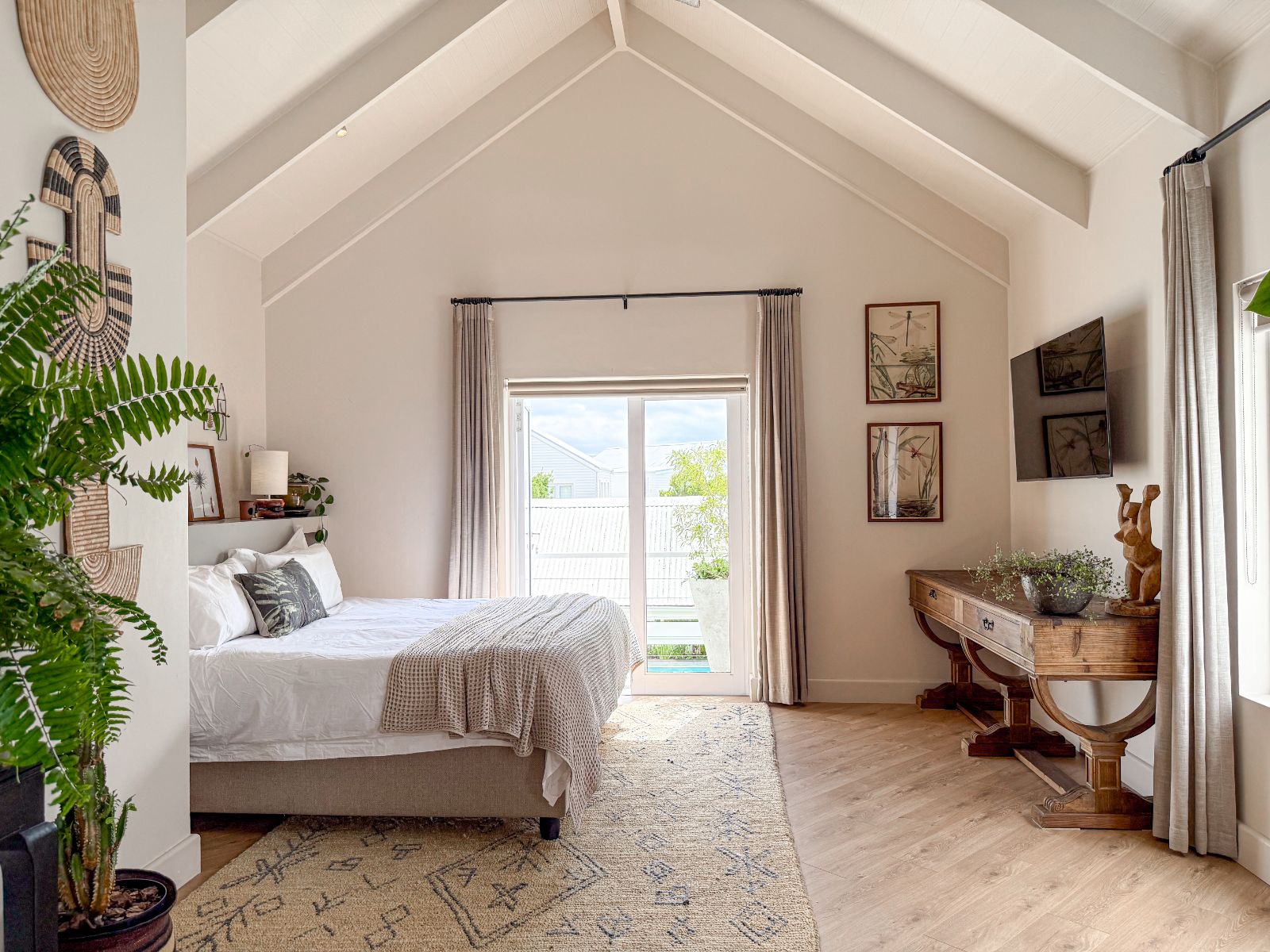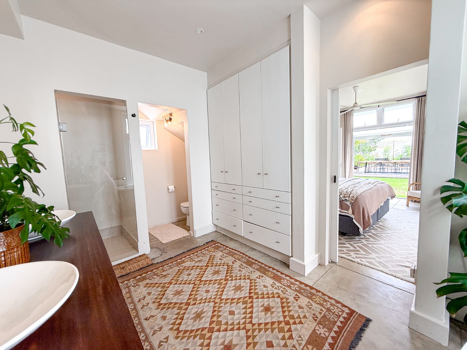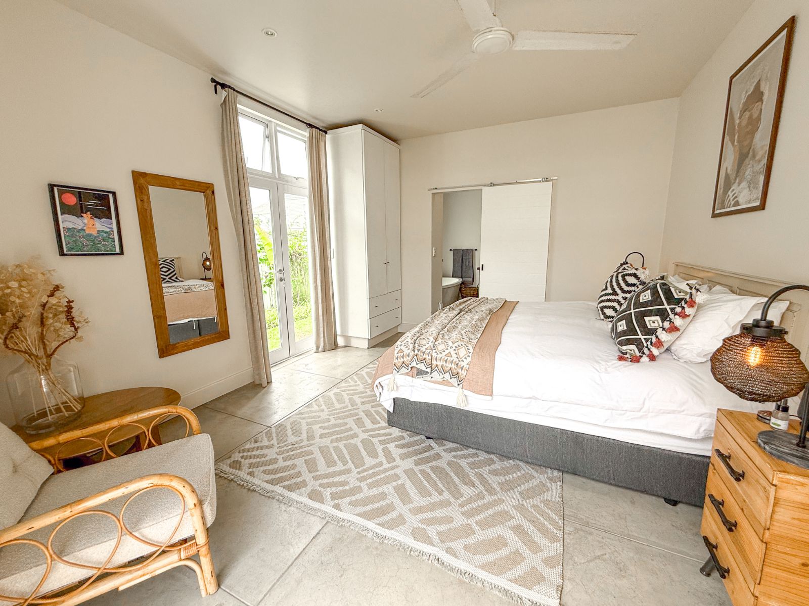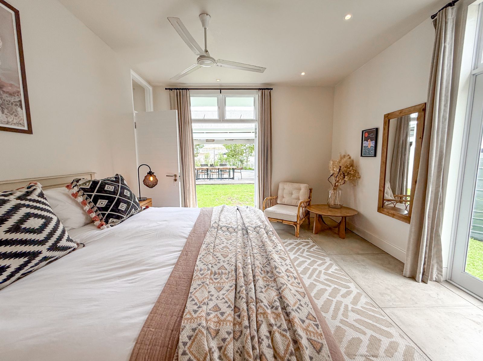 This home offers three spacious bedrooms, each with its own ensuite bathroom. The main suite is a private retreat with a walk-in closet and its own lounge—perfect as a nursery, extra bedroom, or home office. The second bedroom features two sets of French doors that open onto the garden, bringing in fresh air and tranquility. The third bedroom, with its own entrance, is ideal for guests or extended family.