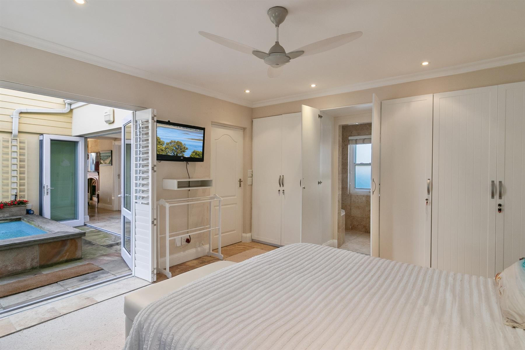 The ground-floor main suite opens onto the pool area for added privacy and serenity. Two upstairs bedrooms are north-facing with air conditioning, and all rooms have ceiling fans. The flatlet has its own entrance, kitchenette, and ensuite—perfect for income potential or work-from-home.