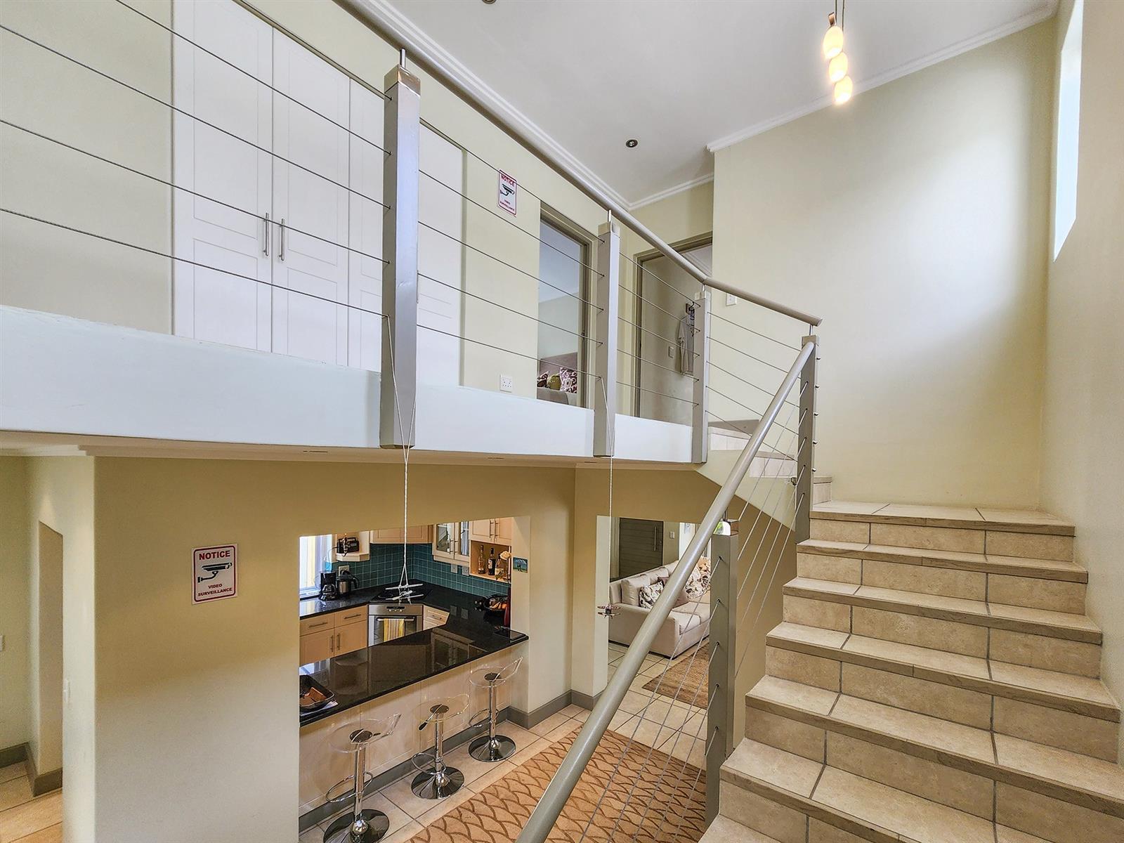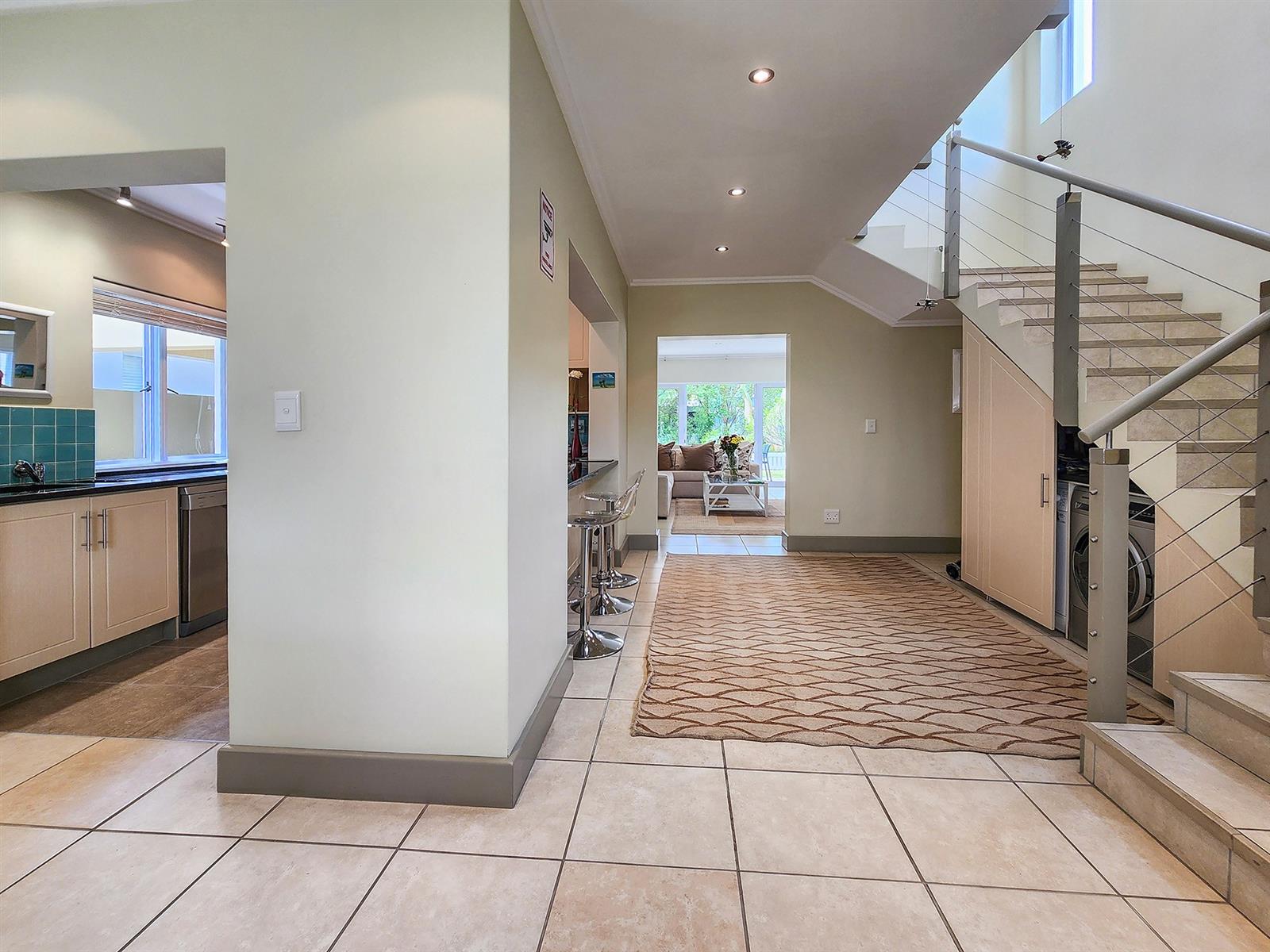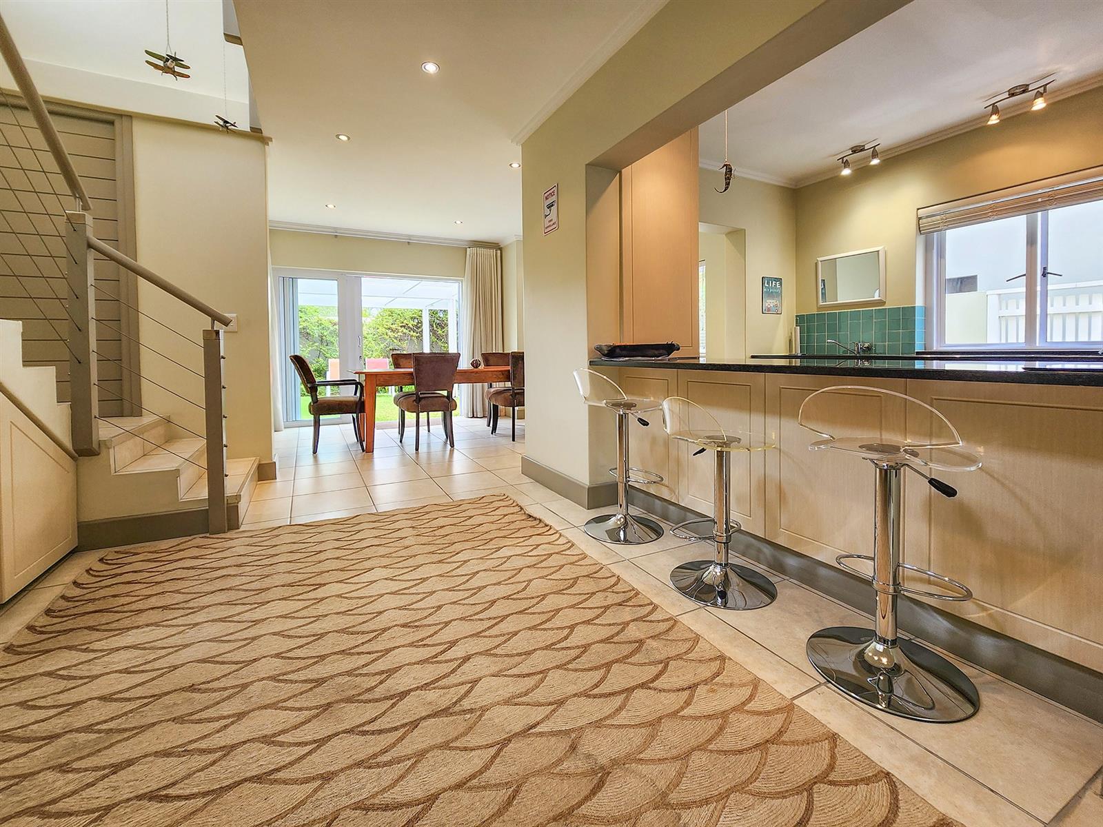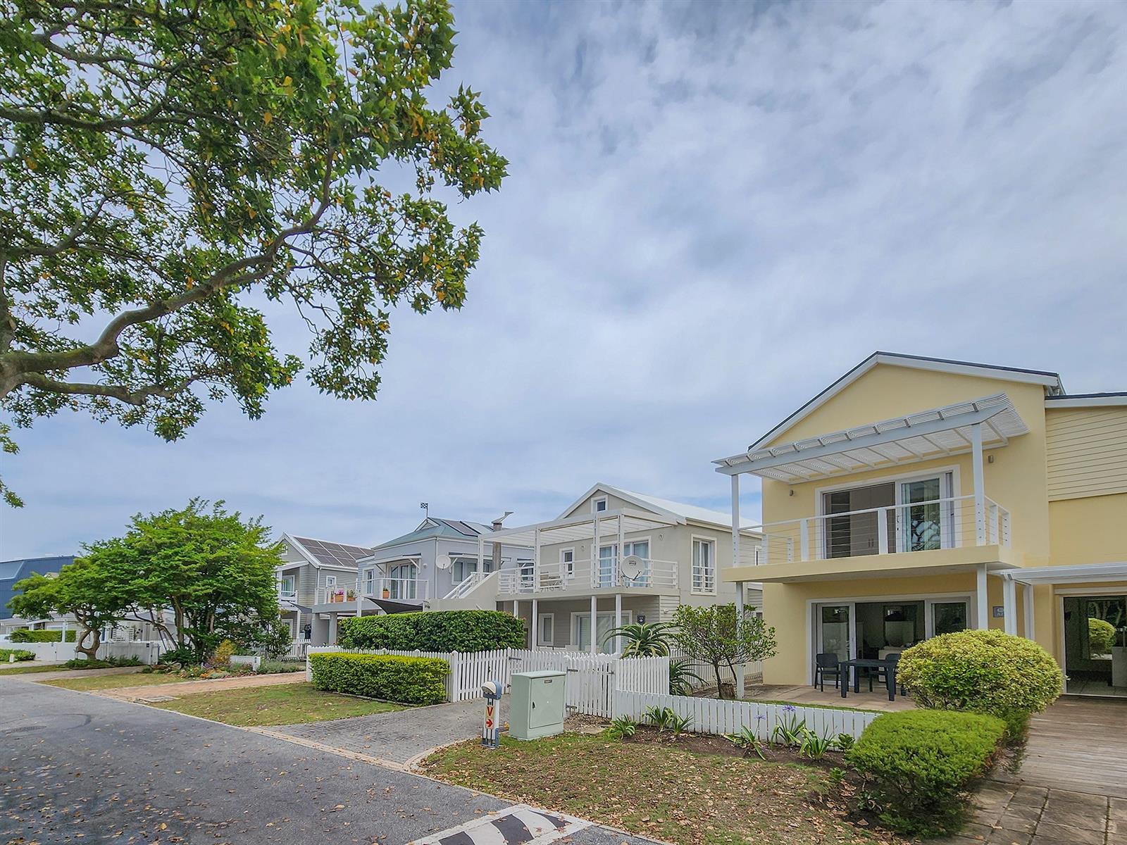 Situated on Thesen Island, this stylish unit offers three upstairs en-suite bedrooms and an open-plan lounge, dining room, and kitchen on the lower level.
