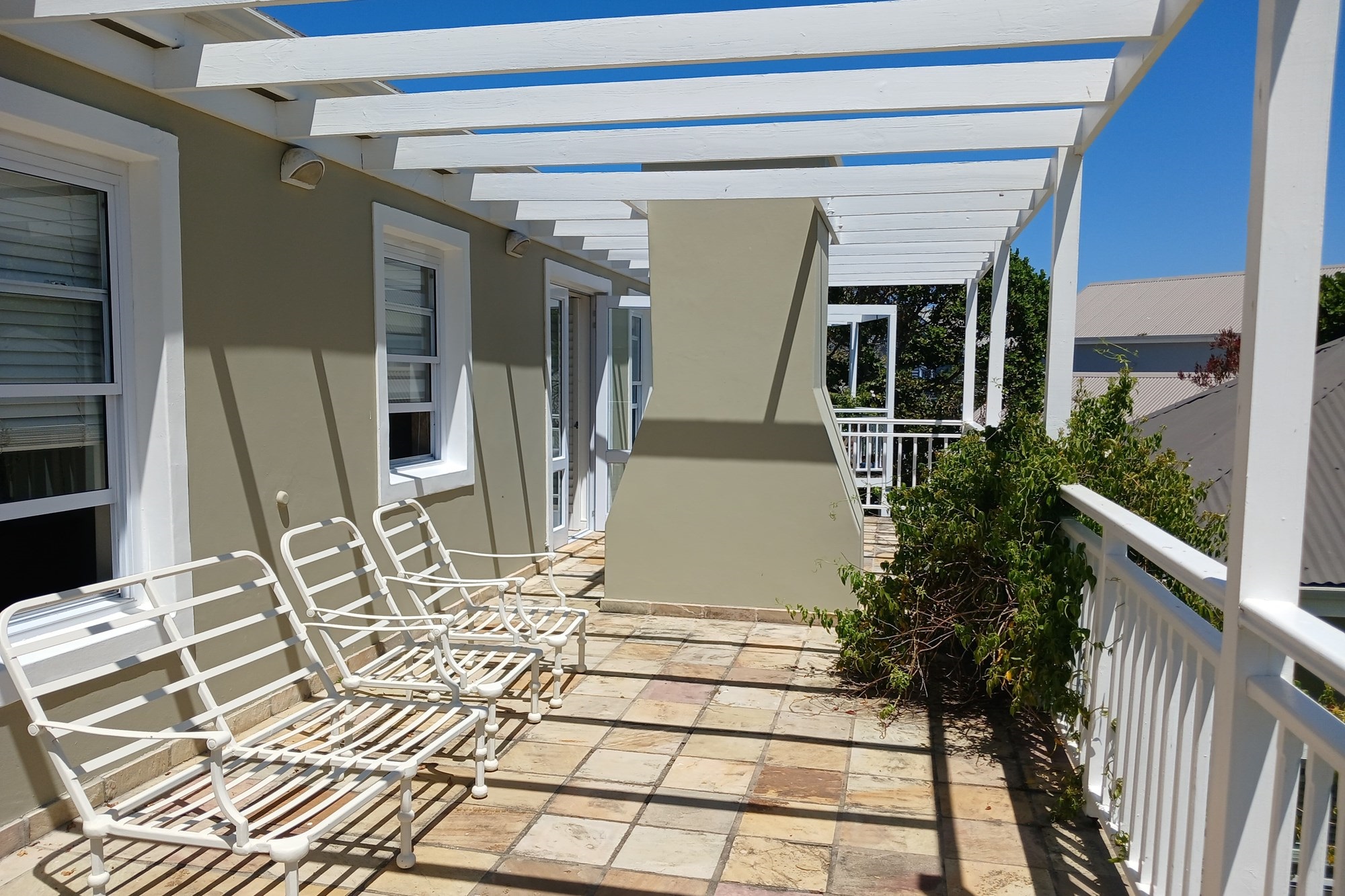 Upstairs comprises three spacious bedrooms with generous cupboard space, sharing a full family bathroom. Two bedrooms open onto a sunny deck with loungers, creating a calm retreat for downtime.