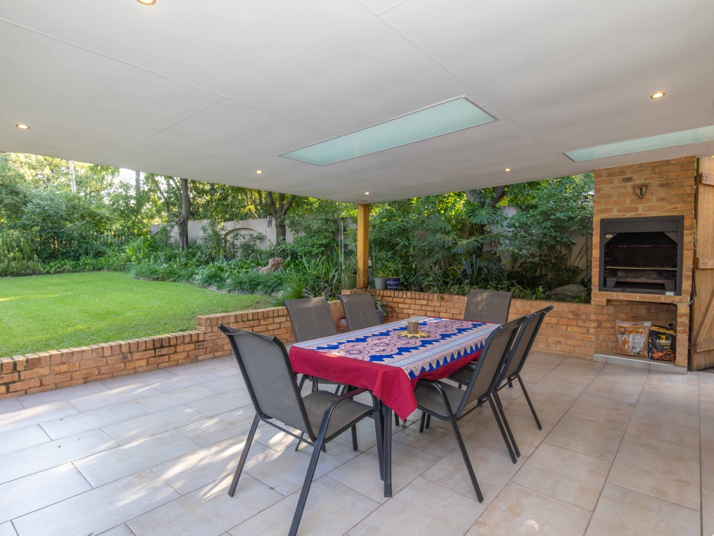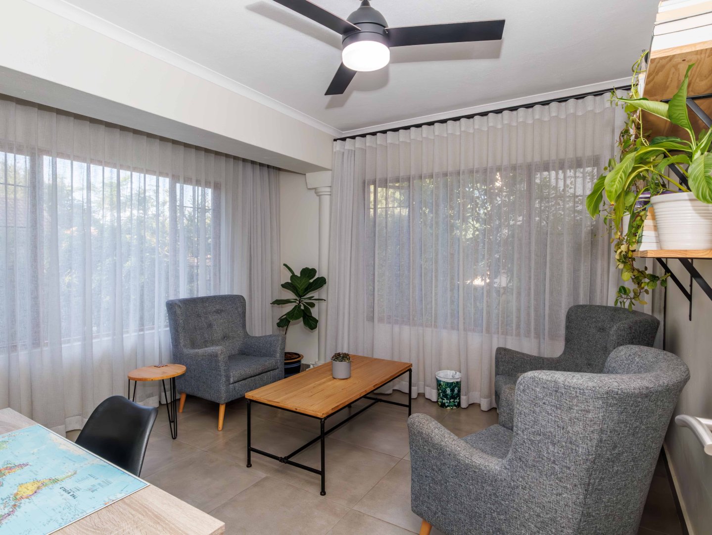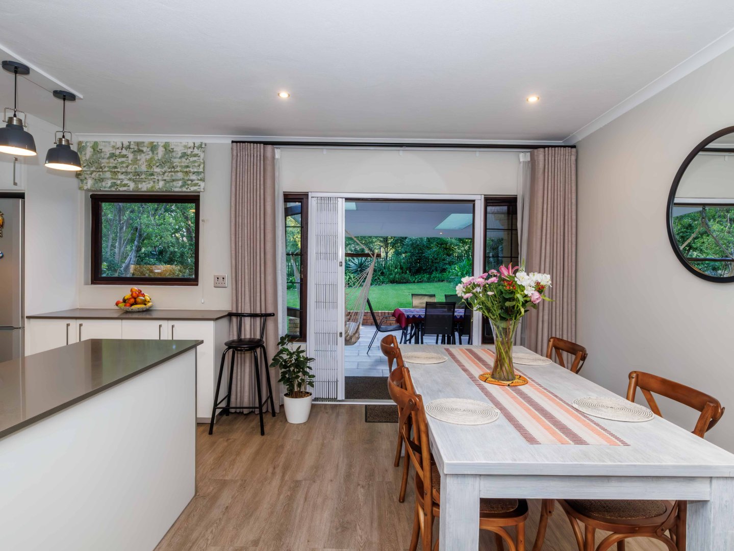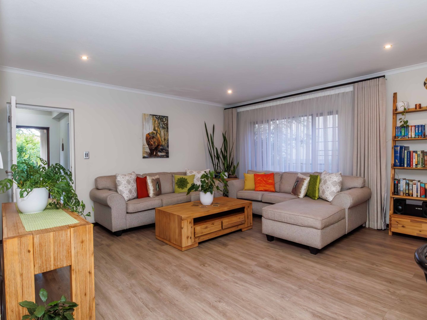 Stylish large lounge with dining room flowing onto large covered patio overlooking landscaped fully irrigated indigenous garden that's bird and butterfly friendly.