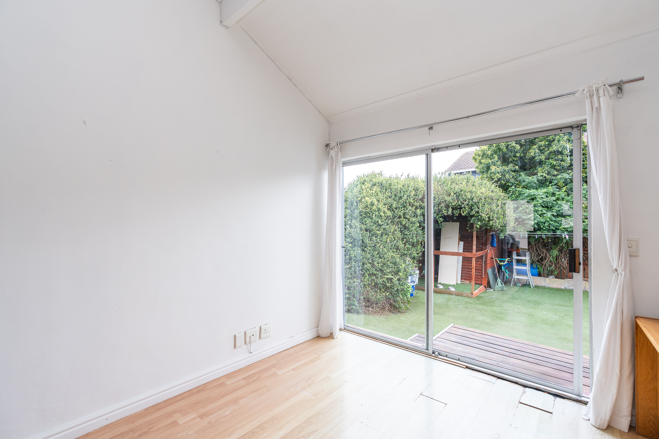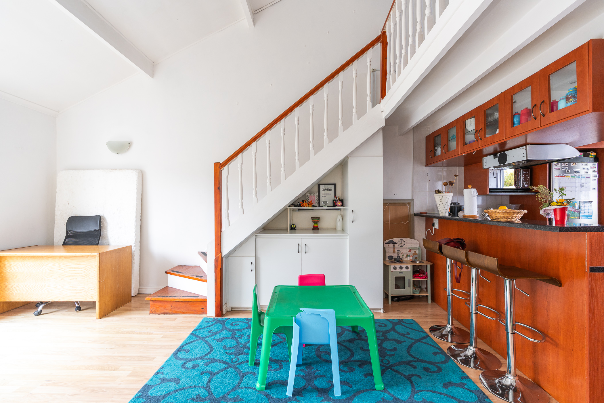 Upon entering, you'll find a fully equipped kitchen that flows into the open plan living area. The living room opens via a sliding door to the garden, creating a perfect indoor-outdoor living space. The fully equipped kitchen includes a built-in oven, stove, hob, breakfast bar, ample cupboard space, and room for a washing machine.