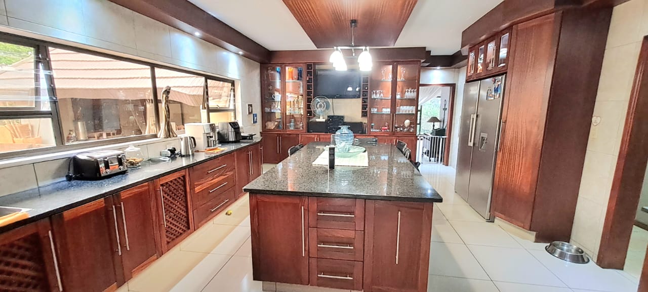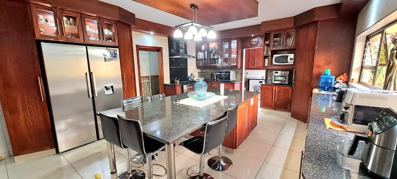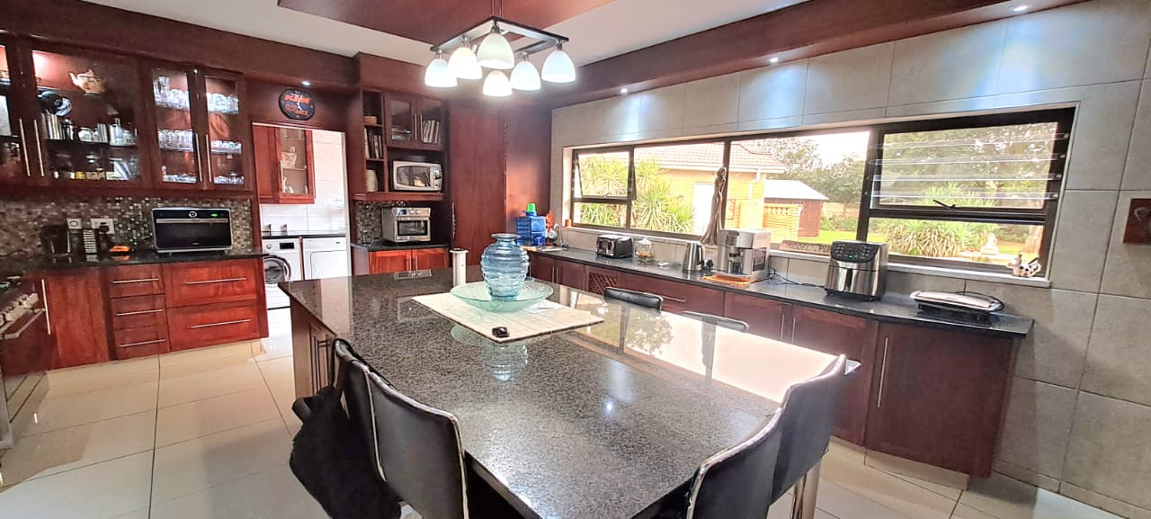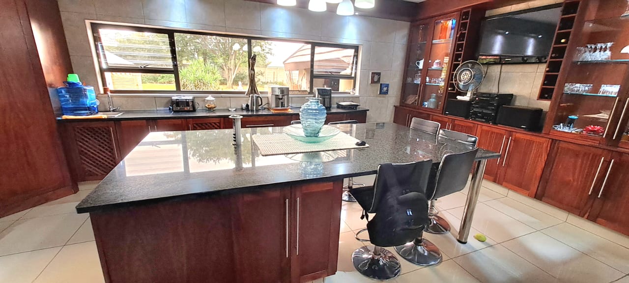 - Gourmet Kitchen: A chef's delight with solid Mahogany cabinets, a massive island (1.3 x 2.7m) that seats 6, and luxurious Rustenburg black granite tops with platinum spangle. Equipped with a 900mm Elba Italian stainless-steel stove, fully programmable gas/electric oven, and a separate scullery that accommodates all your appliances.