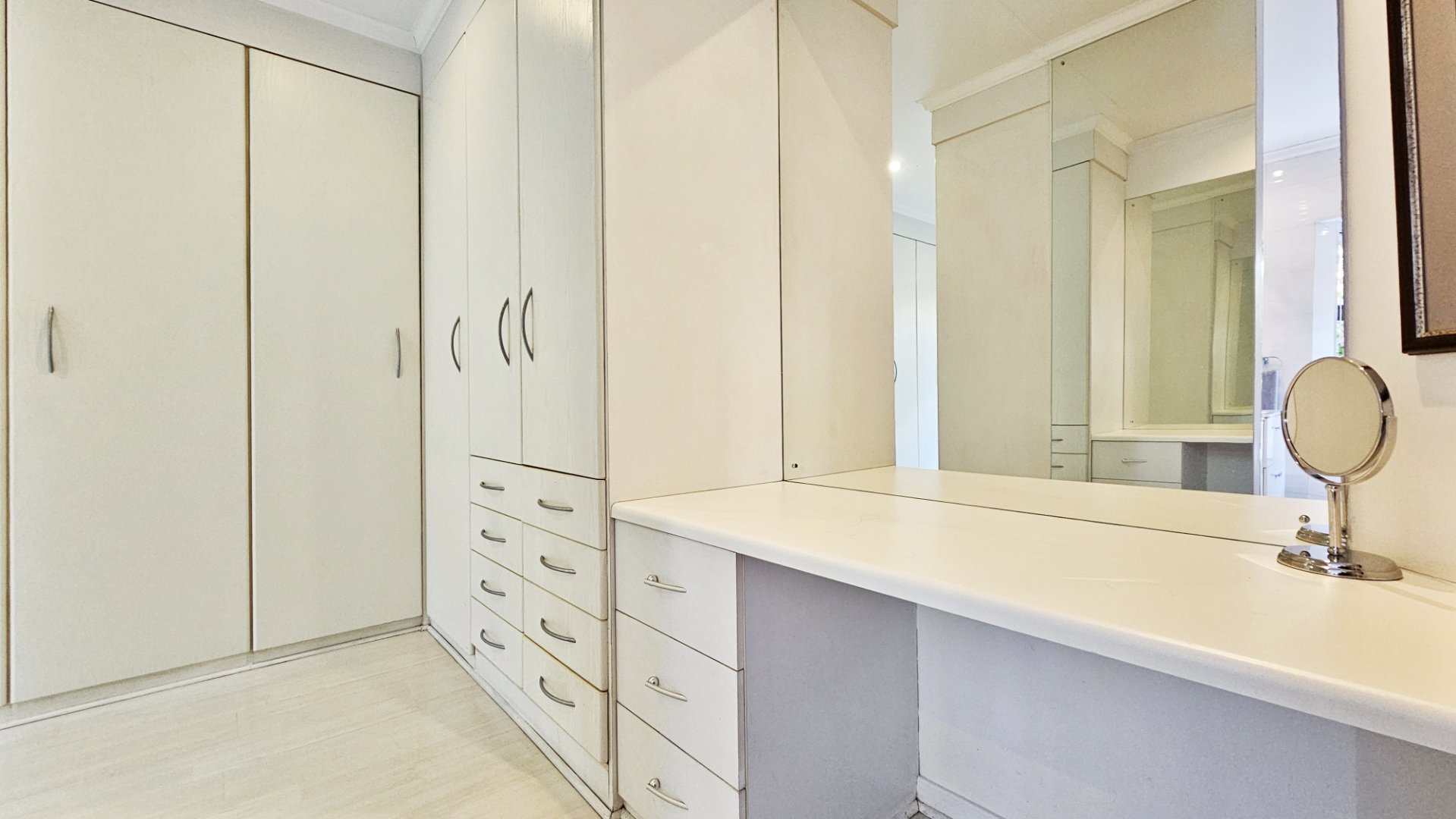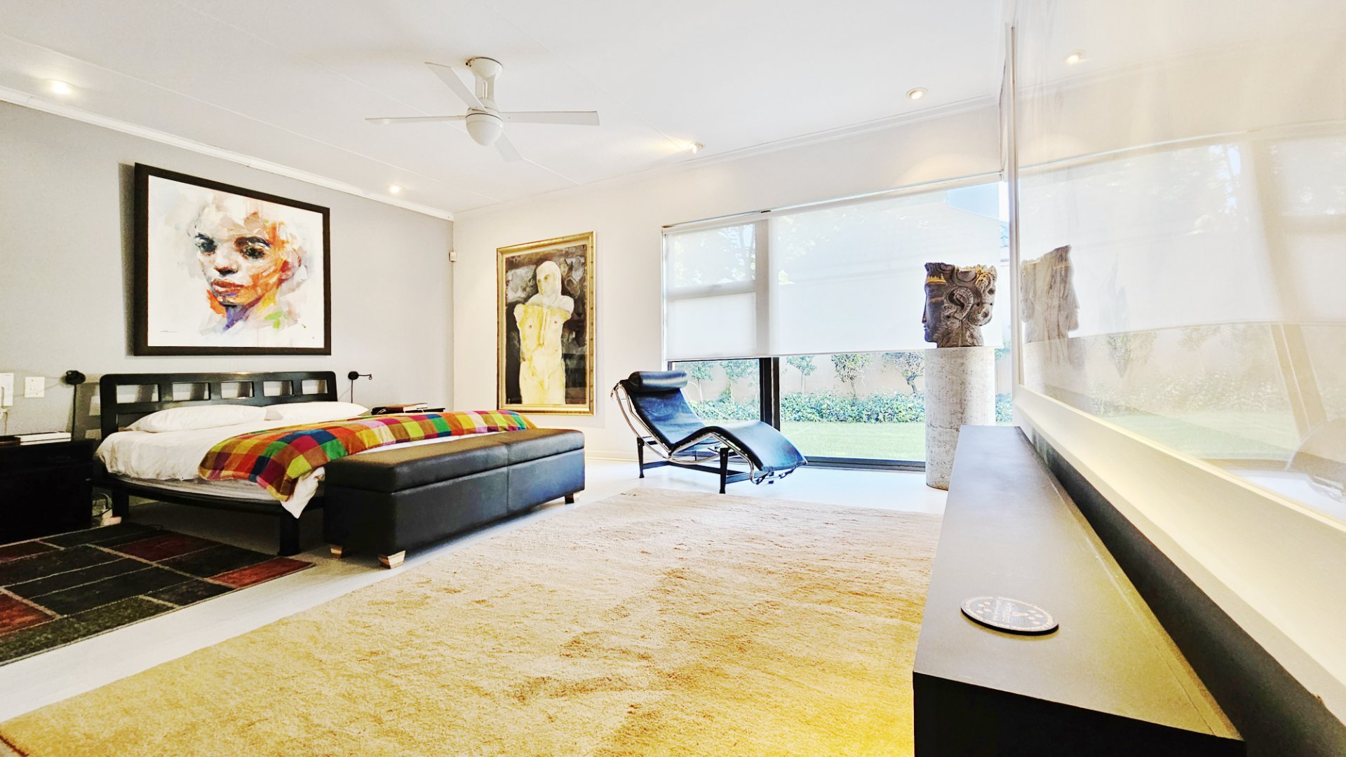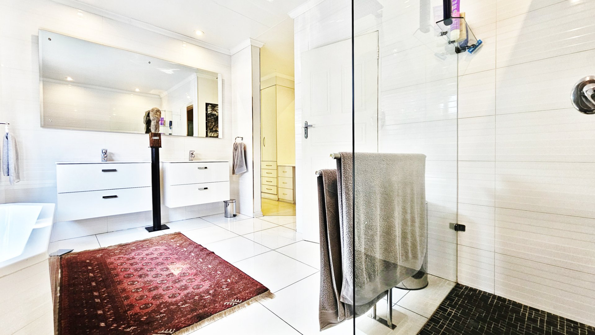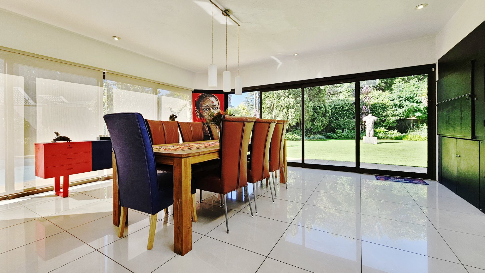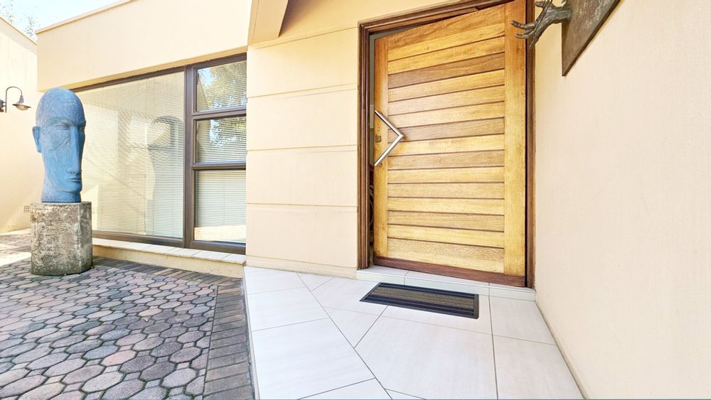 Accommodation flows effortlessly, comprising elegant open-plan living spaces that lead out onto the pool area, with an entertainment room featuring a built-in braai that can be enclosed with aluminium stacker doors, a warm and inviting family room with a gas fireplace, and a lounge / TV room. The kitchen offers timeless finishes, semi-open plan with a separate scullery. An exceptionally large guest bedroom with an en-suite bathroom is situated separately from three additional spacious bedrooms and two superb luxury bathrooms with beautiful views of the private rear garden. The master bedroom boasts generous proportions and an array of stylish wardrobes with a beauty station.