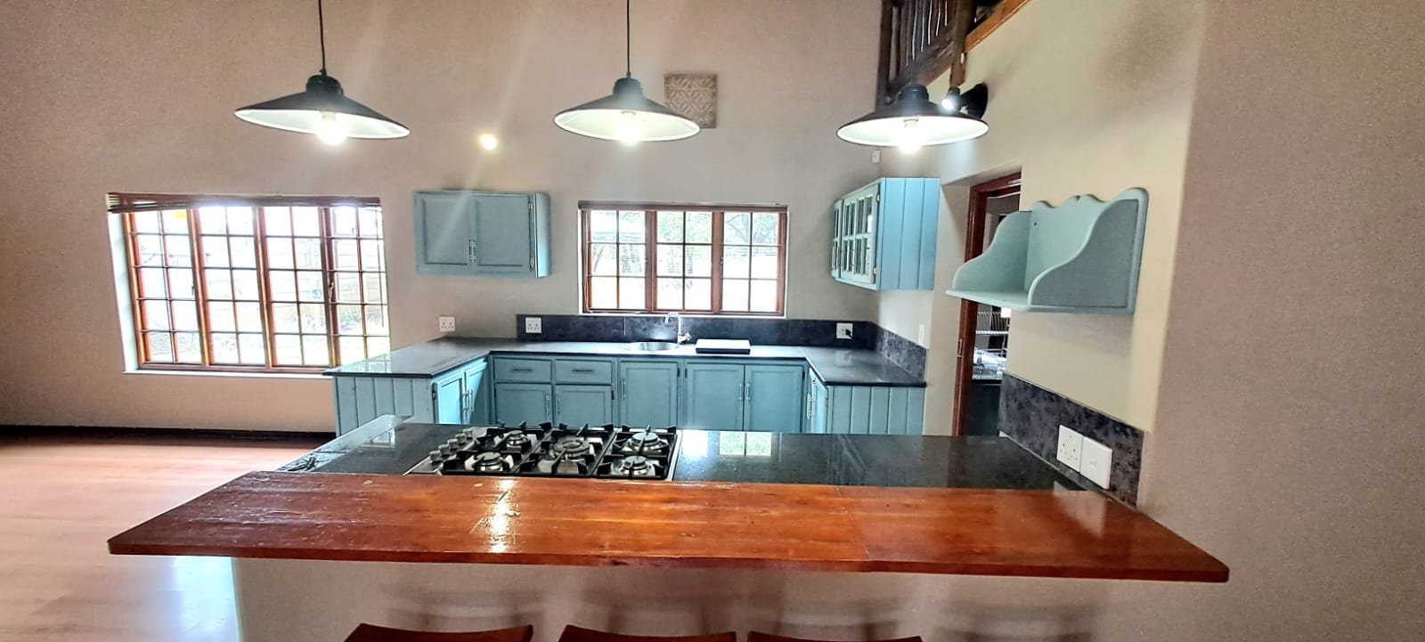 It offers ample cupboard space, granite tops, gas stove with electrical oven.