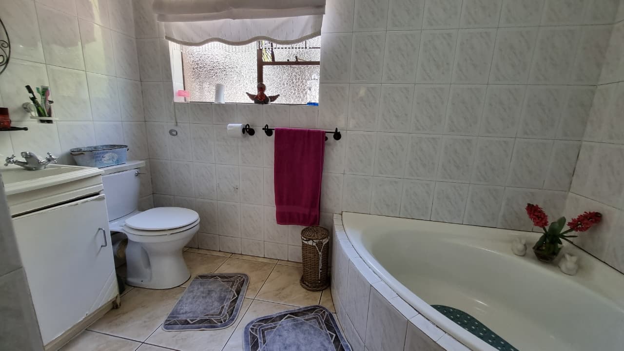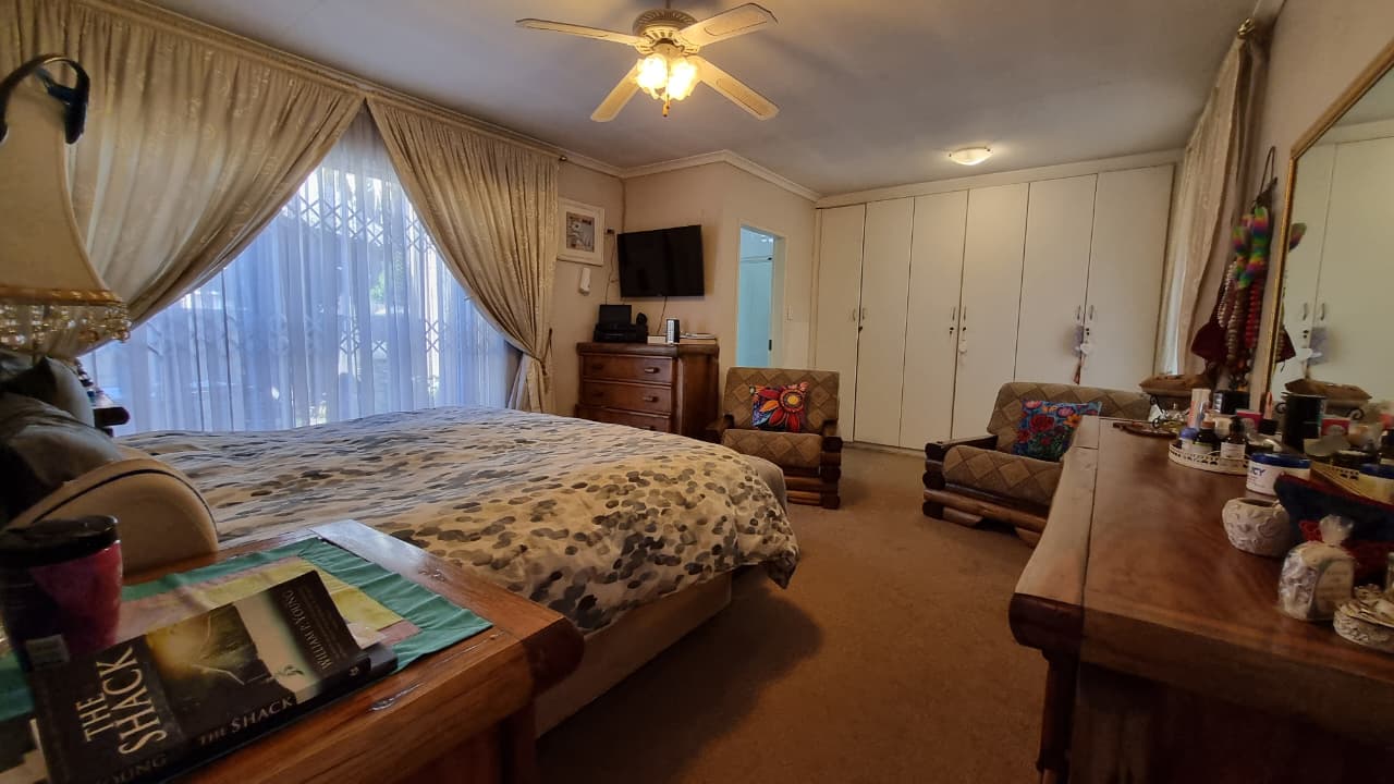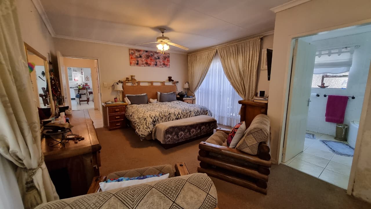 -Main Bedroom: Spacious with tiled floors, large windows, built-in cupboards, and a ceiling fan. The en-suite bathroom includes a bath, shower, basin, and toilet.
